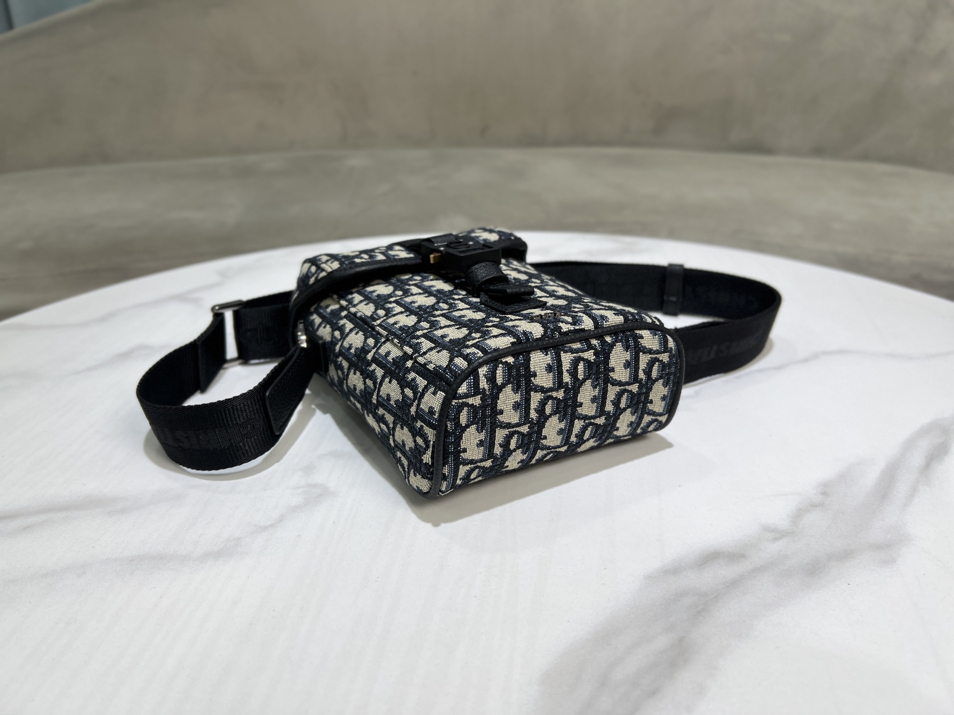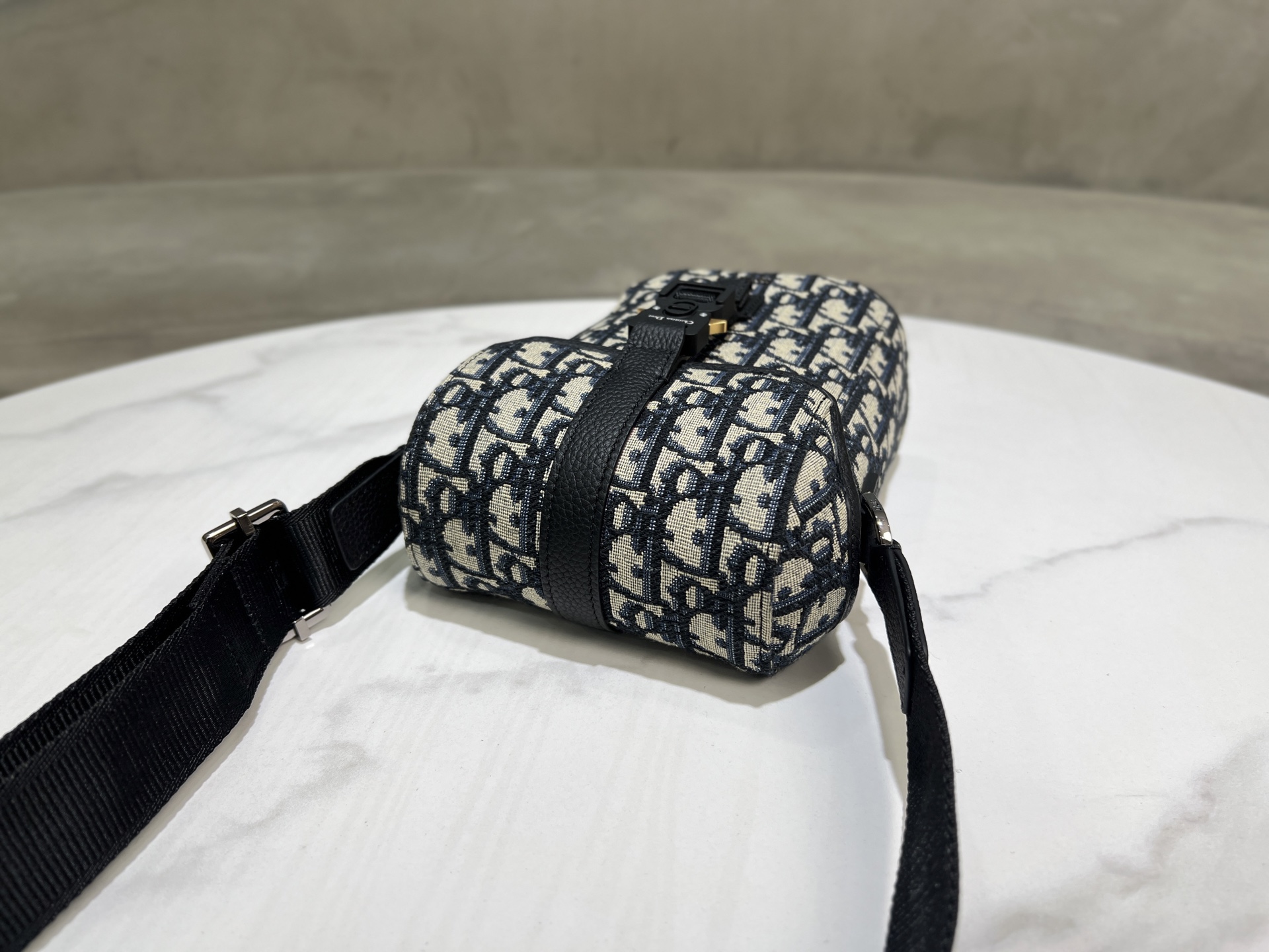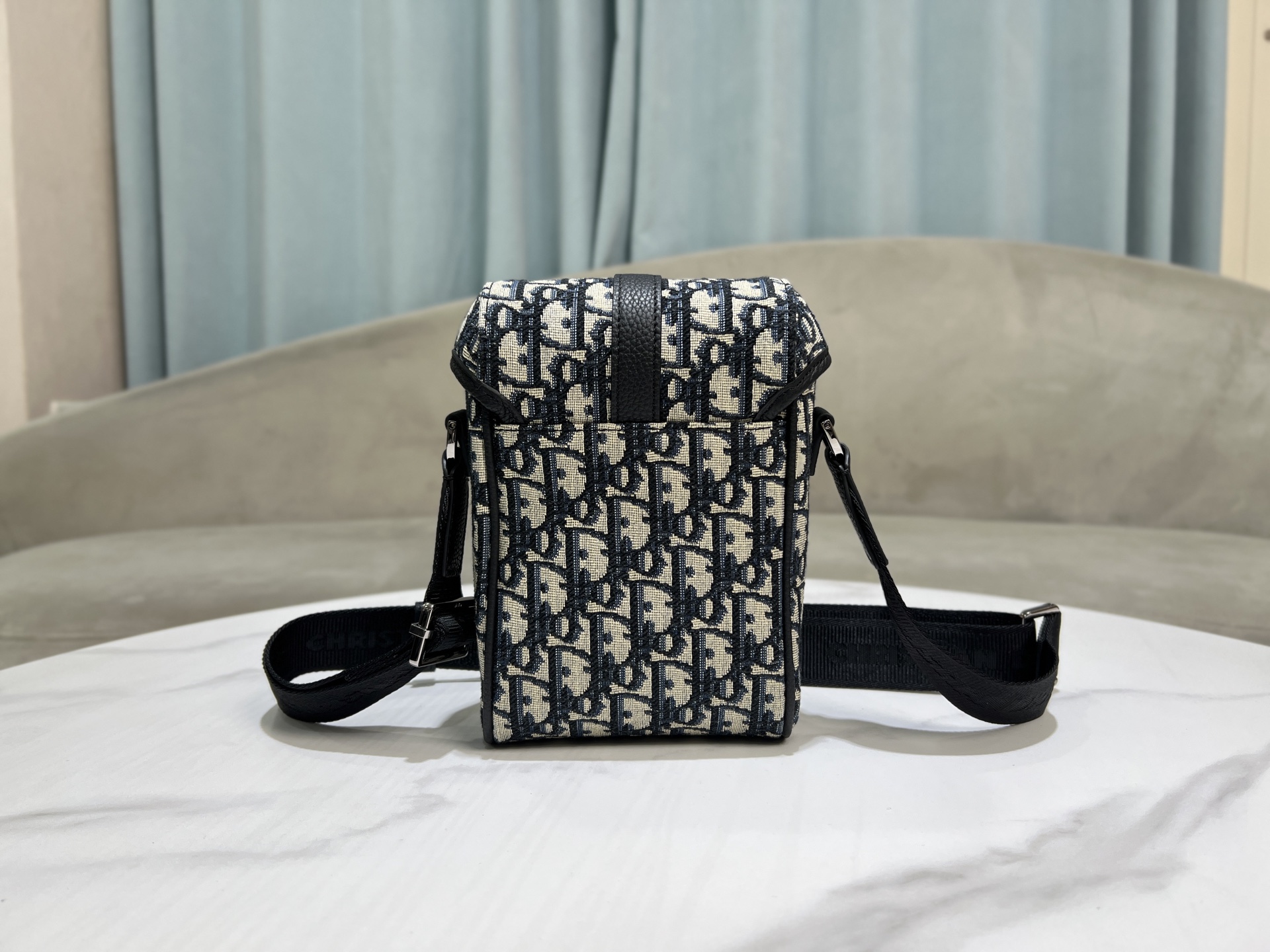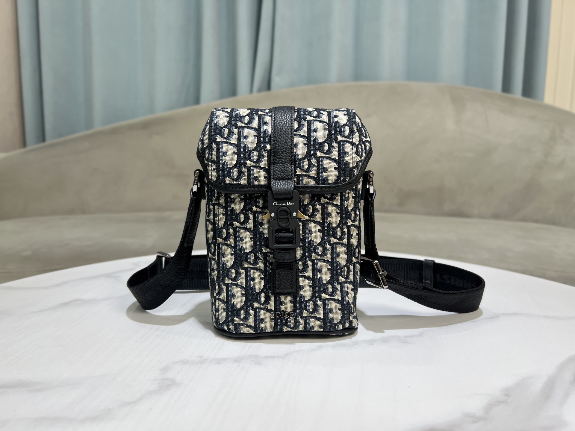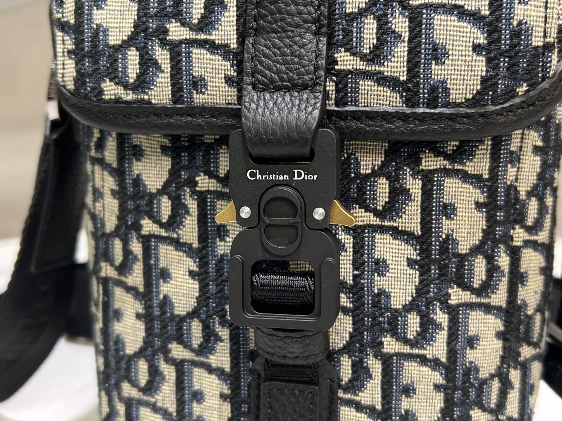 The Dior flap messenger bag is a new item from the 2025 Summer Men's Collection. Its modern and stylish design fully highlights Dior's haute couture style, elevating the charm of the Dior Hit The Road series. Meticulously crafted from materials like dark blue Oblique printed fabric, it is adorned with details of grained cowhide in the same color tone to enhance its elegance. The front is embellished with the Dior logo. The flap is decorated with an aluminum clasp and accented with the CD initials. It features a main compartment and an inner pocket. In a mini style and equipped with an adjustable shoulder strap, it can add a finishing touch to various casual outfits.