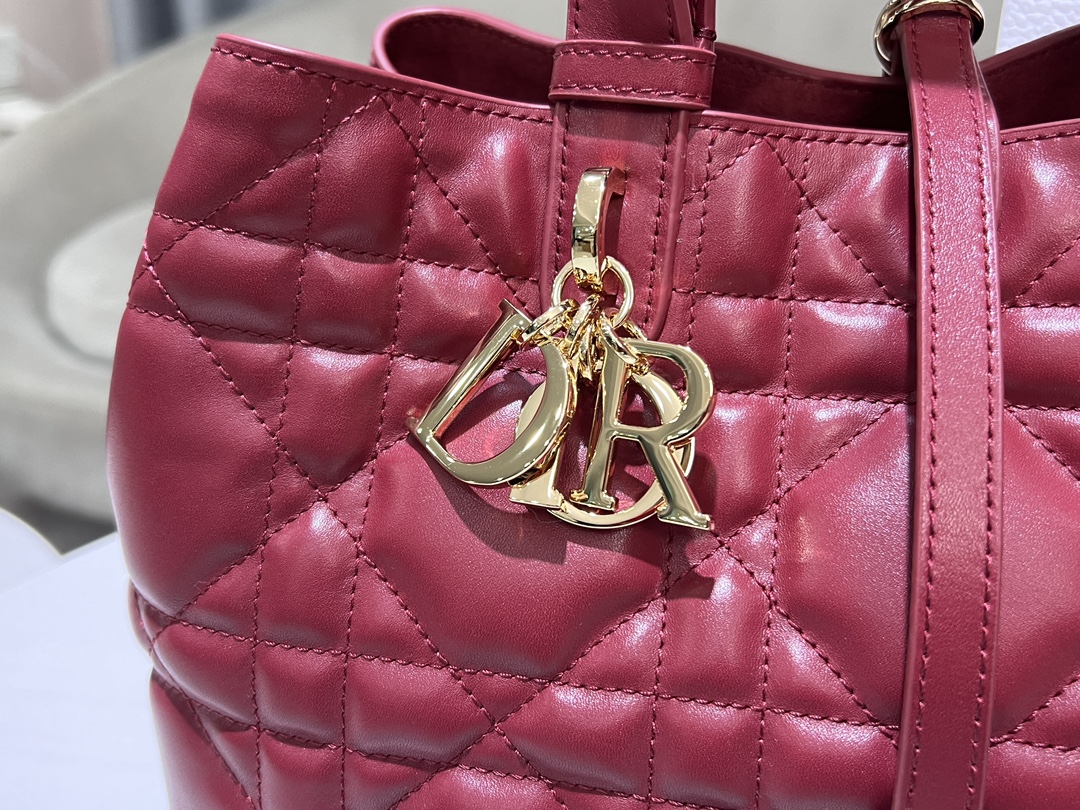 This Di, or Toujours handbag was showcased at the Spring/Summer 2012 collection, featuring a relaxed and functional design. It is carefully made of wine red cow leather and decorated with large rattan pattern stitching line. The spacious internal compartment is equipped with small bags, which can neatly store various daily necessities. There is also a C D Lock letter D knob opening and closing, which can adjust both sides and enhance the style. Leather handle with adjustable detail for easy toting. C D Lock and tie open and close DI, OR sling removable internal pouch Adjustable leather handle includes dust bag