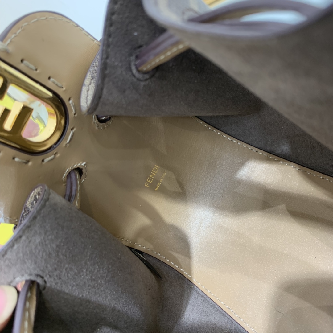 The FENDI mini bag features a drawstring closure and is crafted from PU fabric, adorned with a colored FF print. It includes beige leather details, internal compartments, and gold metal hardware. The bag comes with a top handle or a detachable shoulder strap, allowing it to be carried by hand, over the shoulder, or crossbody.