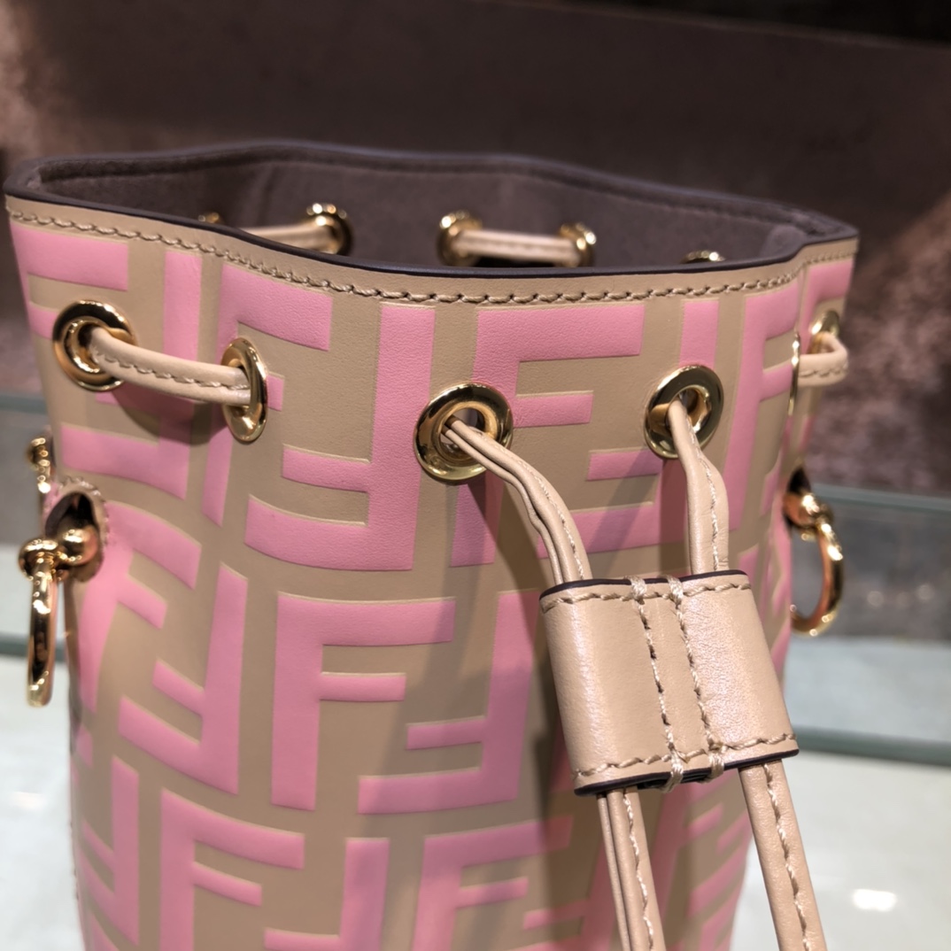 The mini bucket bag is just the right size for your essentials, making it a must-have for daily outings. Its compact design ensures it is easy to carry. The Mon Tresor mini bucket bag features a drawstring closure and Fendi metal logo decoration. It comes with two detachable shoulder straps—one long and one short—allowing it to be carried on the shoulder or worn crossbody. Made from beige calfskin leather, it features FF embossed patterns and pink hand-painted details. Gold metal hardware adds a touch of sophistication. This bag offers a high-end, elegant feel.