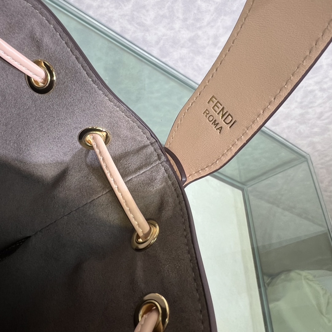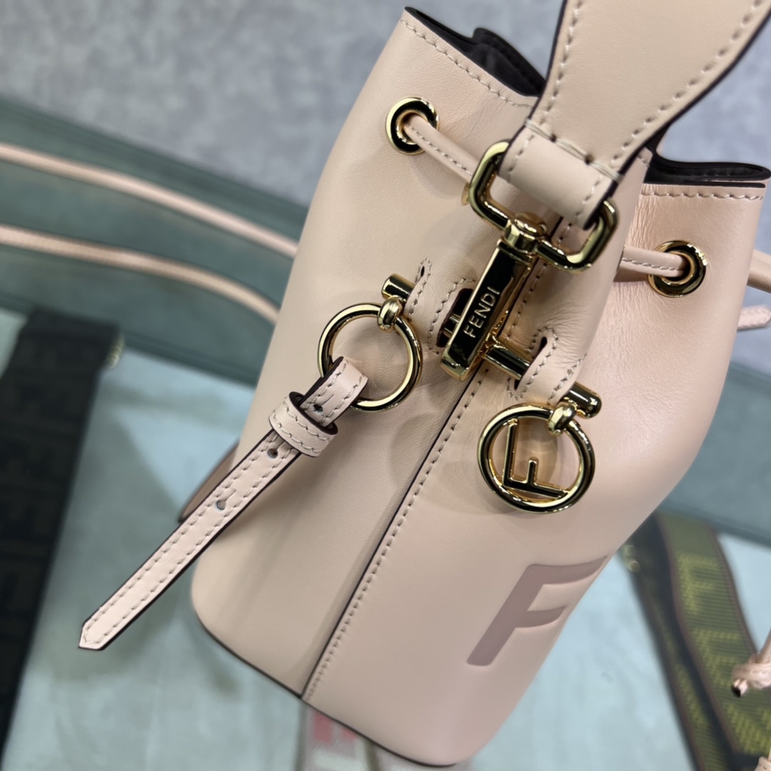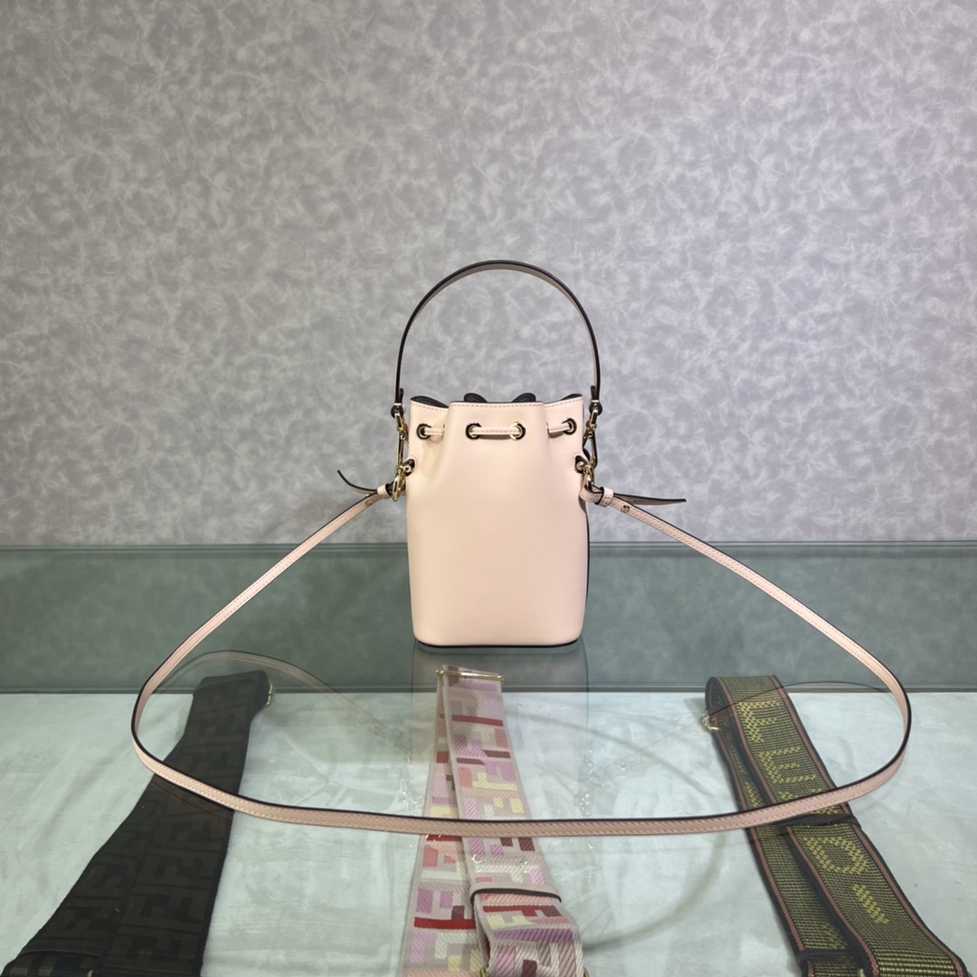 Made from pink leather and embossed with "FENDI ROMA," this mini bucket bag features a lined interior and gold metal hardware. It comes with two detachable shoulder straps—one long and one short—allowing it to be carried on the shoulder or worn crossbody.