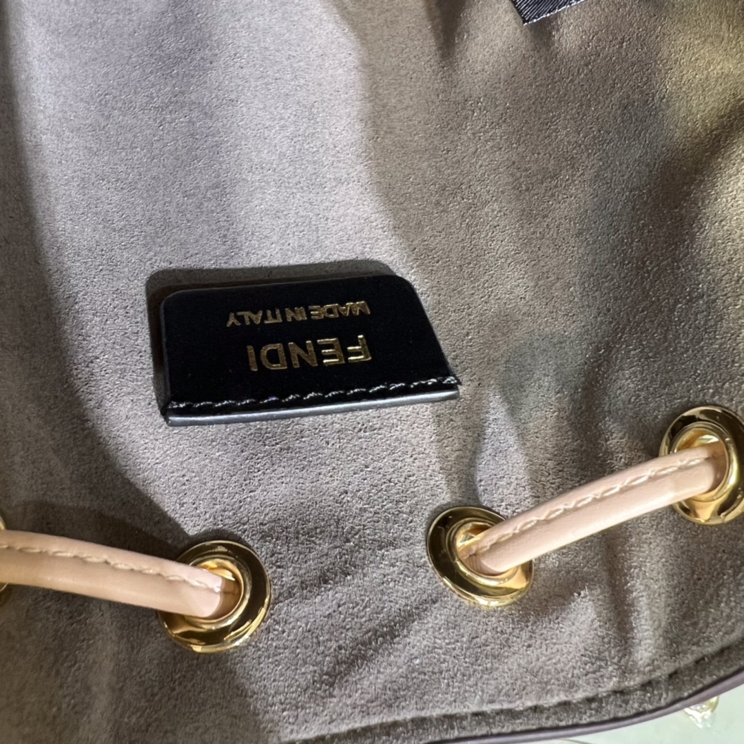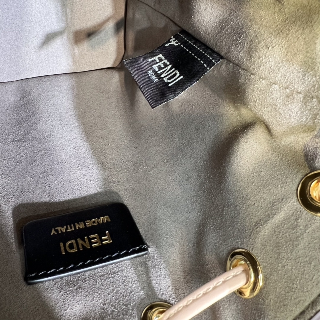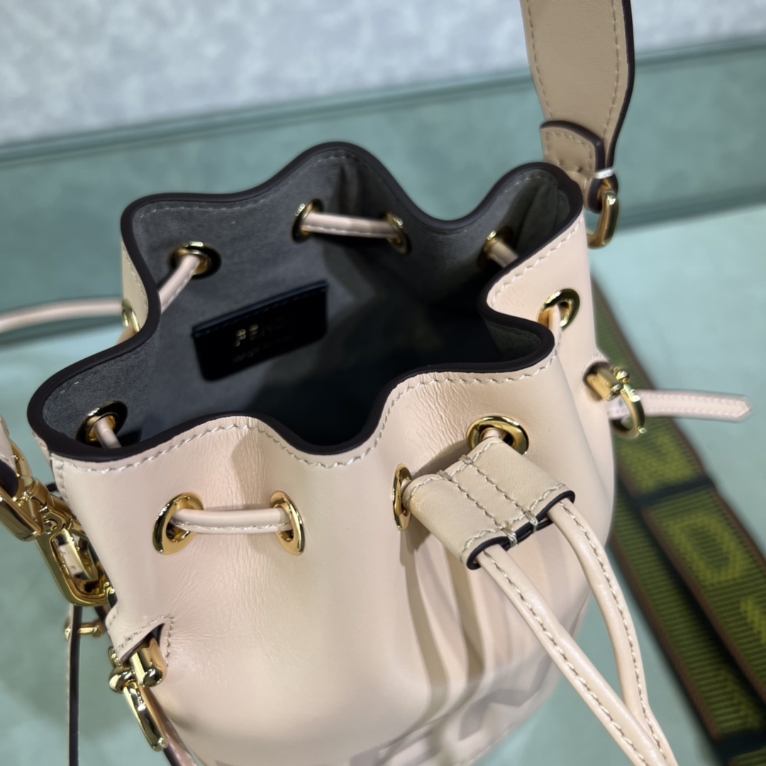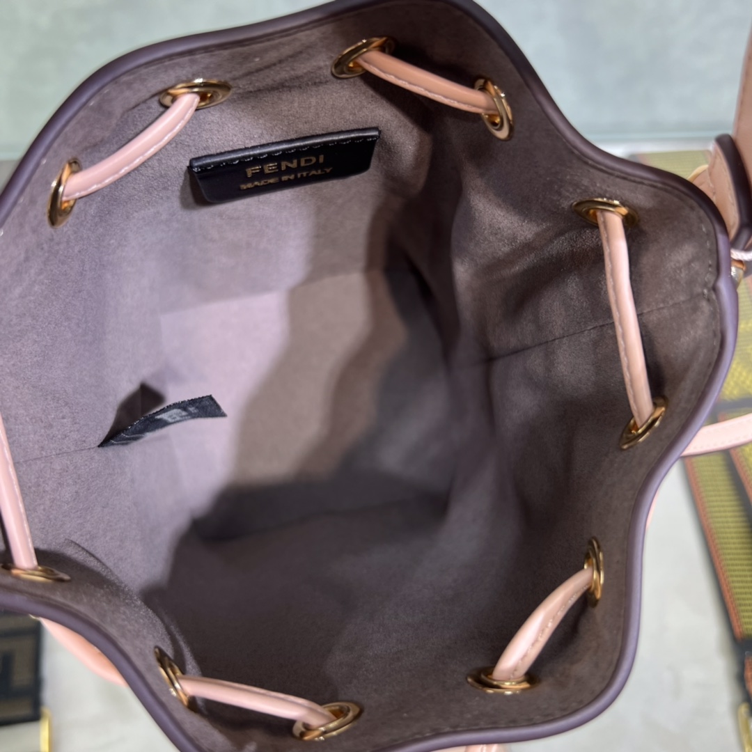 Made from pink leather and embossed with "FENDI ROMA," this mini bucket bag features a lined interior and gold metal hardware. It comes with two detachable shoulder straps—one long and one short—allowing it to be carried on the shoulder or worn crossbody.