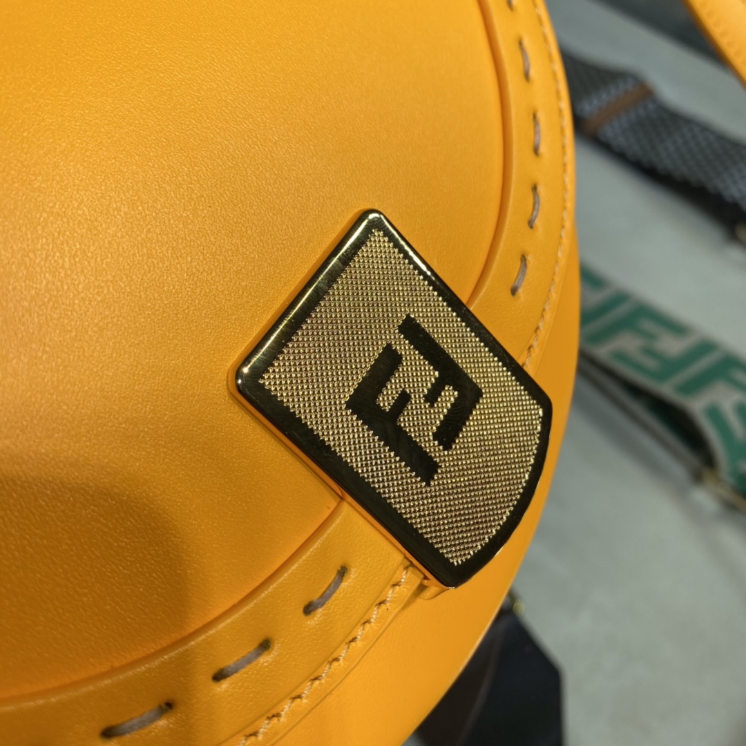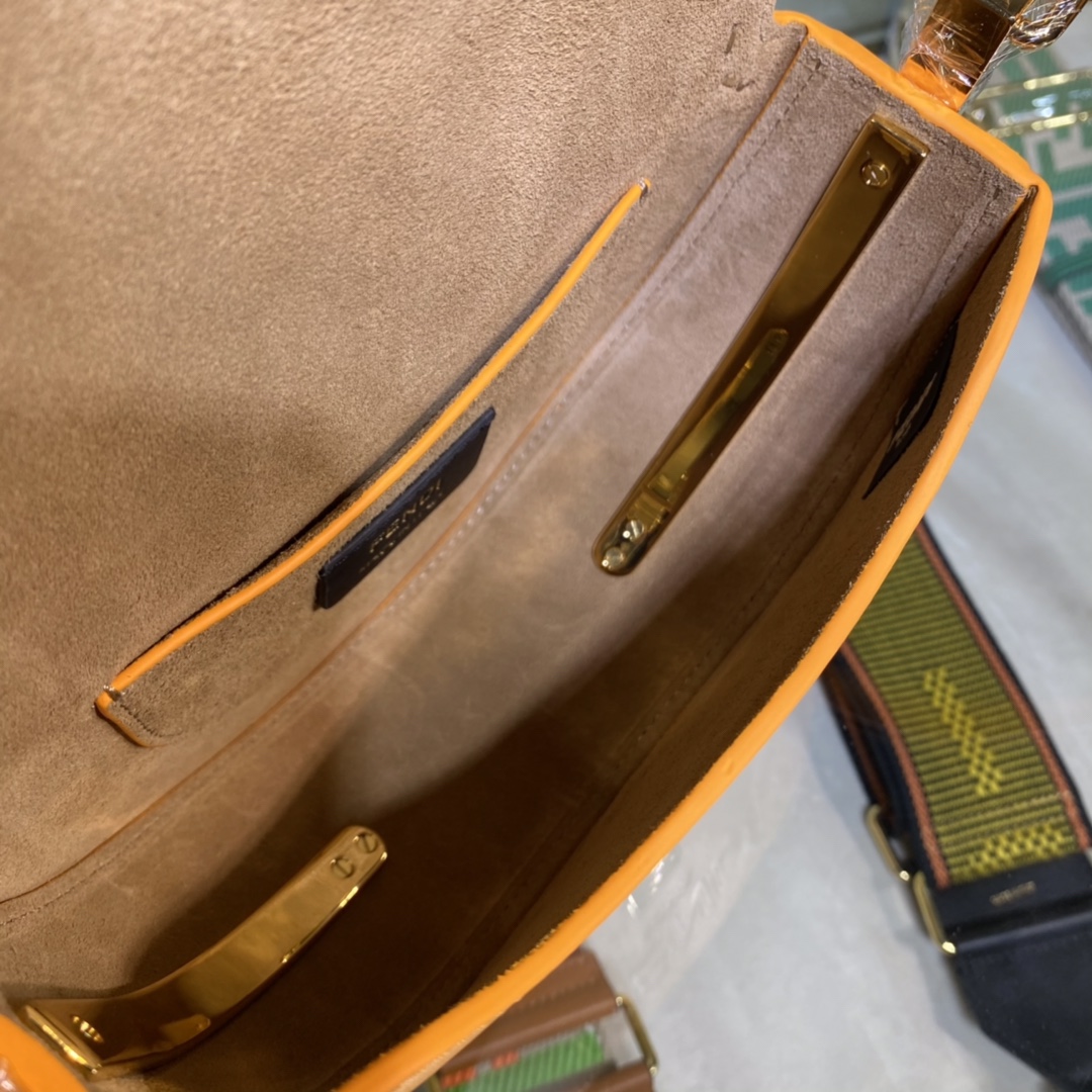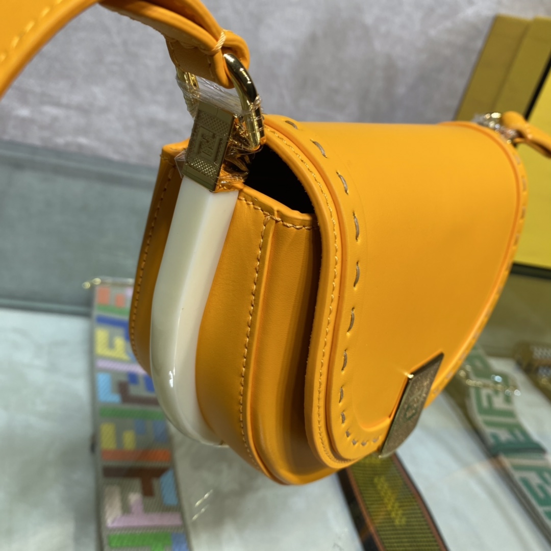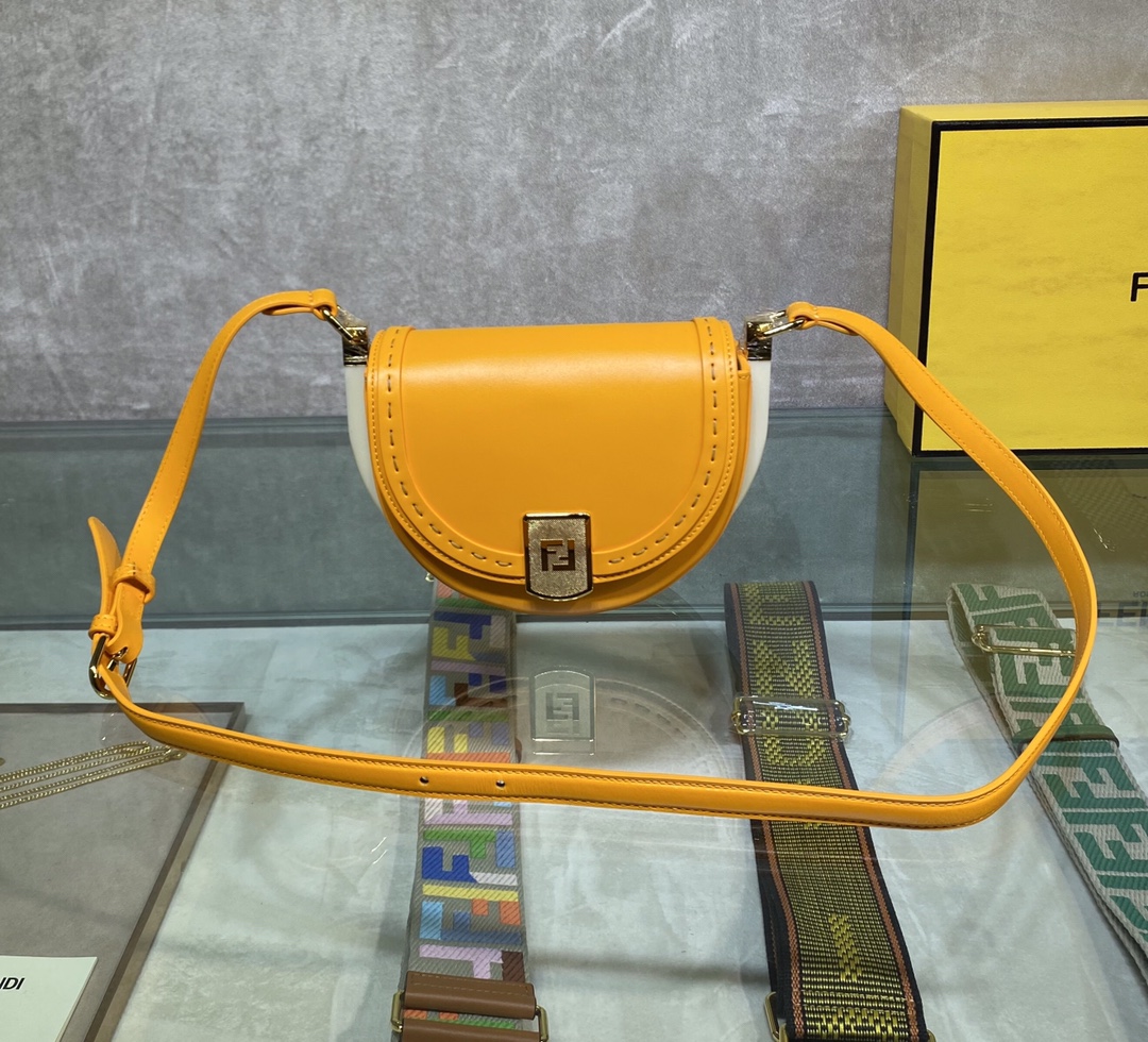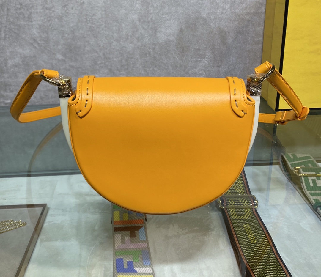 This bag features a metal clasp with the iconic FF pattern and a flap adorned with a hot-embossed Fendi Roma logo. It includes a lined internal compartment, a small inner pocket, tortoiseshell organic glass details, and gold metal fittings. The adjustable shoulder strap allows for wearing it on the shoulder or crossbody.