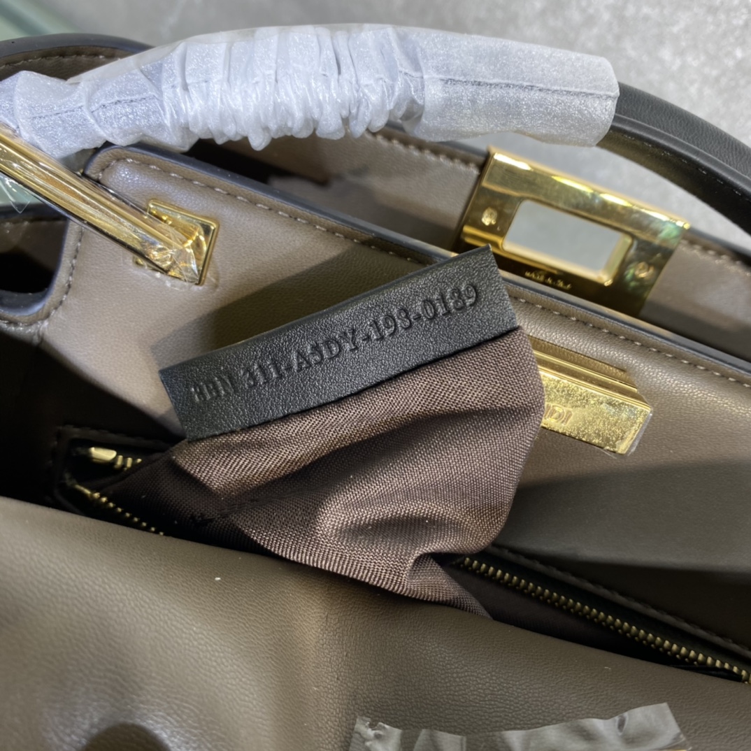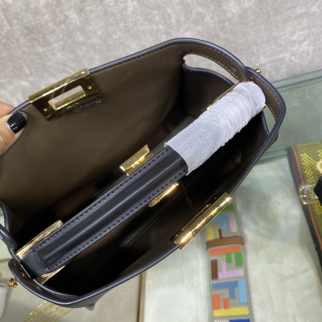 This classic medium-sized Peekaboo Essentially handbag features two compartments separated by a rigid panel and is secured with twist-lock closures on both sides. The interior is lined and includes a zippered pocket for added convenience. It comes with a single handle and a detachable shoulder strap for versatile carrying options.