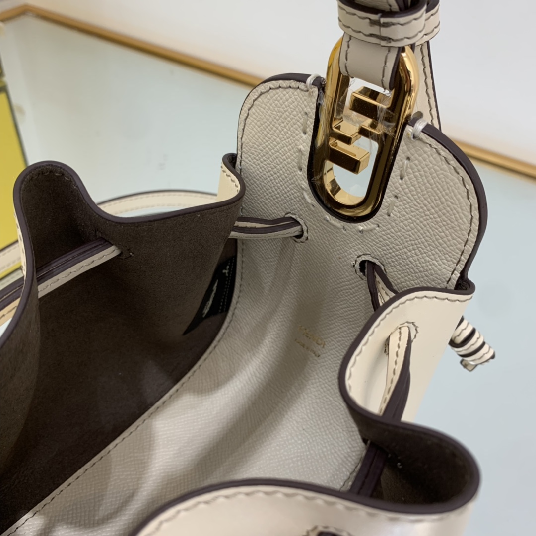 The FENDI mini bag features a drawstring closure and is made from PU fabric. It includes internal compartments and gold metal hardware. The bag comes with a top handle or a detachable shoulder strap, allowing for hand carrying, shoulder wear, or crossbody use.