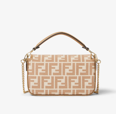 Iconic small Baguette bag made of jacquard fabric with the iconic FF motif in shades of beige, embellished with cappuccino embroidered borders, tone-on-tone leather details and embellished with an FF clasp.