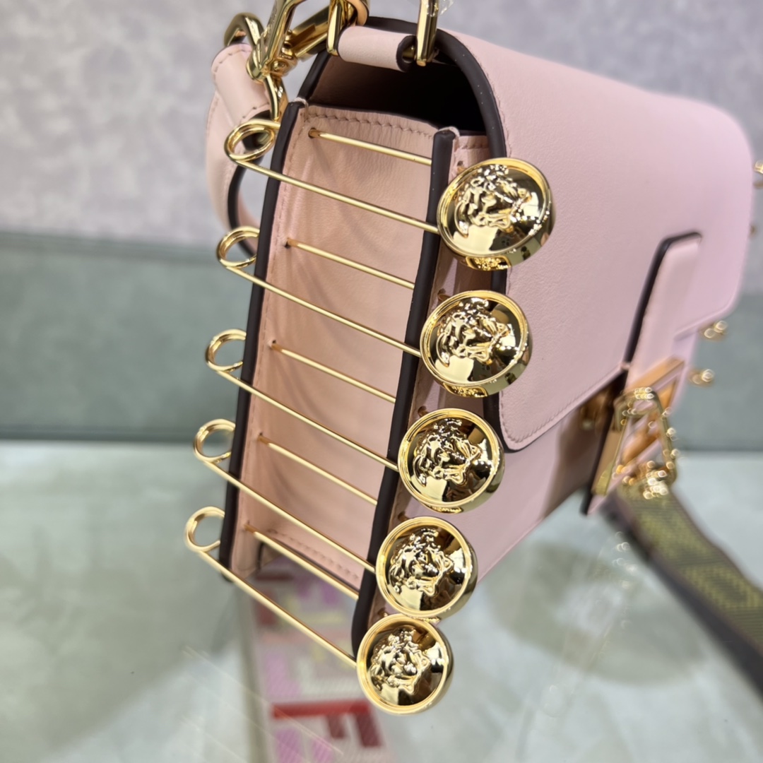 This handbag from the Versace by Fendi collection features a signature square Baguette design in smooth pink leather. Each side is adorned with five Medusa metal pin decorations. It includes an FF clasp with acrylic and pin details. The bag has a front flap with a magnetic closure, a satin-lined interior with compartments, and gold-toned metal hardware. It comes with a long handle and a detachable shoulder strap, allowing for both underarm and crossbody wear.