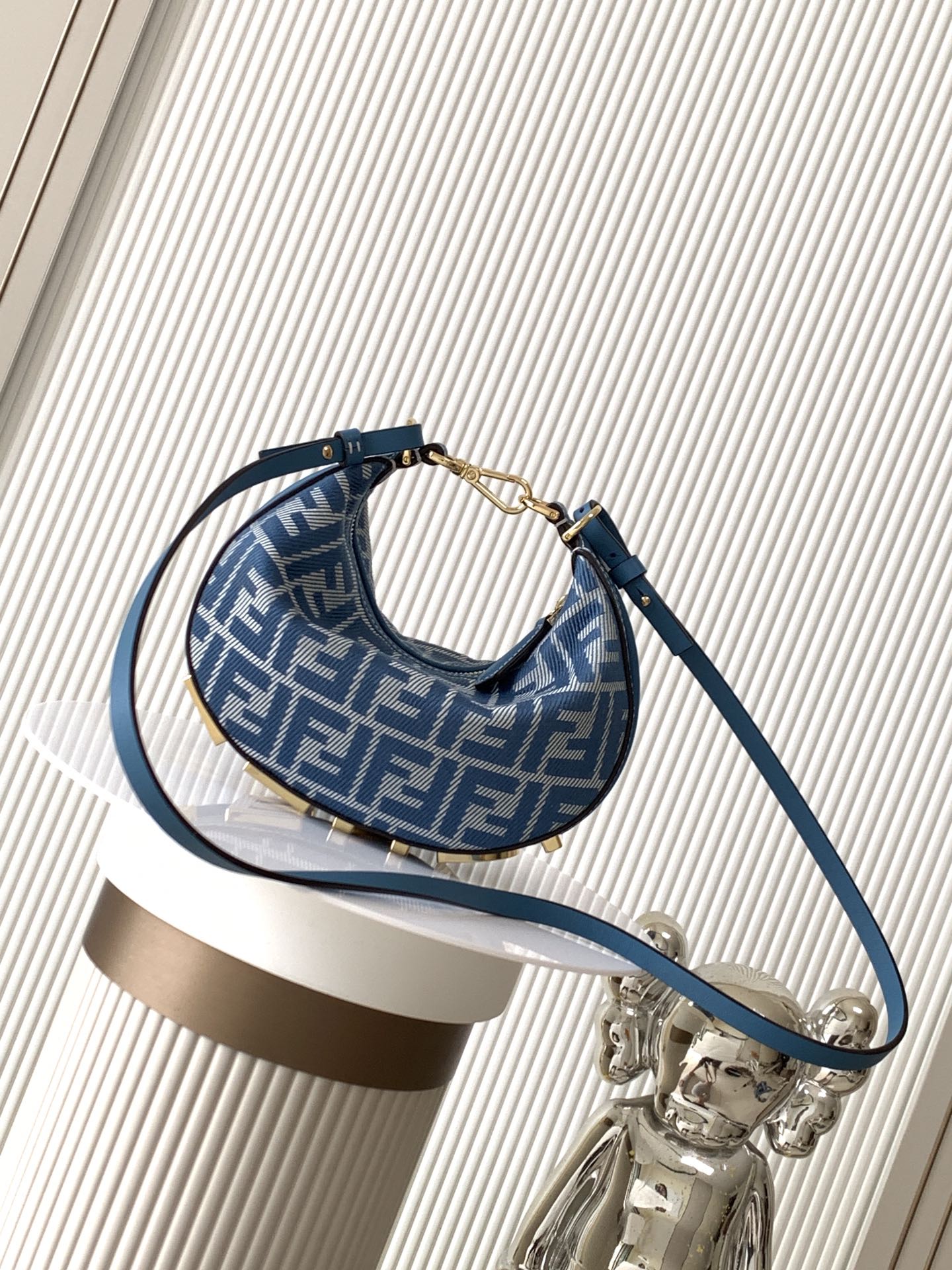 Made of denim-effect FF jacquard in shades of blue, decorated with vintage gold-finish metal FENDI lettering on the base, visible when wearing the bag under the arm.
