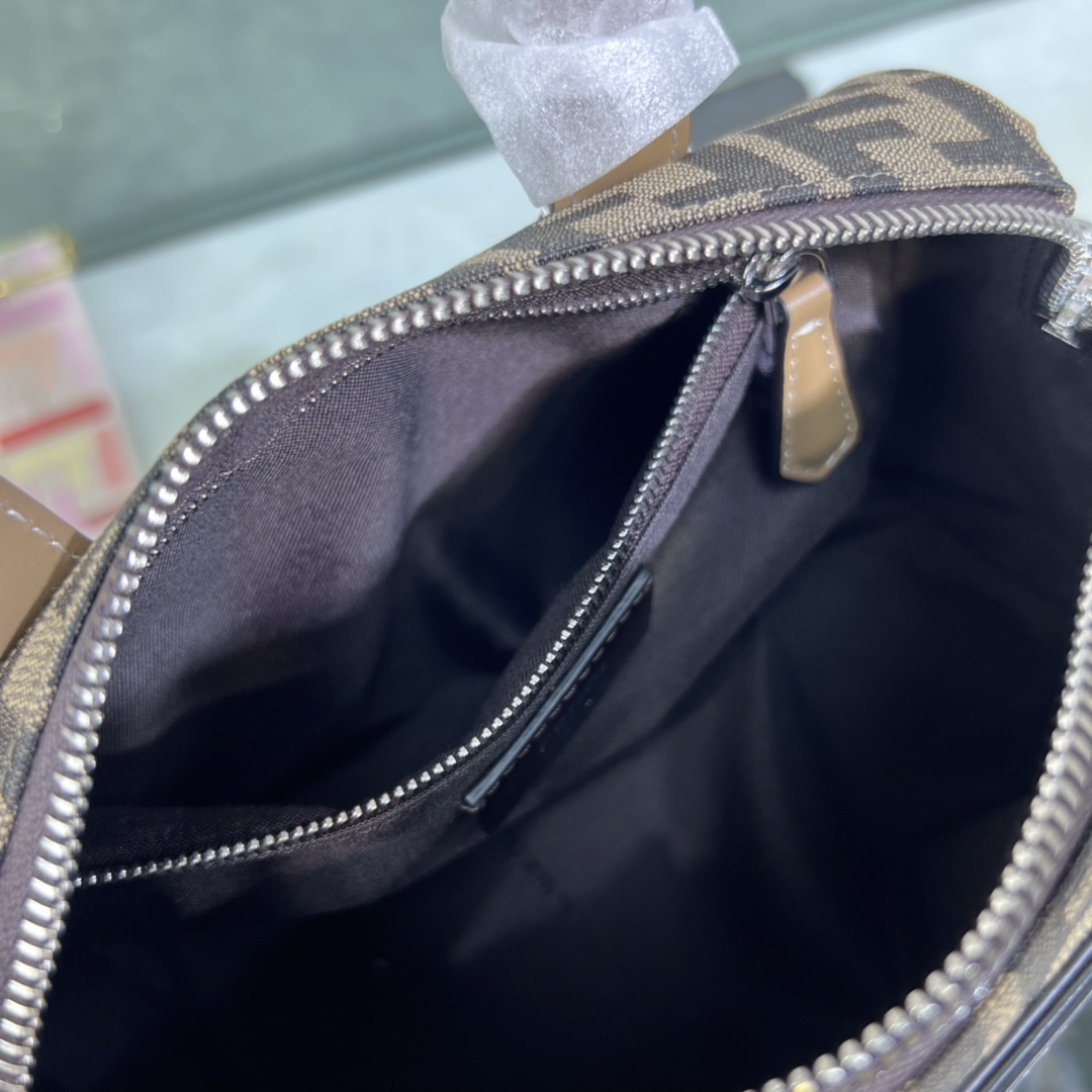 Mini bowling bag in fabric with jacquard FF pattern and beige leather appliqués creating the FF pattern. Lined interior zipped compartment with Fendi OLock slider, interior zipped pocket and silver-finish metal. Equipped with two mesh handles, it can be carried by hand or over the shoulder with the adjustable and removable shoulder strap.