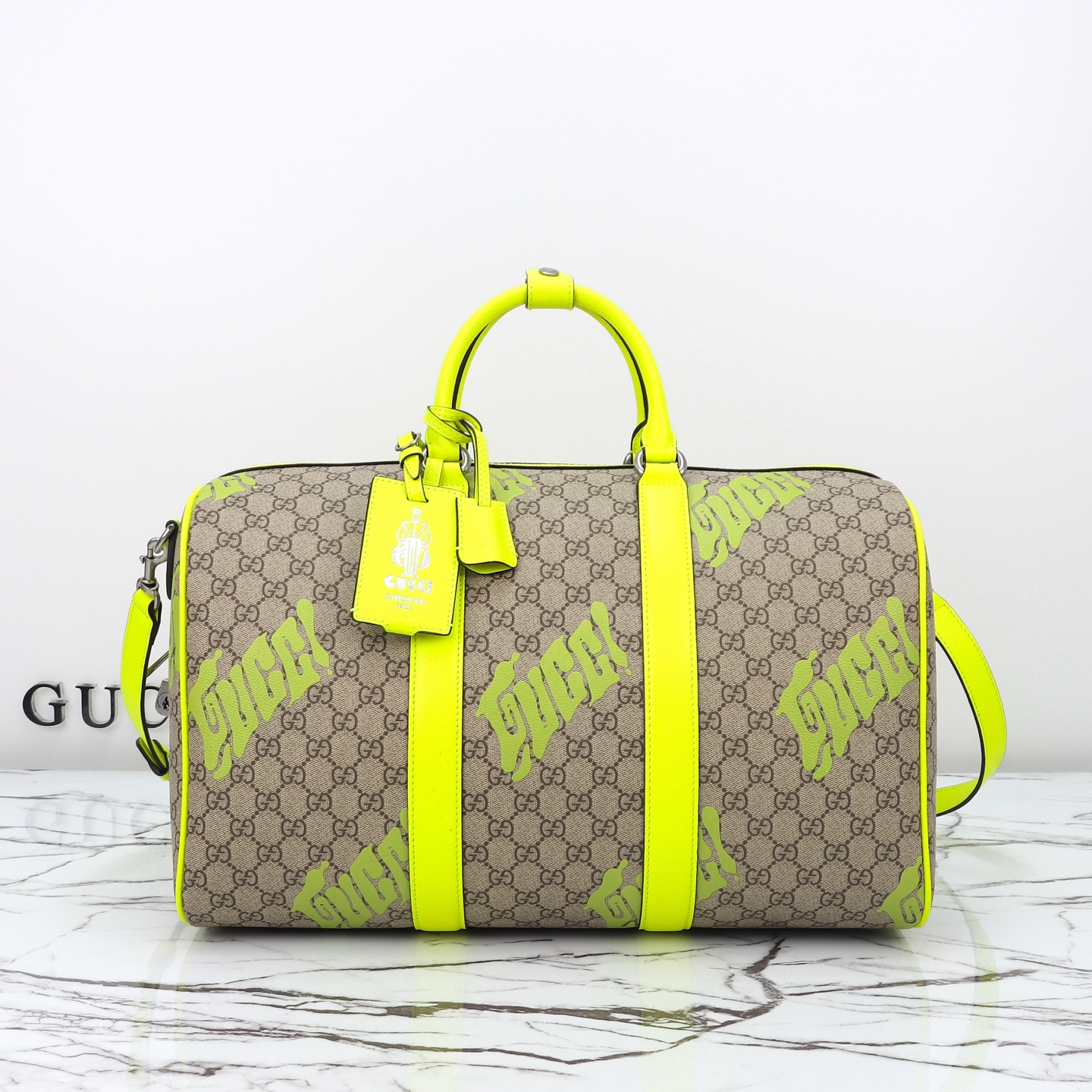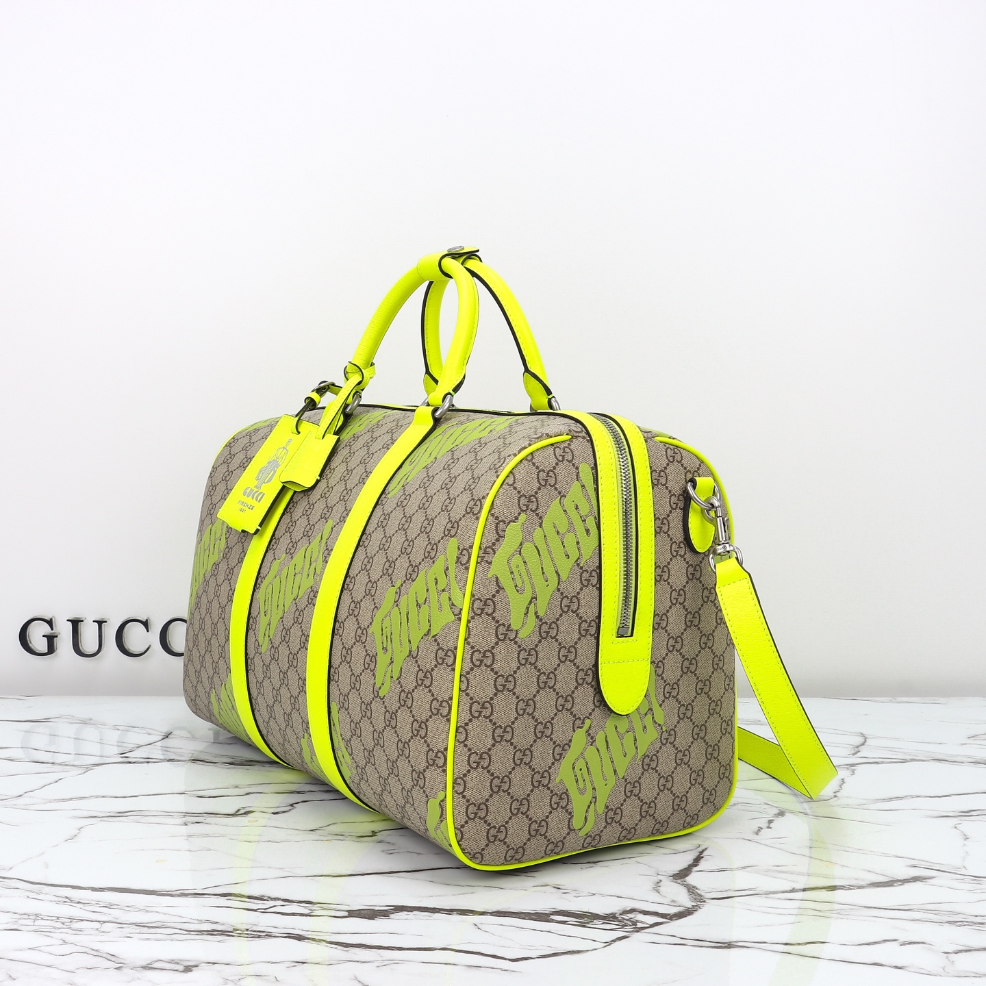 In the Pre-Fall 2025 collection, Chinese artist Currynew (Xiang Zhang) puts a twist on the House logo across men’s ready-to-wear, leathergoods, and accessories. This duffle bag is presented in a GG Monogram coated fabric, complete with a Gucci print and contrasting leather trim.