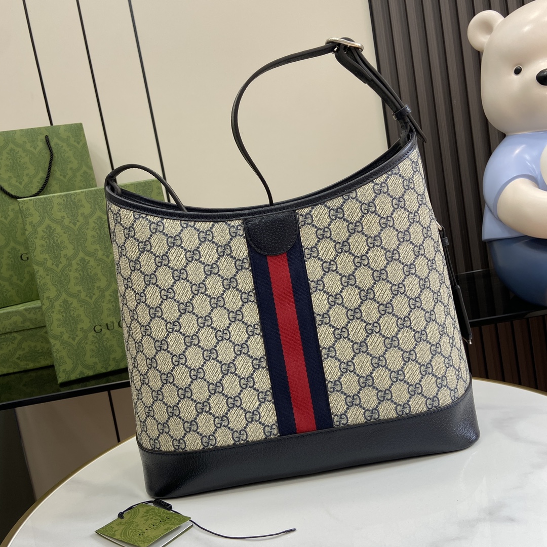 [GG New product] Ophidia series GG medium backpack. This medium backpack is a new interpretation of the Ophidia series with a unique design, combining the open bucket bag with the shoulder bag style. The design is made from GG Supreme canvas, the brand's signature beige and ebony palette. Beige and ebony GG Supreme canvas, blue leather strap, gold trim, red and blue webbing