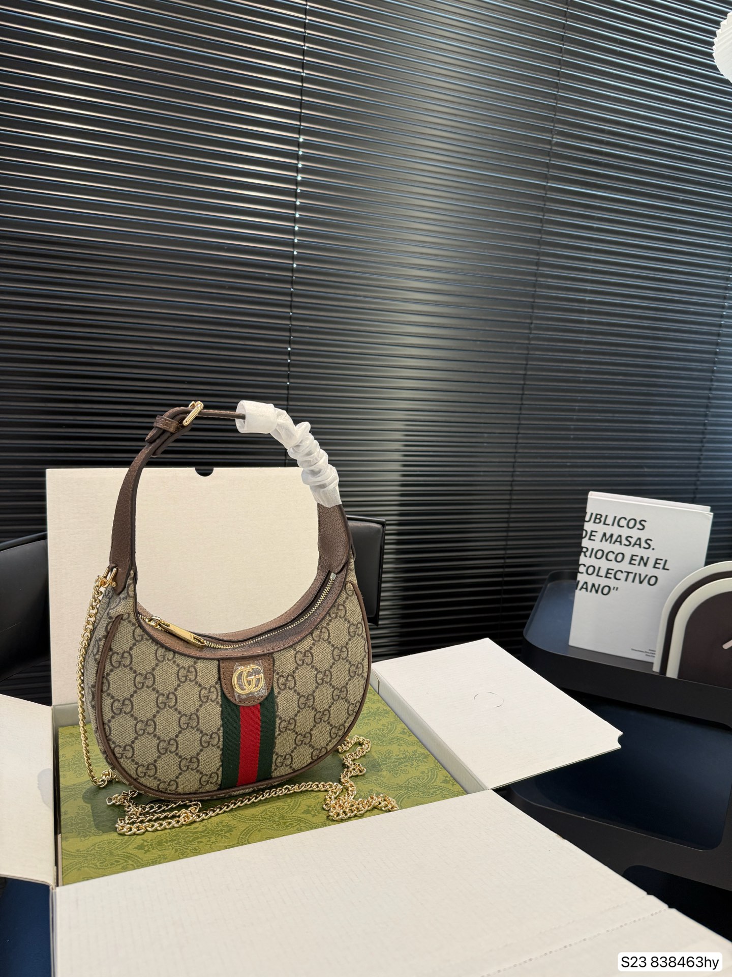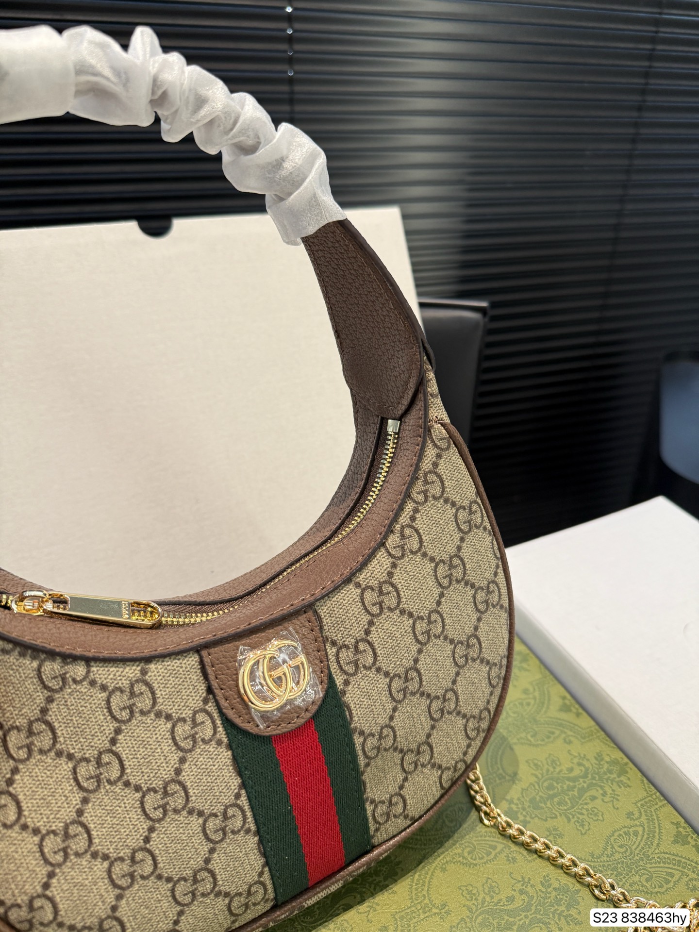 The Ophidia collection highlights reinterpreted silhouettes and functions, crafted with a soft touch in the signature beige and brown palette. This crescent shape features a delicate chain strap.