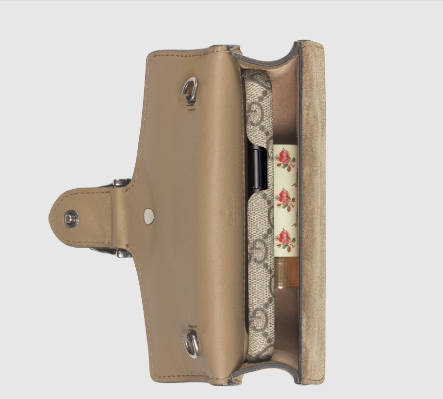 A structured GG Supreme canvas chain super mini shoulder bag with a key ring that can be used to attach this bag to a separate larger bag.