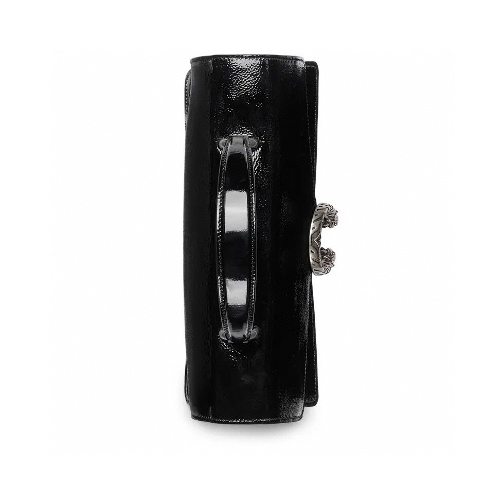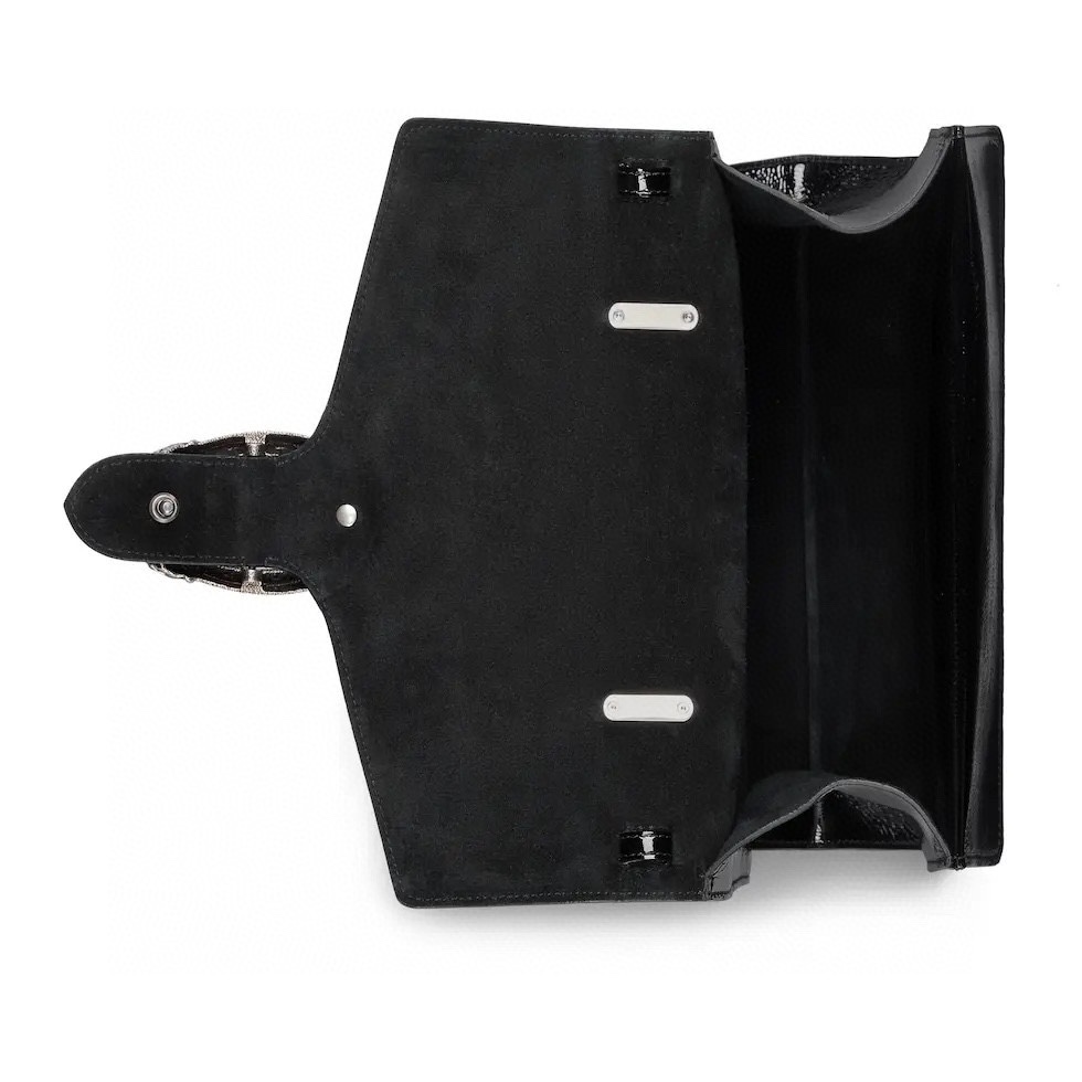 Gucci’s Creative Director Sabato de Sarno has unveiled a new style for the iconic Dionysus line. The top handle bag features a contemporary look, and is crafted in sleek black patent leather. At the front appears the signature tiger head closure with a flap, as well as a sliding chain that can be adjusted to suit the wearer’s preferred length and style.