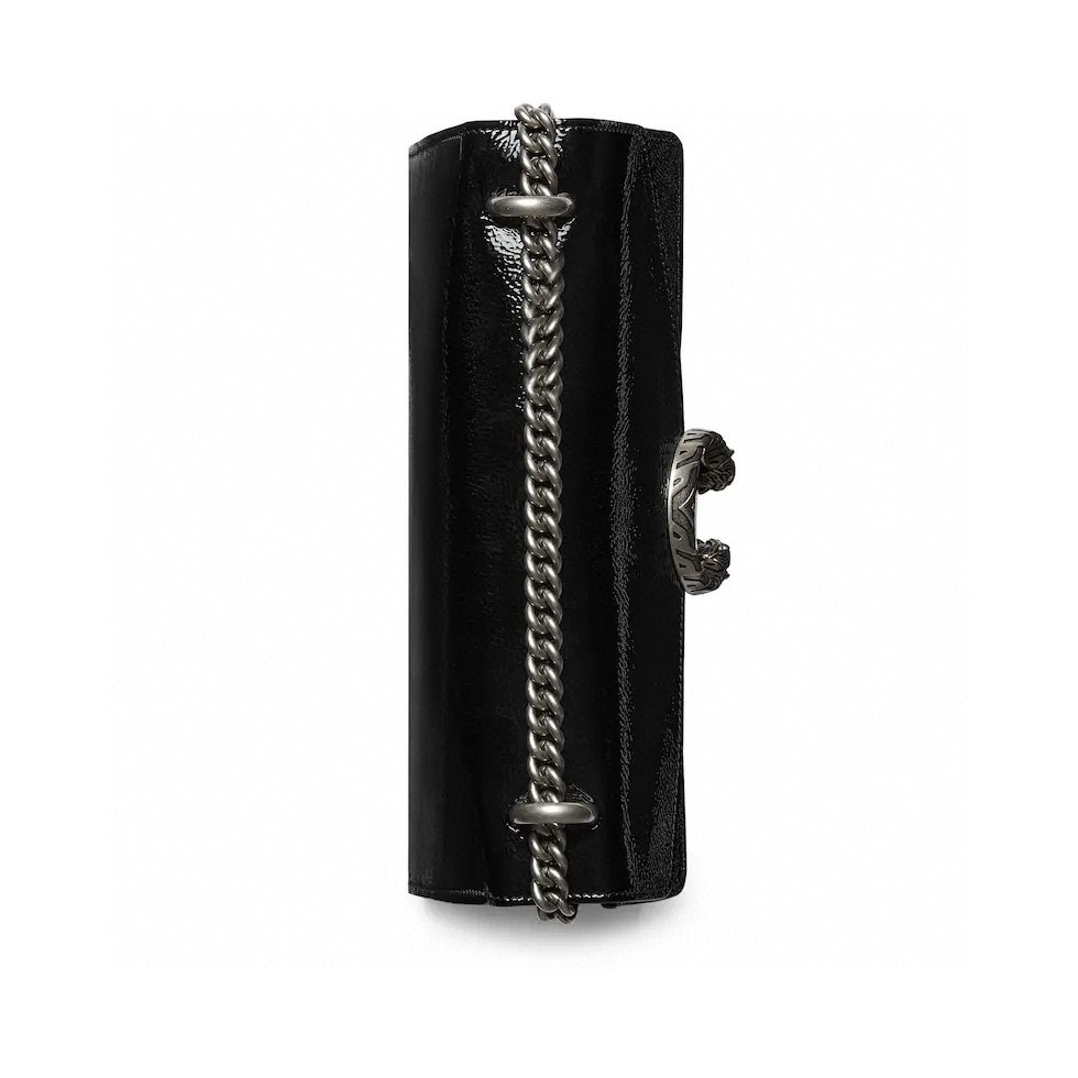 Gucci 创意总监萨巴托·德·萨尔诺以柔和的解构设计重新诠释经典的 Dionysus 肩包。此款手袋采用光滑的黑色漆皮制成,配有经典的双虎头锁扣和翻盖设计。滑动链条可调节为肩带或顶部手柄,打造多种风格,展现现代风格。