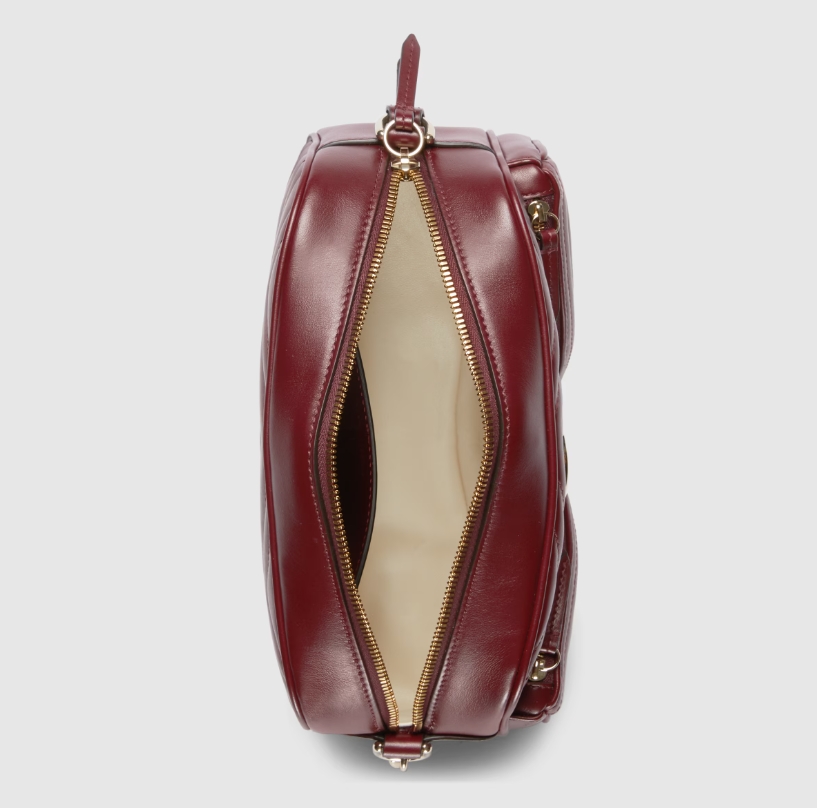 The GG Marmont line has always combined innovative material and design, and for Pre-Fall, two outside zip pockets further emphasize the geometry and sophistication of the matelassé chevron leather. Ivory leather lining, light gold toned hardware, and an adjustable leather and chain shoulder strap completes this small shoulder bag in the Gucci Rosso Ancora hue.