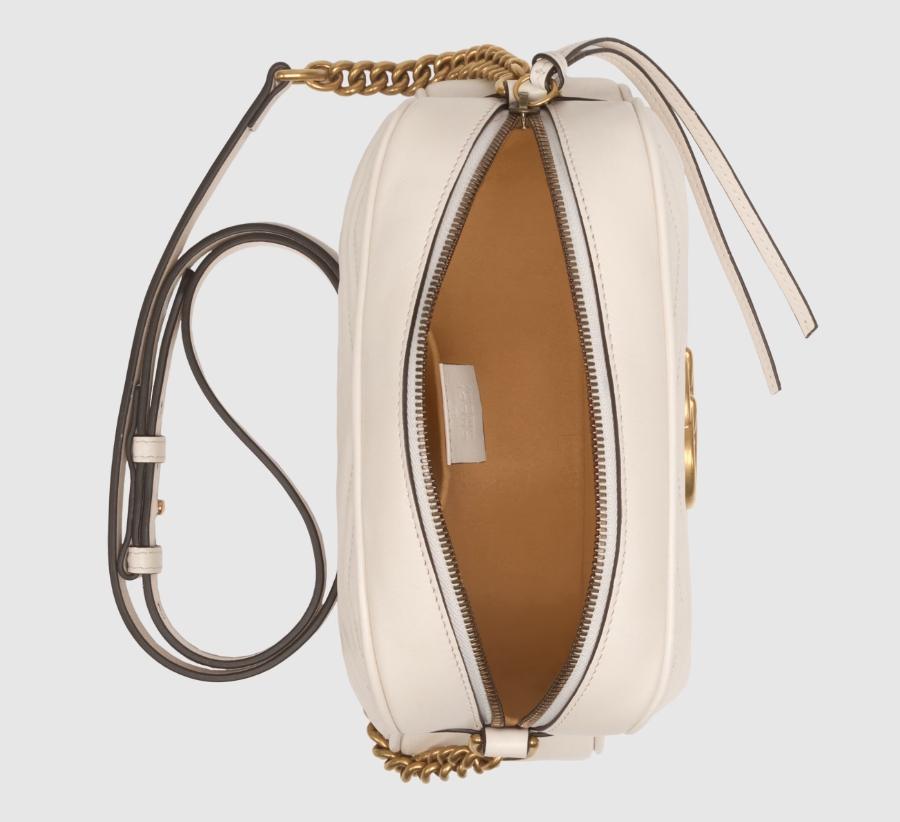 Inspired by the summer spirit and beach clubs on the Italian coast, this item is part of Gucci Lido. The small GG Marmont chain shoulder bag has a softly structured shape and a zip top closure with the Double G hardware. The chain shoulder strap has a leather shoulder detail. Made in matelassé leather with a chevron design and GG on the back.