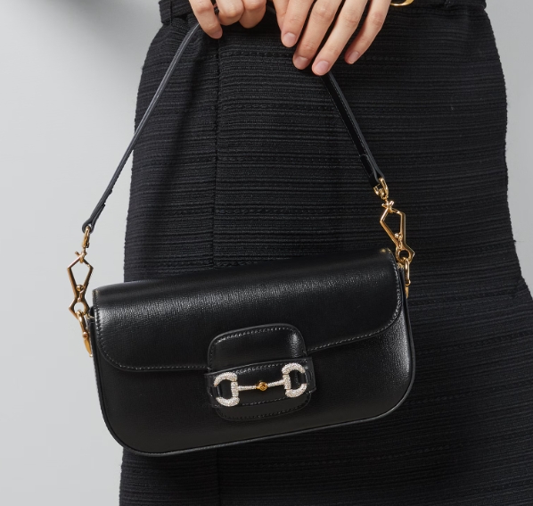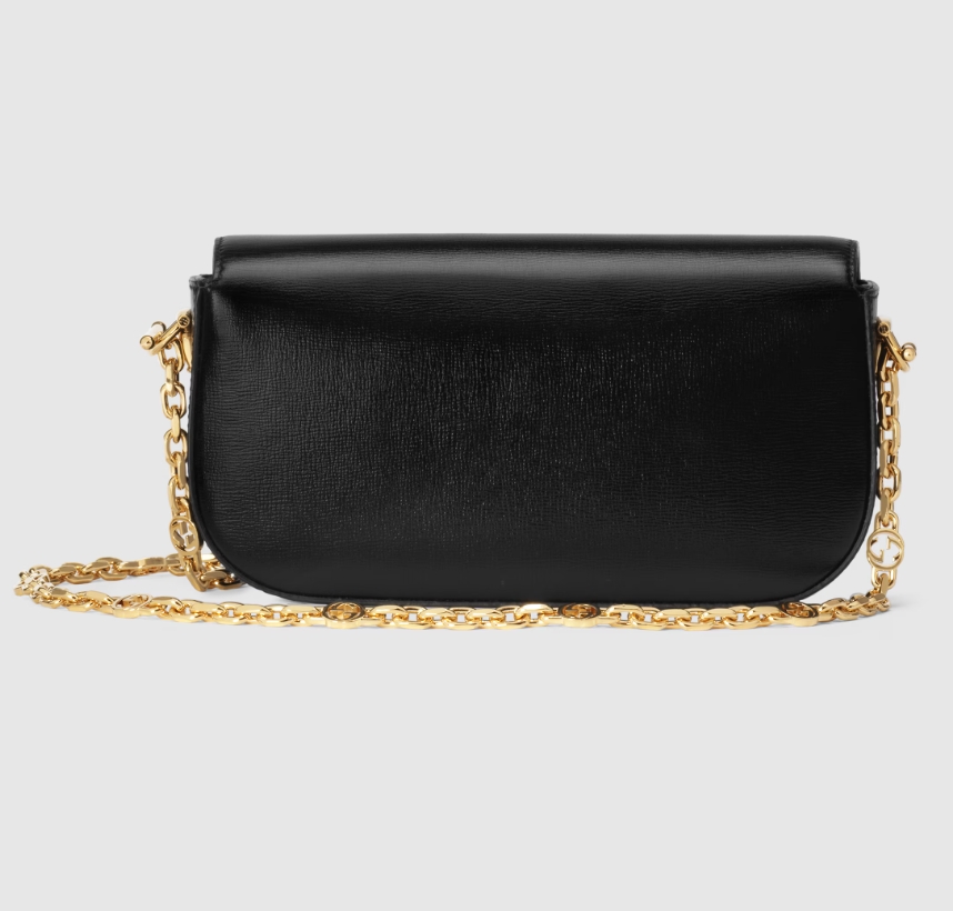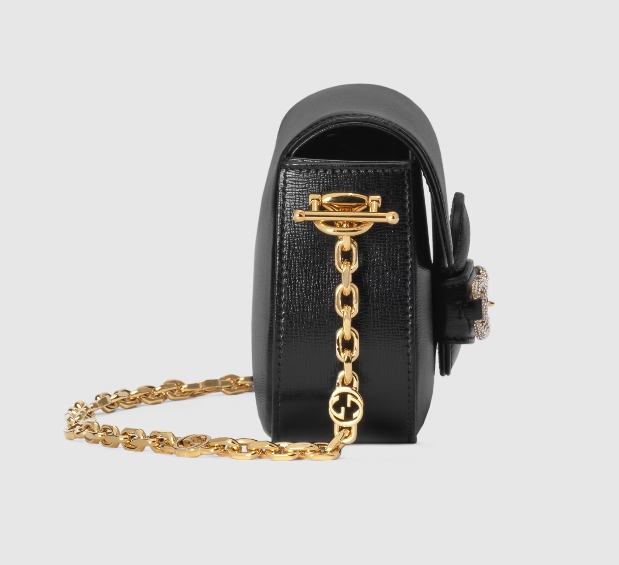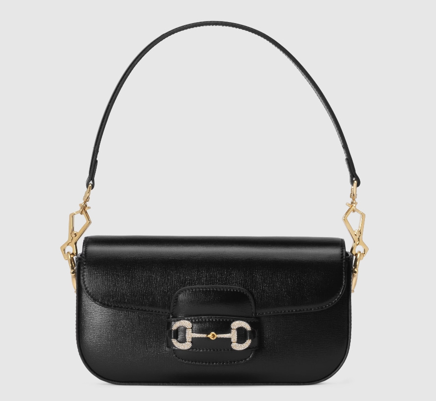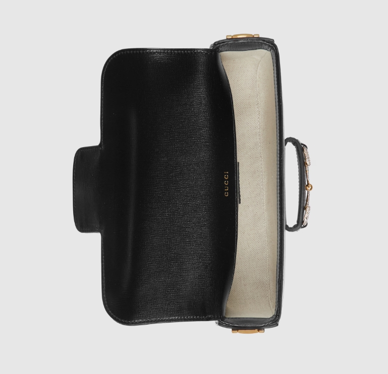 The Gucci Horsebit 1955 embodies the House’s history. Recreated from an archival design, the shoulder bag’s lines and forms have a heritage that goes back more than six decades. Here, presented in black leather, the style is elevated to luxurious heights with elegant new elements such as the Horsebit with crystals.