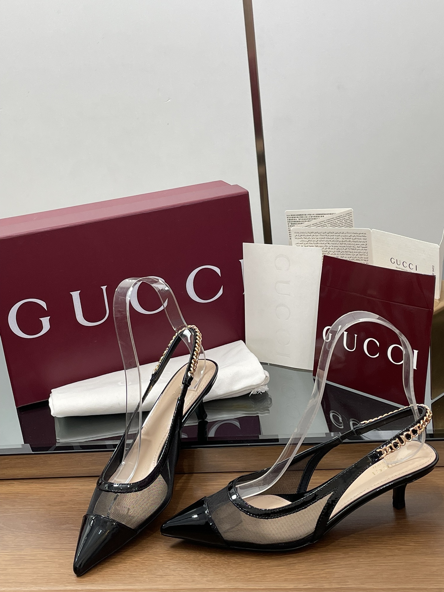 Gucci's creative director introduces a new open-toe, pointed-toe design that celebrates gender equality and advocates for female empowerment. The eye-catching chain details and mesh inserts add a chic and modern twist, enhancing your look with beauty, strength, and a sense of freedom.
