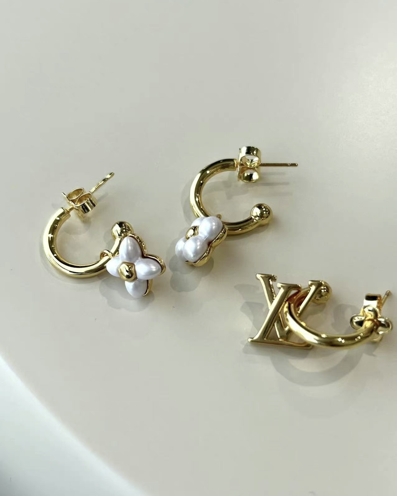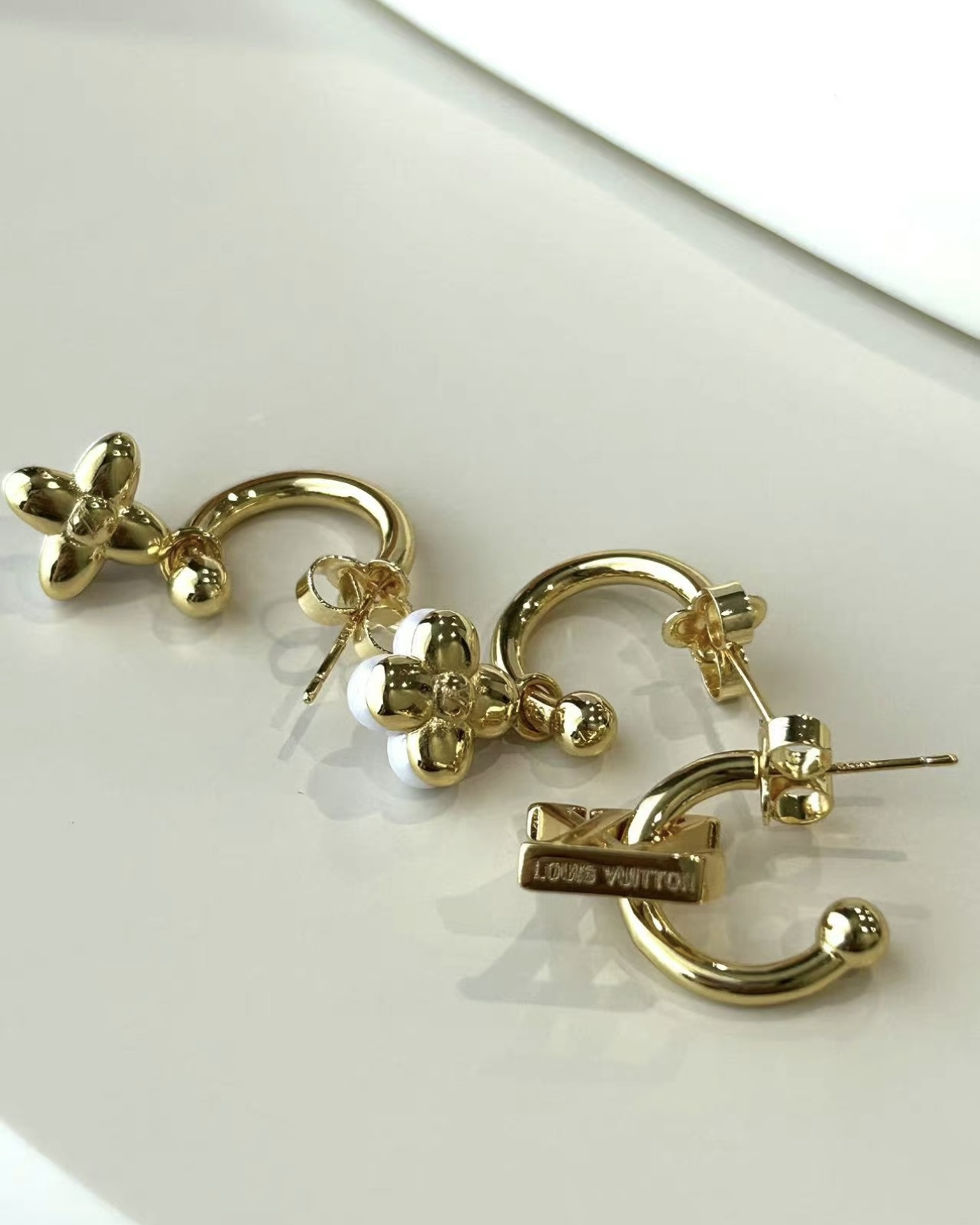 Each piece in this set of LV Floragram earrings highlights a different Louis Vuitton symbol. The coordinating designs individually showcase a pointed Monogram Flower, a rounded Monogram Flower, and the LV initials. A shared celebration of iconic motifs unites this trio of mismatched earrings for a youthful take on House signatures.
