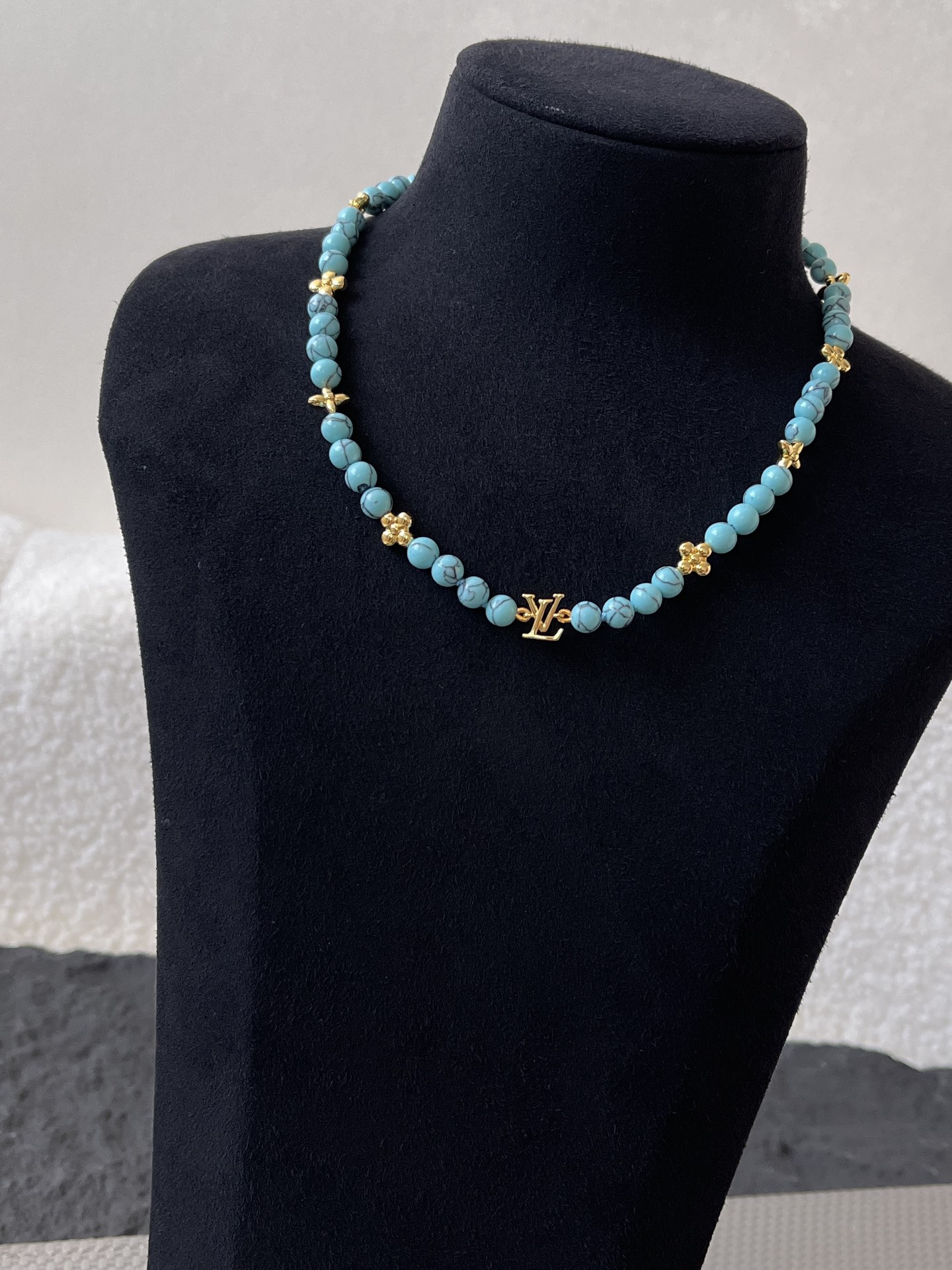 The Pearl Fusion necklace creates an asymmetrical design with metallic blue beading and glass beading, interspersing Monogram floral inscriptions and LV elements, slowly revealing Dandy fashion. LV letters embellish adjustable chain to show the heroic interpretation of beading