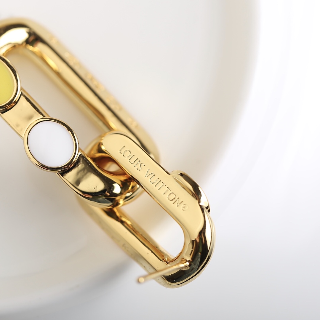 L V Louis Vuitton earringsMade of brass with a double-ring interlocking design, it is embellished with brand letters and classic graphic prints. Colored glass is elegant yet interesting. BHK