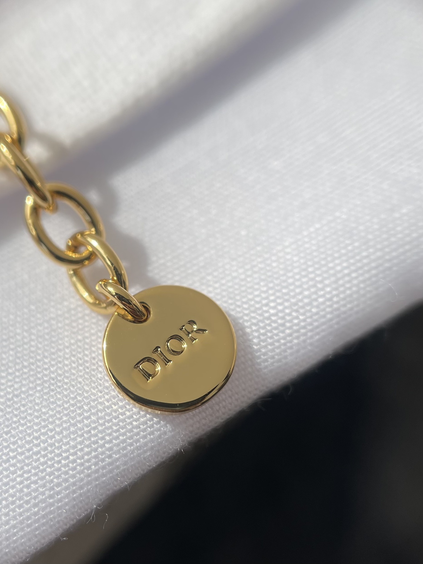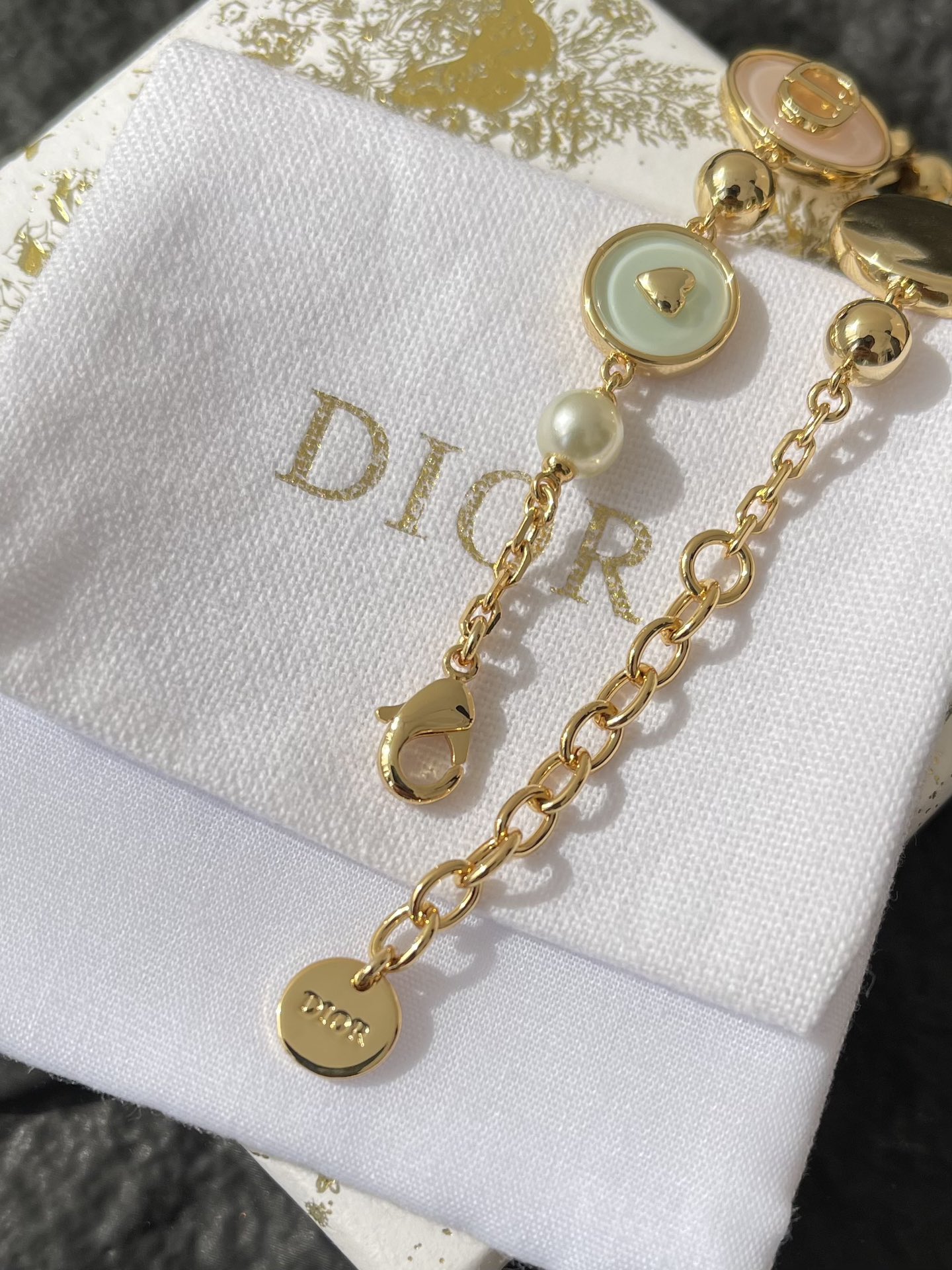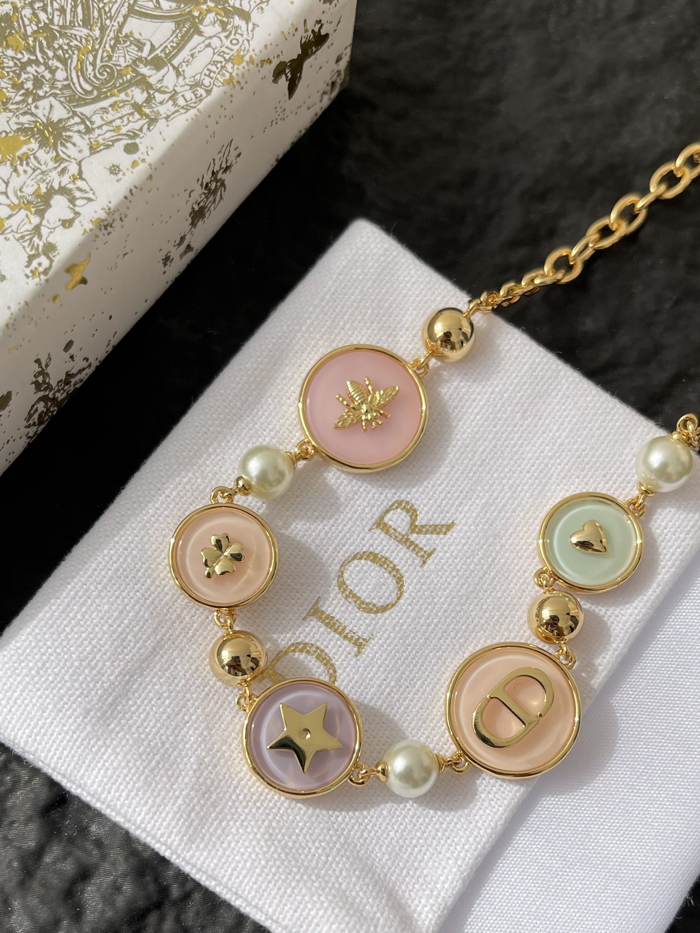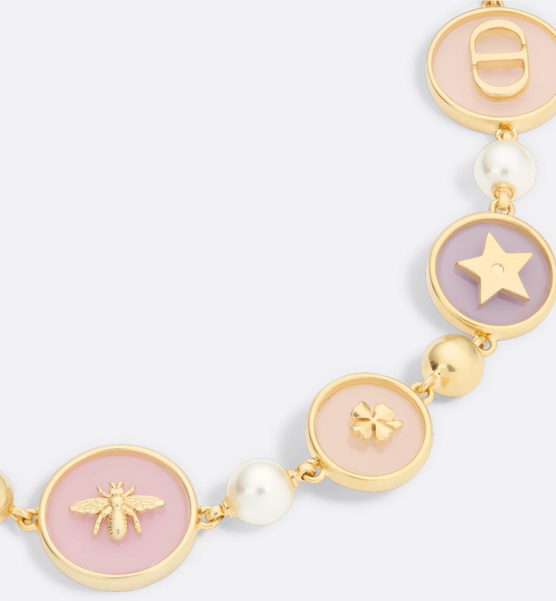 A stylish piece adorned with all of the Maison's favourite symbols. Crafted from gold-finish metal, it features white resin beads and a pastel-hued clear resin medallion. The medallion is embellished with a range of classic details including hearts, stars, four-leaf clovers, bees and the CD logo. Add a splash of colour to any look. CBK