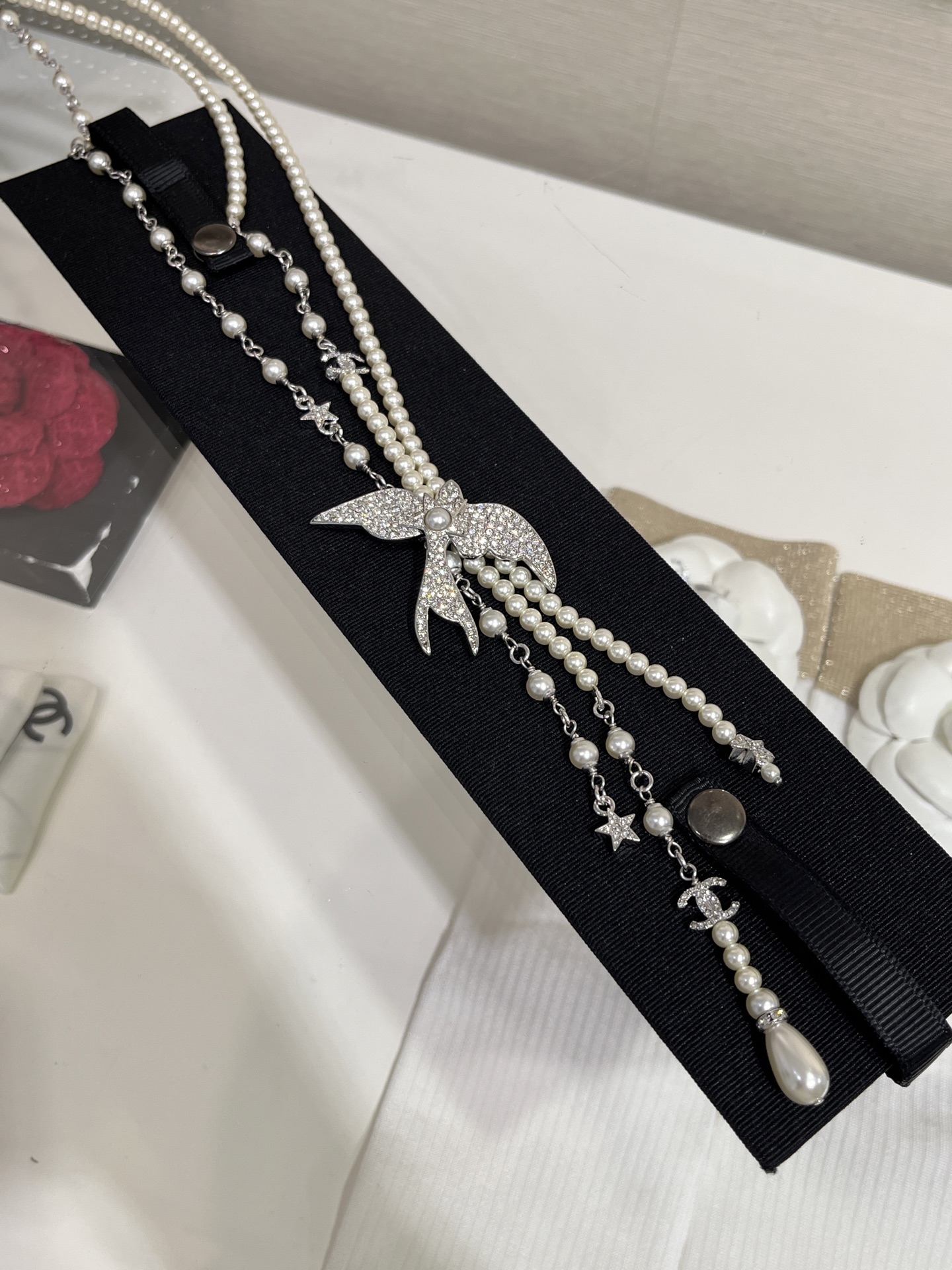 CHANEL 25S New Silver Bird-Inspired Double C Pearl Necklace / Sweater Chain
