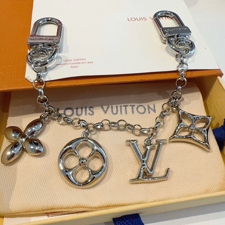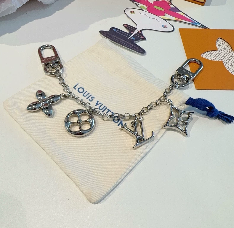 The delicately crafted LV Iconic bag charm brightens up a handbag with an array of House emblems. Suspended from a fine-linked chain in palladium-toned metal, the famous Monogram Flowers and LV Initials express an unmistakable signature. Easy to attach with its dual snap hooks, this elegant charm goes perfectly with everyday or more formal looks.