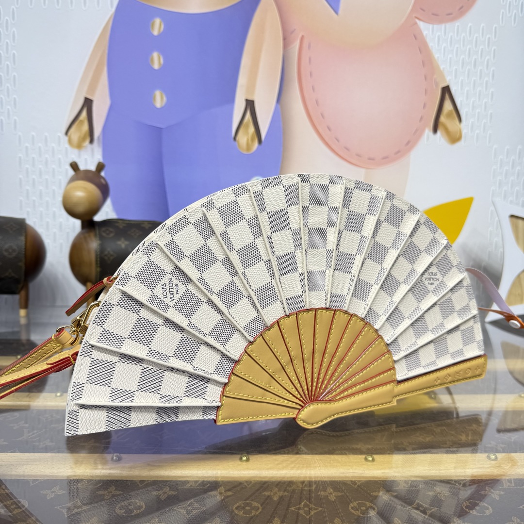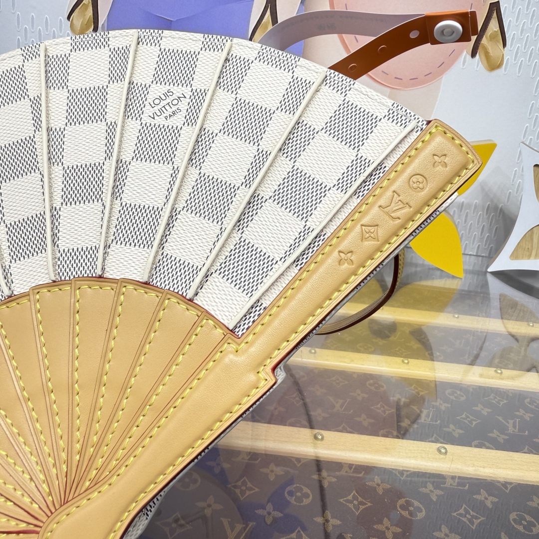 Introducing the LV Fan, a statement design that debuted on the Spring-Summer 2025 runway. This collector's piece is crafted from Monogram canvas. It can be worn cross-body or carried by hand. Note the Monogram flower signature detail on leather, which pay tribute to the House’s savoir-faire and legacy.