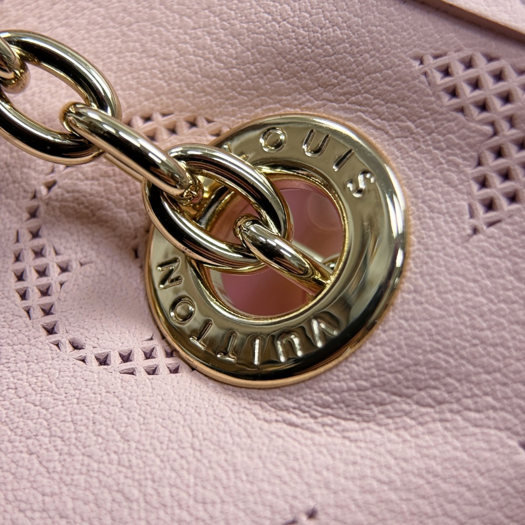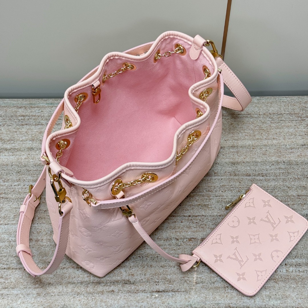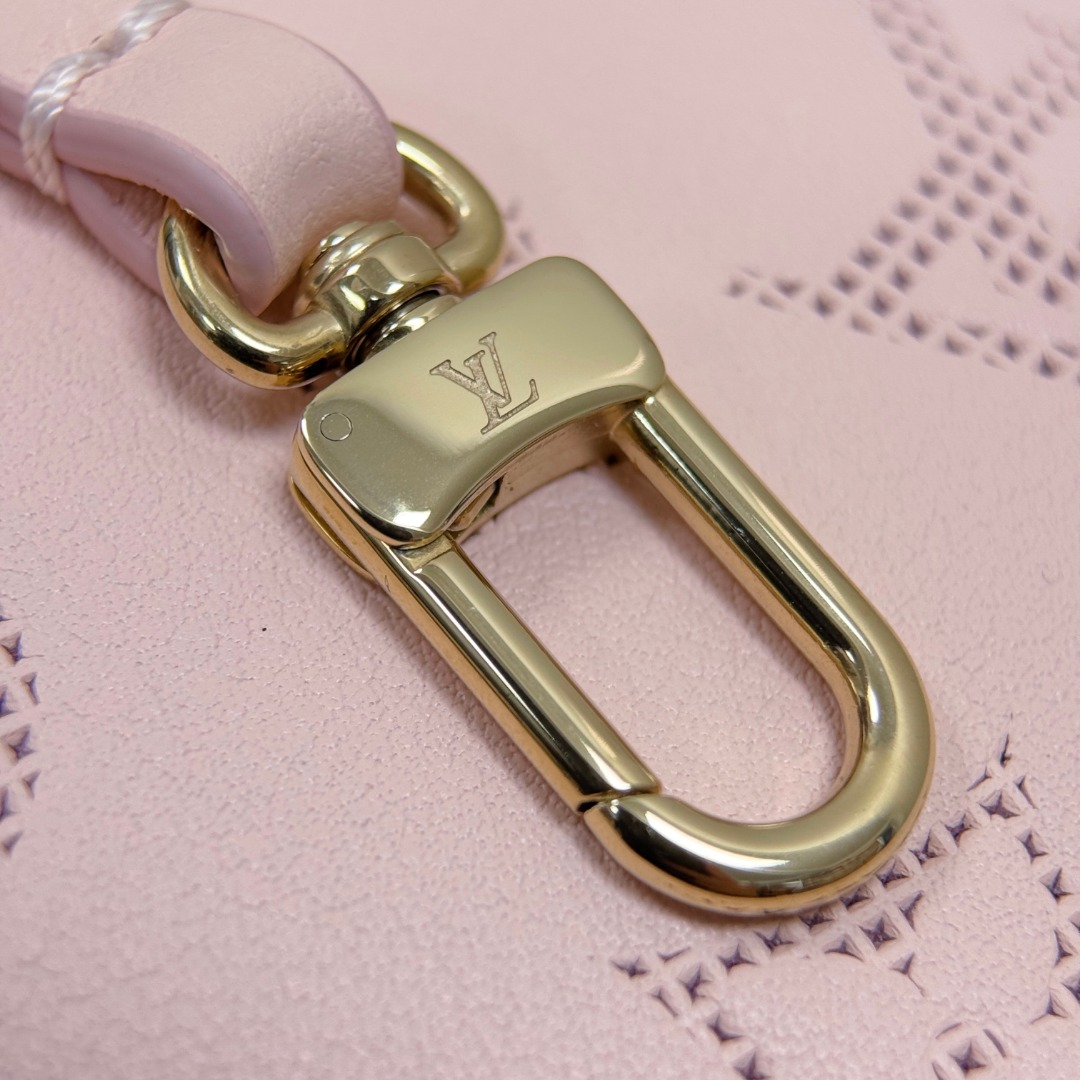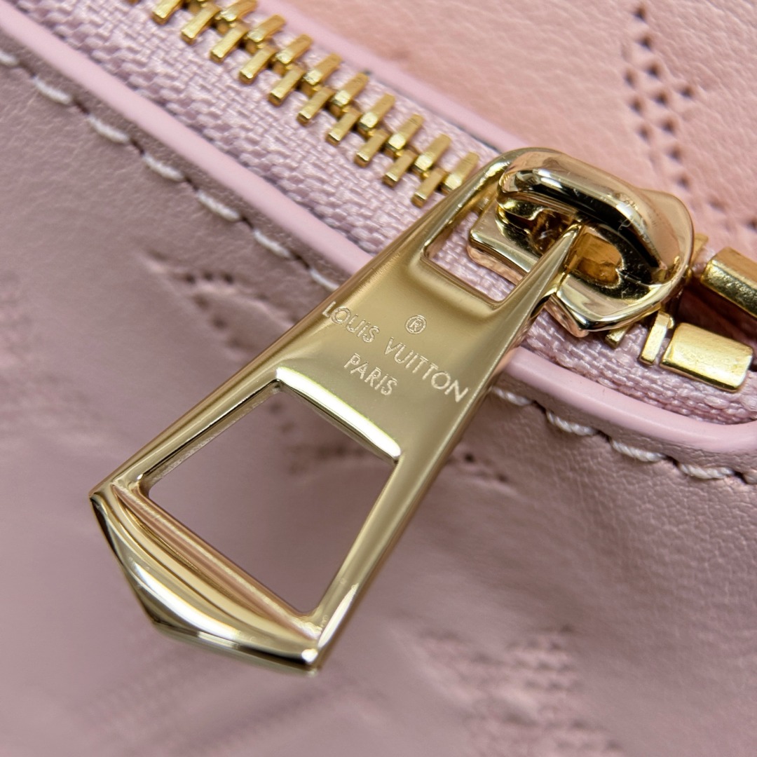 This LV Bundle handbag is made of calfskin and is designed with a new embossing process, which makes the Monogram embossed pattern appear like a hollow carving effect, while the soft tones and light gold metal parts inject a fashionable atmosphere into the handbag. The handbag also comes with a leather luggage tag embellished with Monogram flower charms, showing the brand's style.