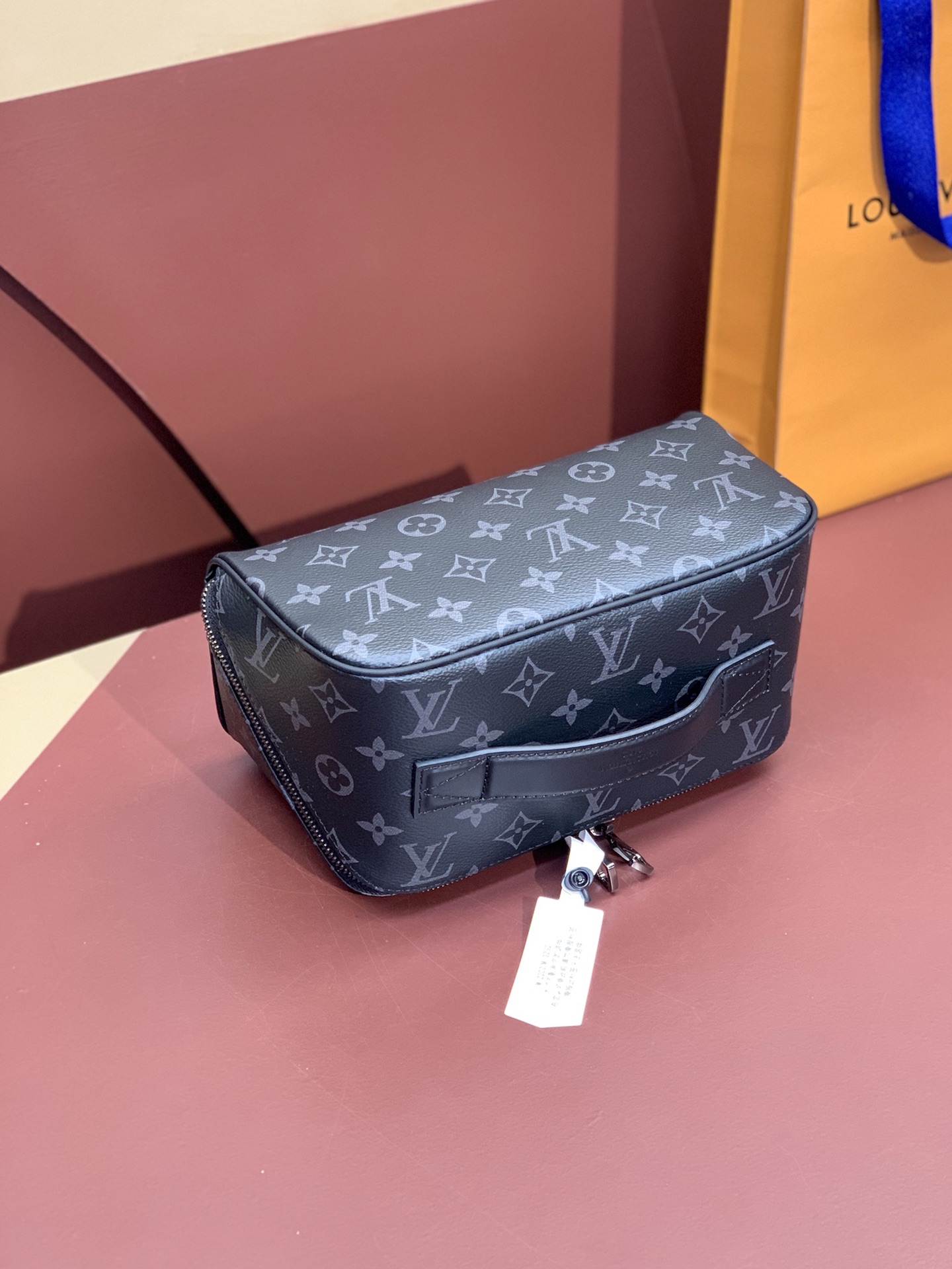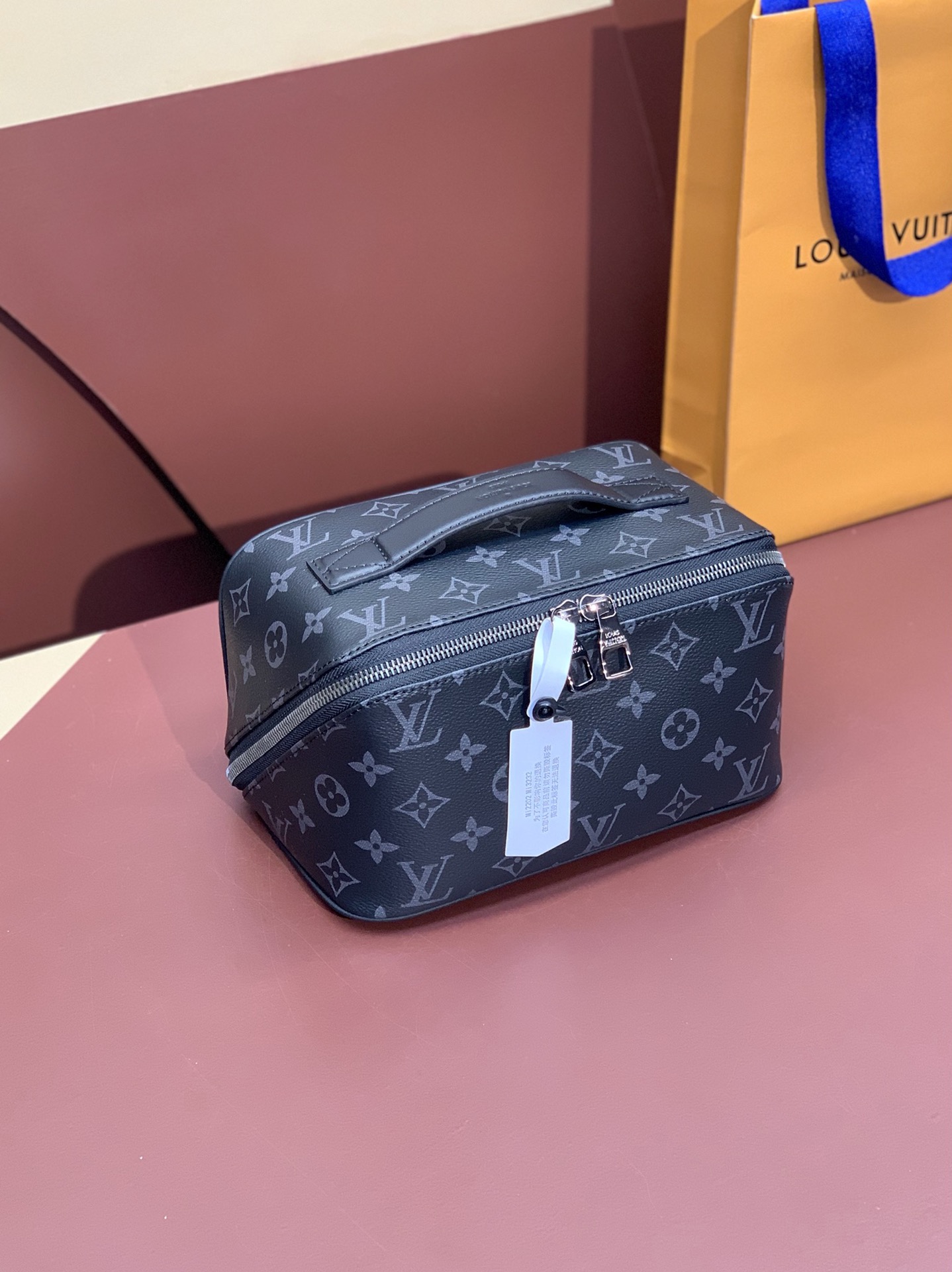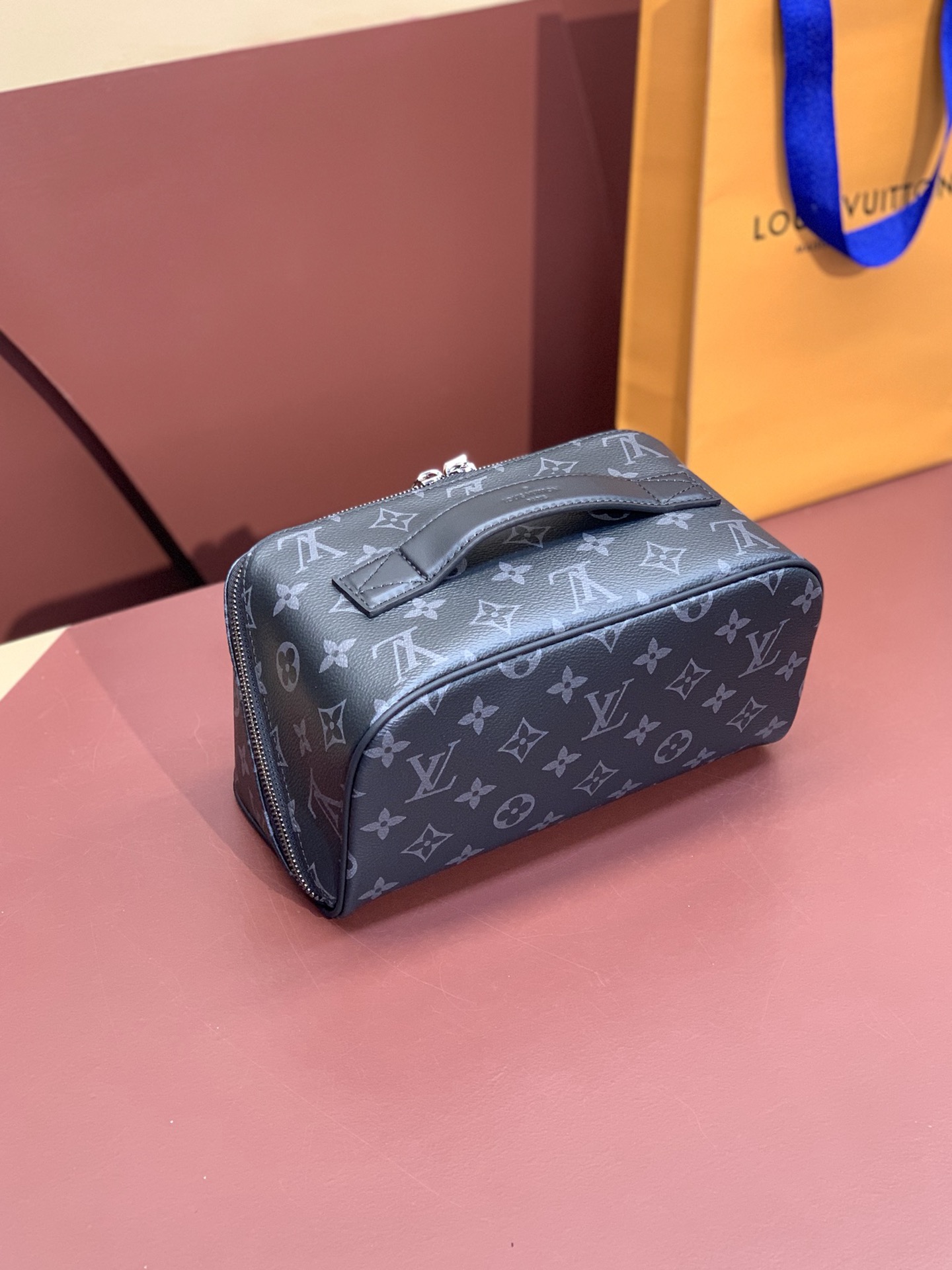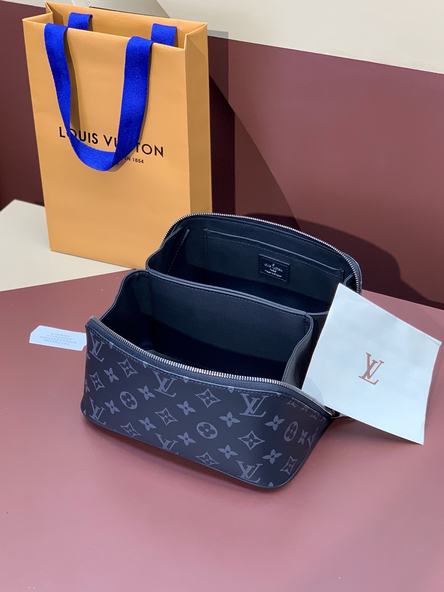 The Toiletry Bag 2 Compartments travel pouch is made from Monogram Eclipse coated canvas. Thanks to its extra-large opening, and inner gussets, the pouch offers two distinct inside compartments, ideal for carrying grooming products. Very functional, it features double-zip closure and a washable textile lining. The top handle makes it easy to carry.