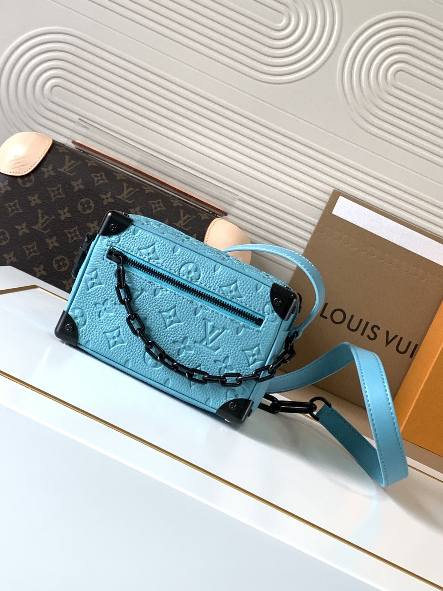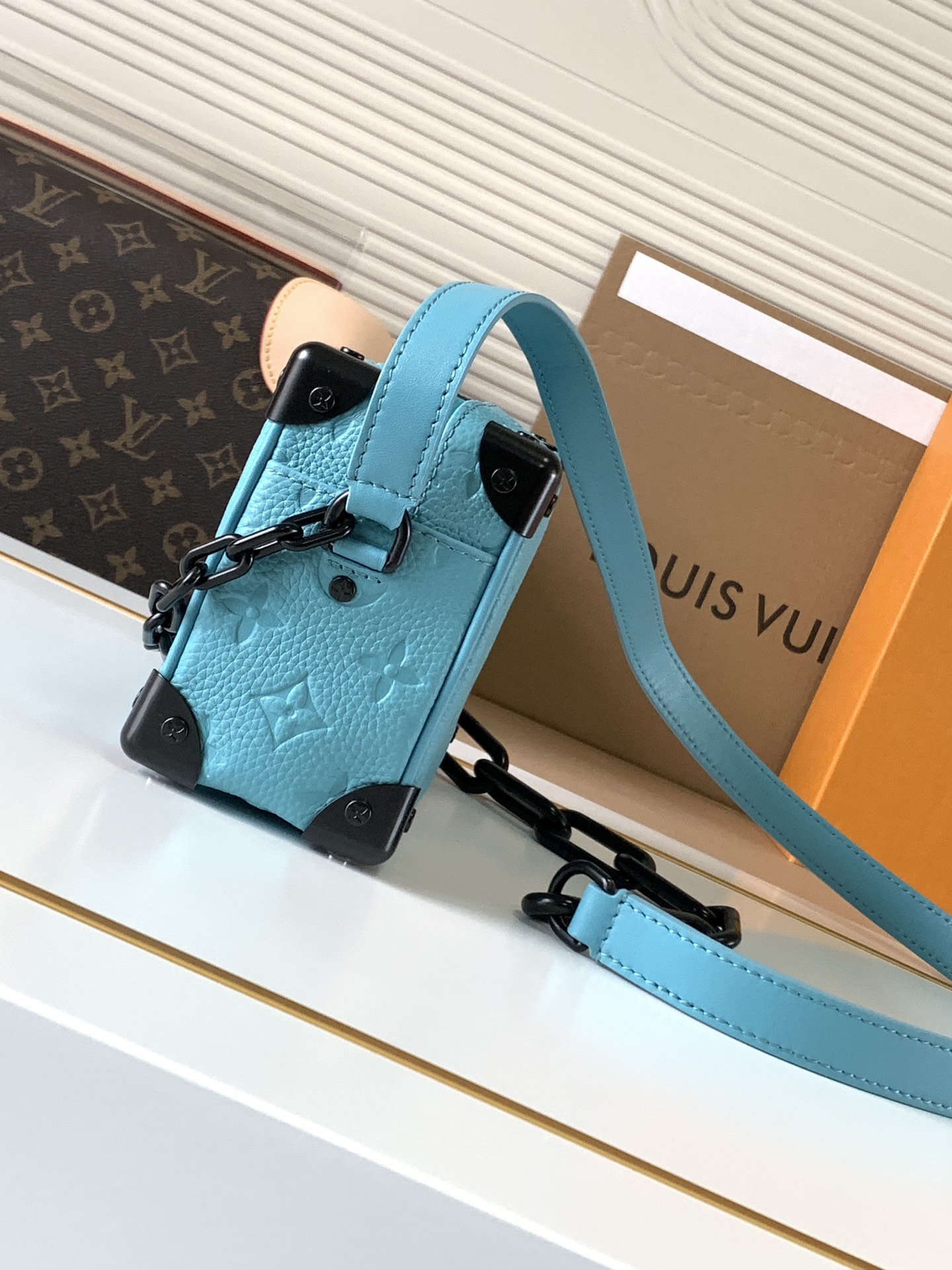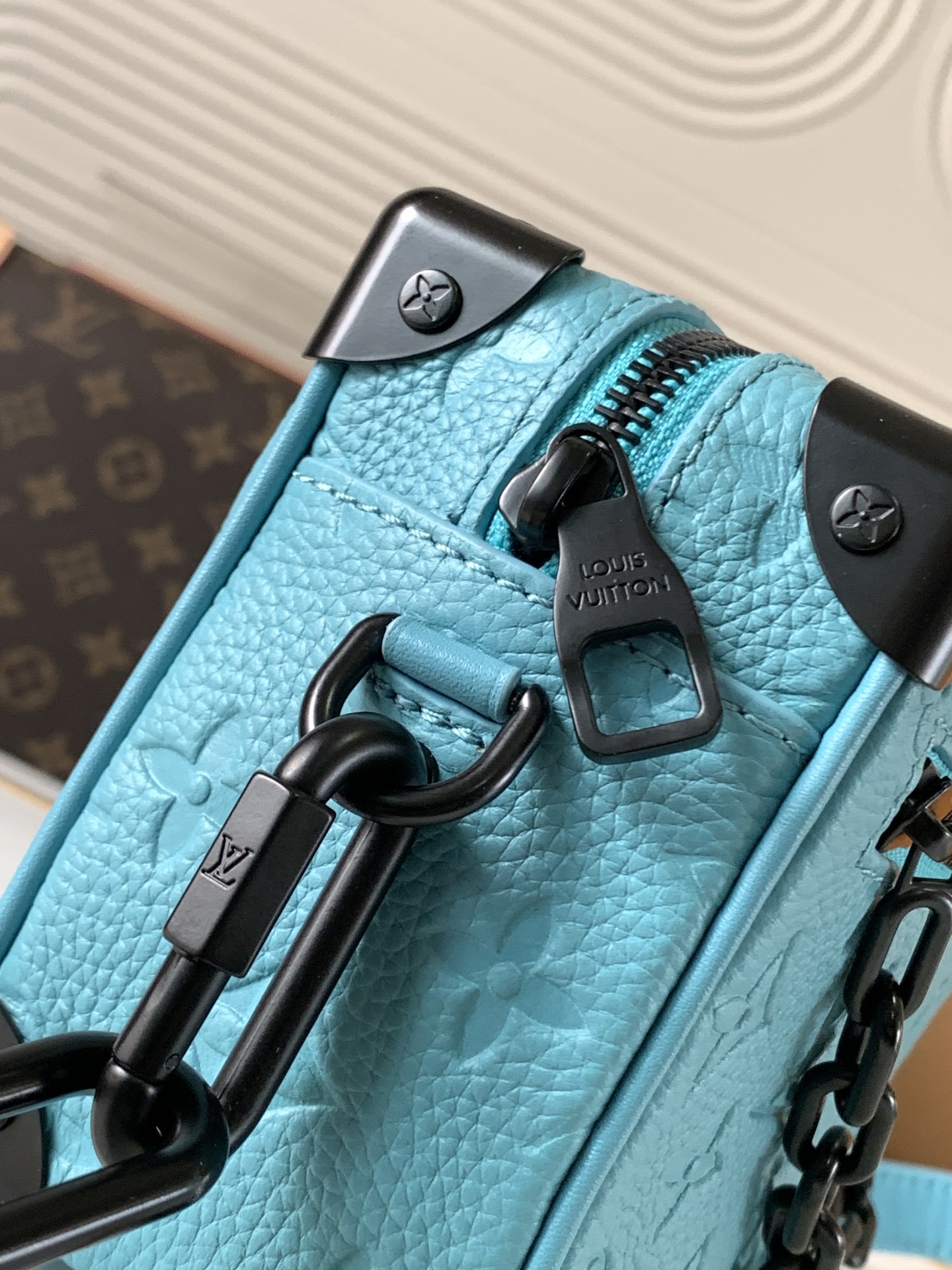 This Mini Soft Trunk bag is decorated with black metal parts in a vibrant Turquoise color scheme, making the design more fashionable and unique. The bag is made of Taurillon grain leather with a low-key Monogram embossed pattern. The reinforced corners, front chain strap details and adjustable chain strap are all made of geometric matte black, fully echoing Louis Vuitton's craftsmanship. Tradition.