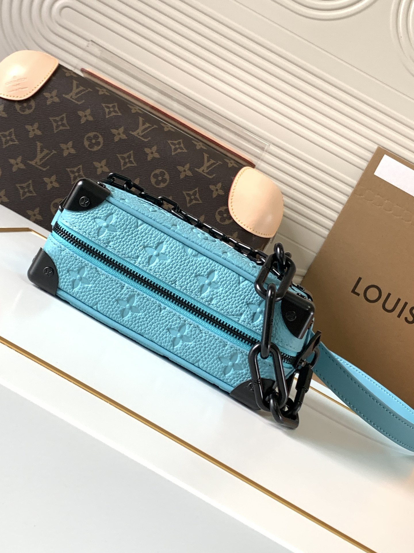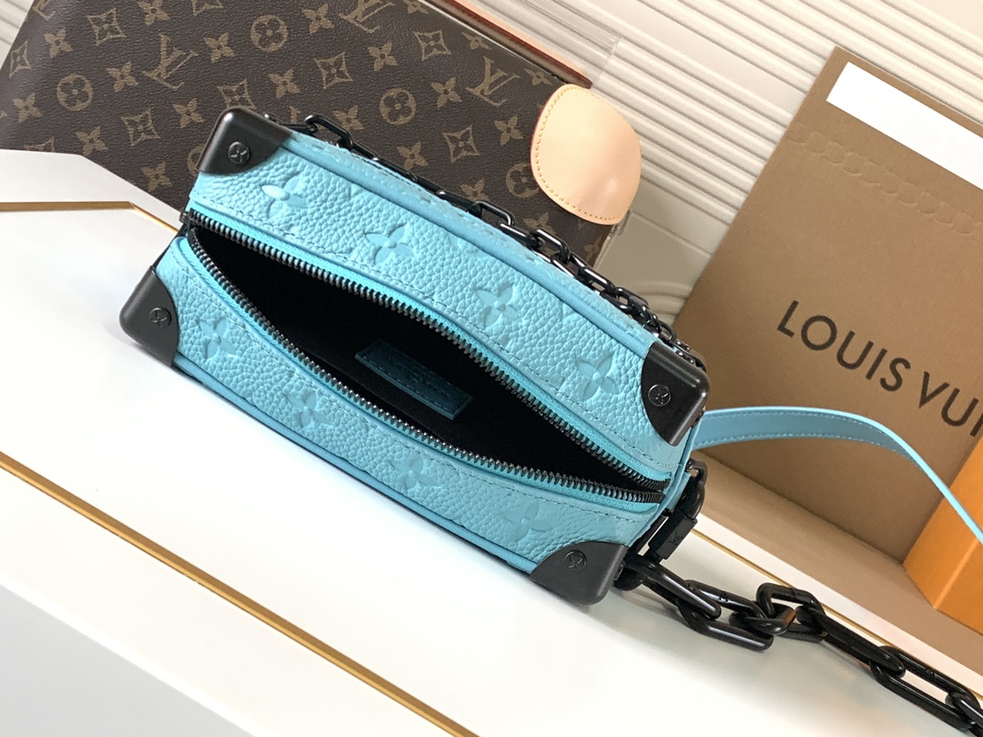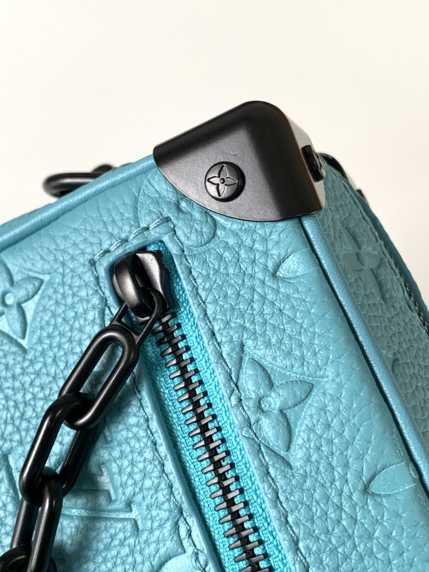 This Mini Soft Trunk bag is decorated with black metal parts in a vibrant Turquoise color scheme, making the design more fashionable and unique. The bag is made of Taurillon grain leather with a low-key Monogram embossed pattern. The reinforced corners, front chain strap details and adjustable chain strap are all made of geometric matte black, fully echoing Louis Vuitton's craftsmanship. Tradition.