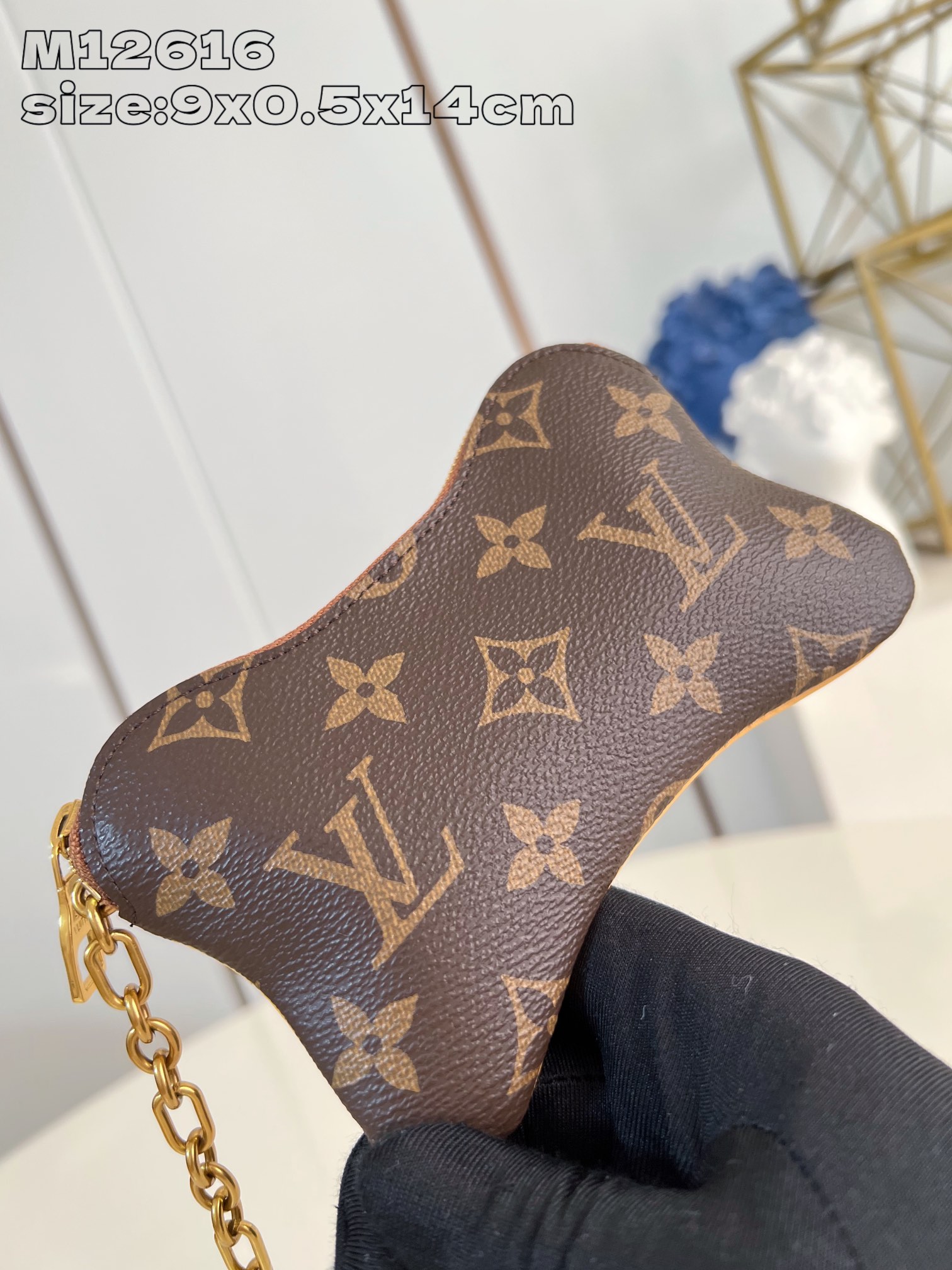 Designed by Pharrell Williams, this Bone Key Pouch interprets the brand's classic key coin purse in the shape of a dog bone. The practical accessory is made of Monogram canvas and can store cash, business cards and keys, and is equipped with a buckle for hanging on other bags.