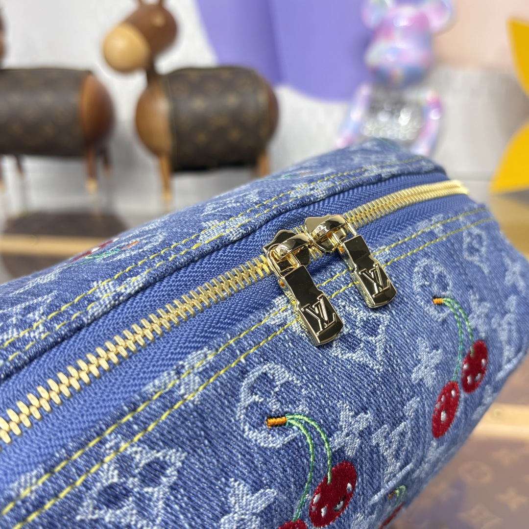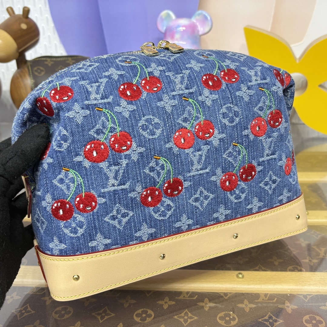 The Cosmetic Pouch GM is a spirited essential in Monogram denim detailed with kawaii cherry embroidery as part of the re-edition of the cross-category Louis Vuitton x Takashi Murakami collection. Golden studs add a rebellious touch to the natural leather trim, while the extra-wide zipper opening and removable washable lining underscore the practicality.