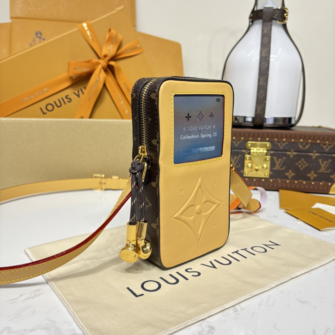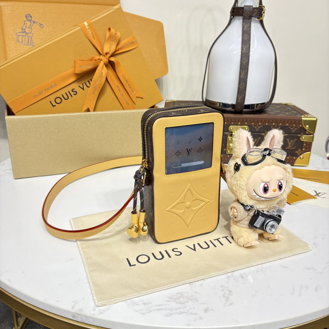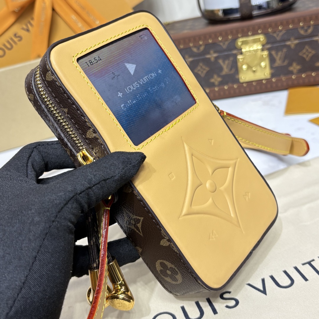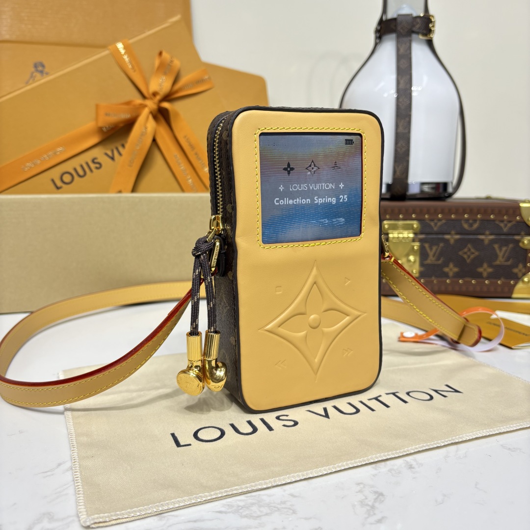 The Music Player Wearable Wallet is fashioned from cowhide leather and Monogram canvas and lined in black textile. Evocative of a vintage digital music player, it features an LV Blossom as the interface and a faux screen proposing a LV dashboard. Fitted with a zip opening, it can hold a phone, card holder, and keys.