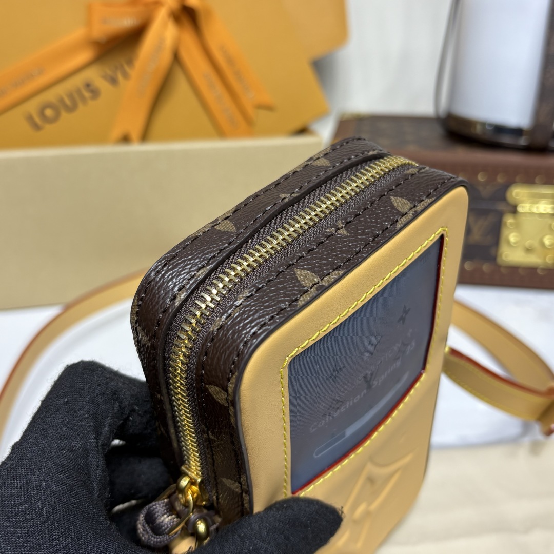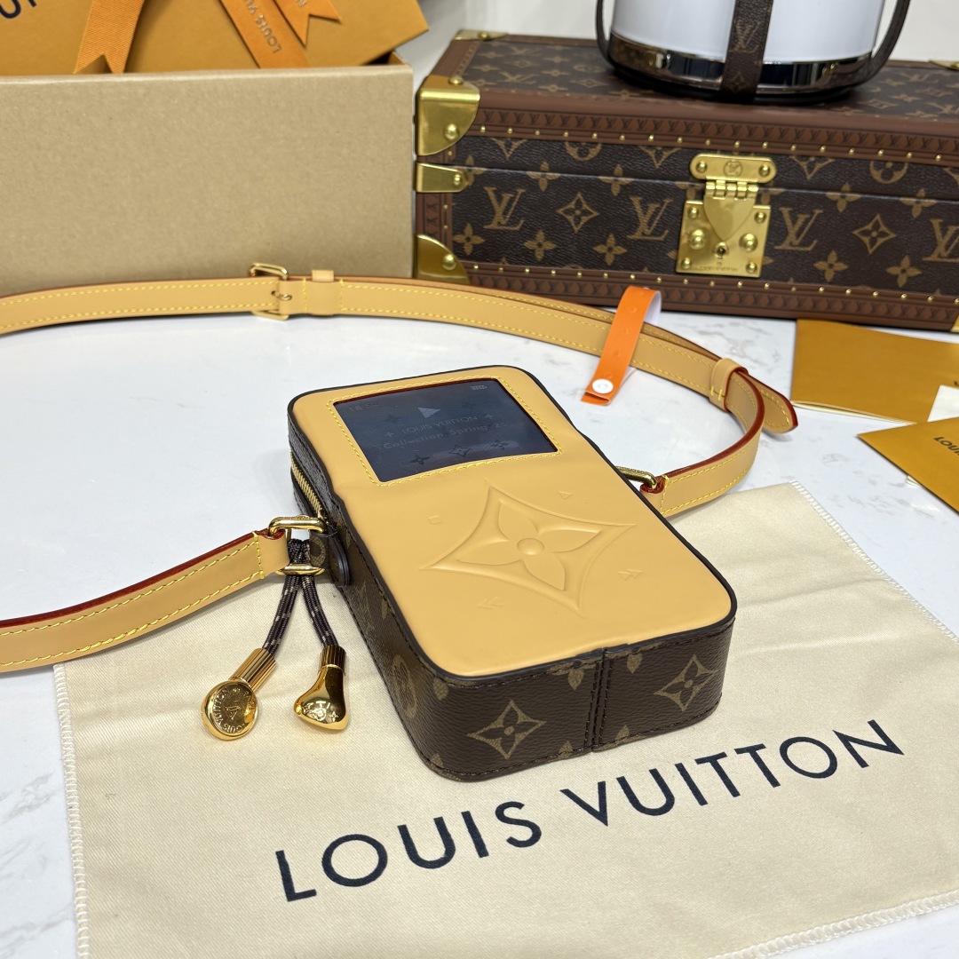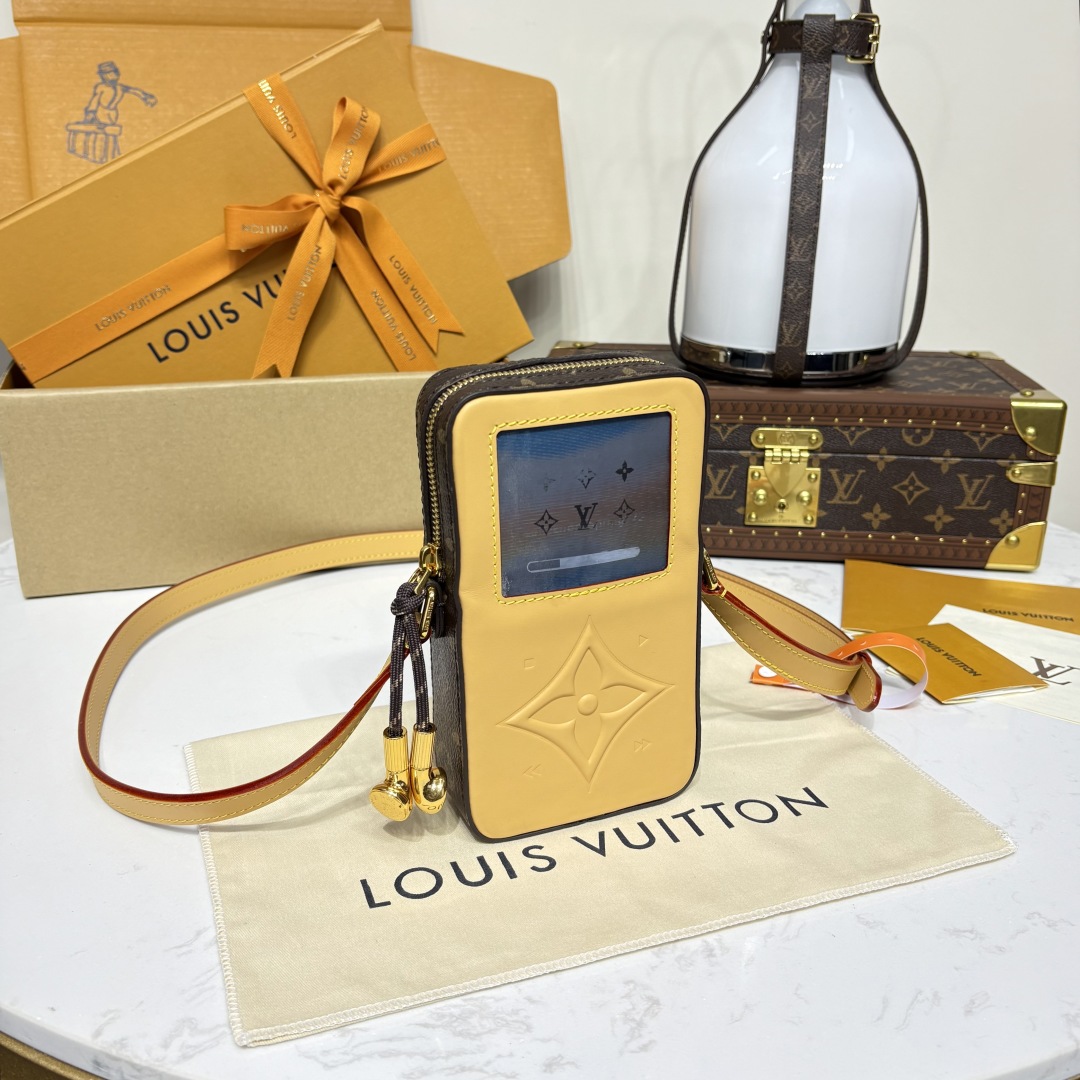 The Music Player Wearable Wallet is fashioned from cowhide leather and Monogram canvas and lined in black textile. Evocative of a vintage digital music player, it features an LV Blossom as the interface and a faux screen proposing a LV dashboard. Fitted with a zip opening, it can hold a phone, card holder, and keys.