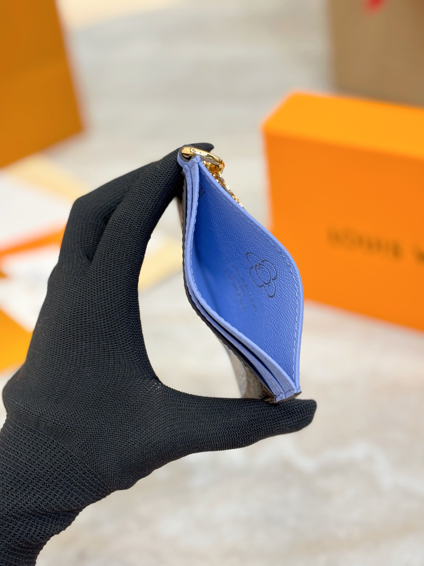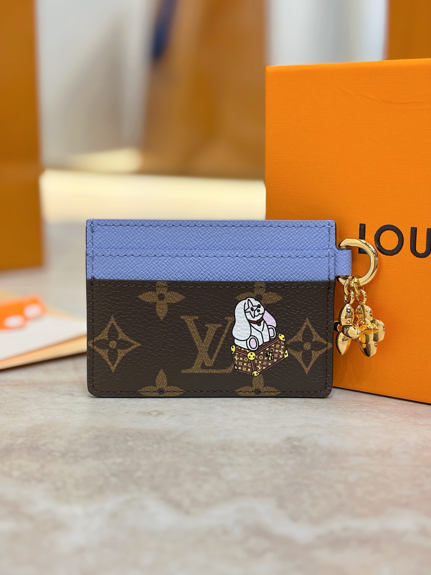 This LV Charms Card Holder is brought to life with the House’s iconic and adorable Vivienne mascot. It is crafted from signature Monogram canvas decorated with playful illustrations and features a contrasting Blue Frost leather trim. Designed with multiple card slots, the charming accessory is finished with a Vivienne-shaped charm and a classic LV Flower.