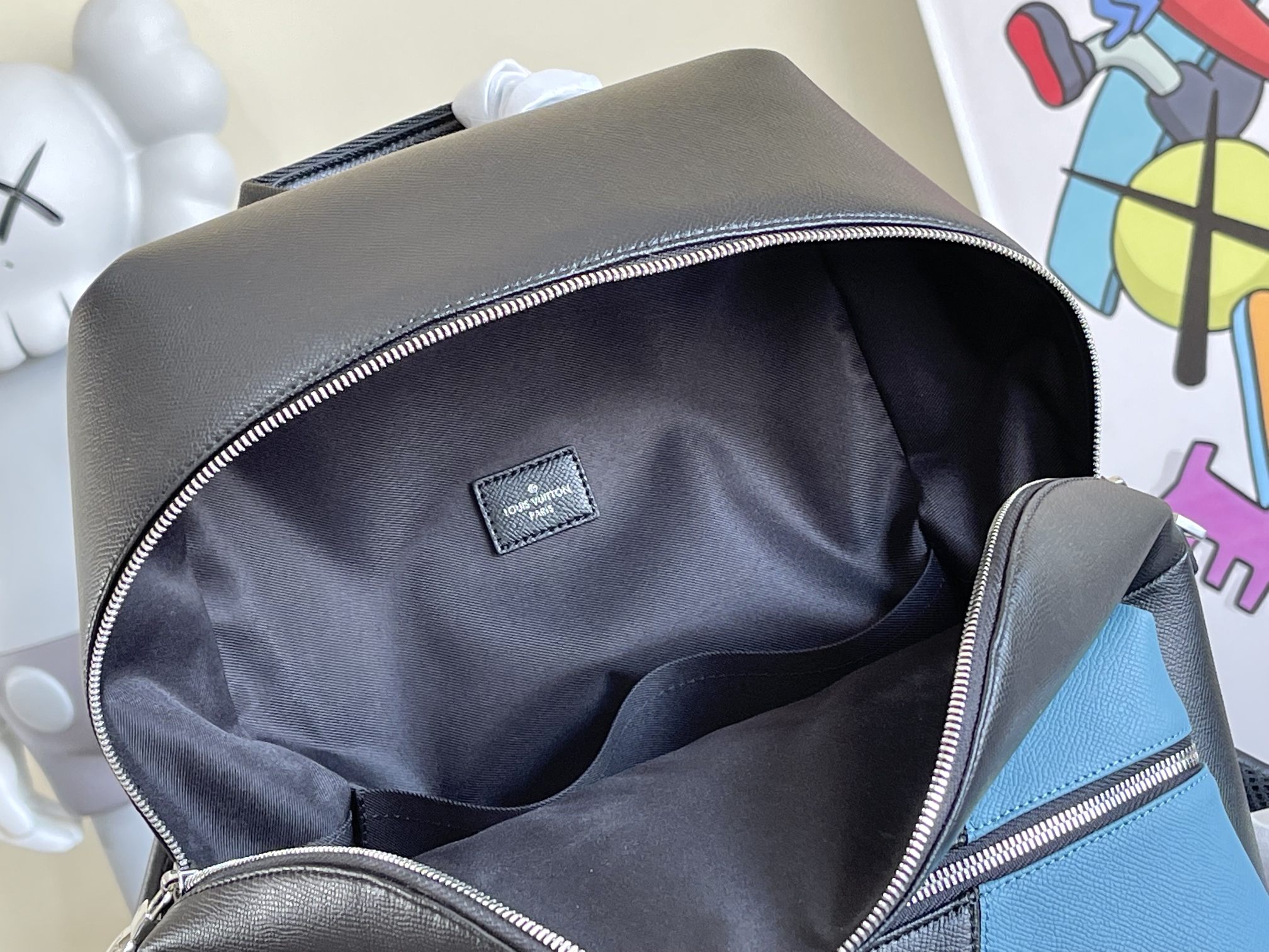 The LV M30735 Discovery Backpack PM features the 2020 Damier Cobalt Race canvas, highlighted with vibrant orange accents and a dynamic Louis Vuitton signature, capturing the spirit of motorsport. The sleek silhouette is enhanced with leather trims and silver-tone hardware, while the spacious interior and adjustable shoulder straps offer a comfortable and practical carrying experience.