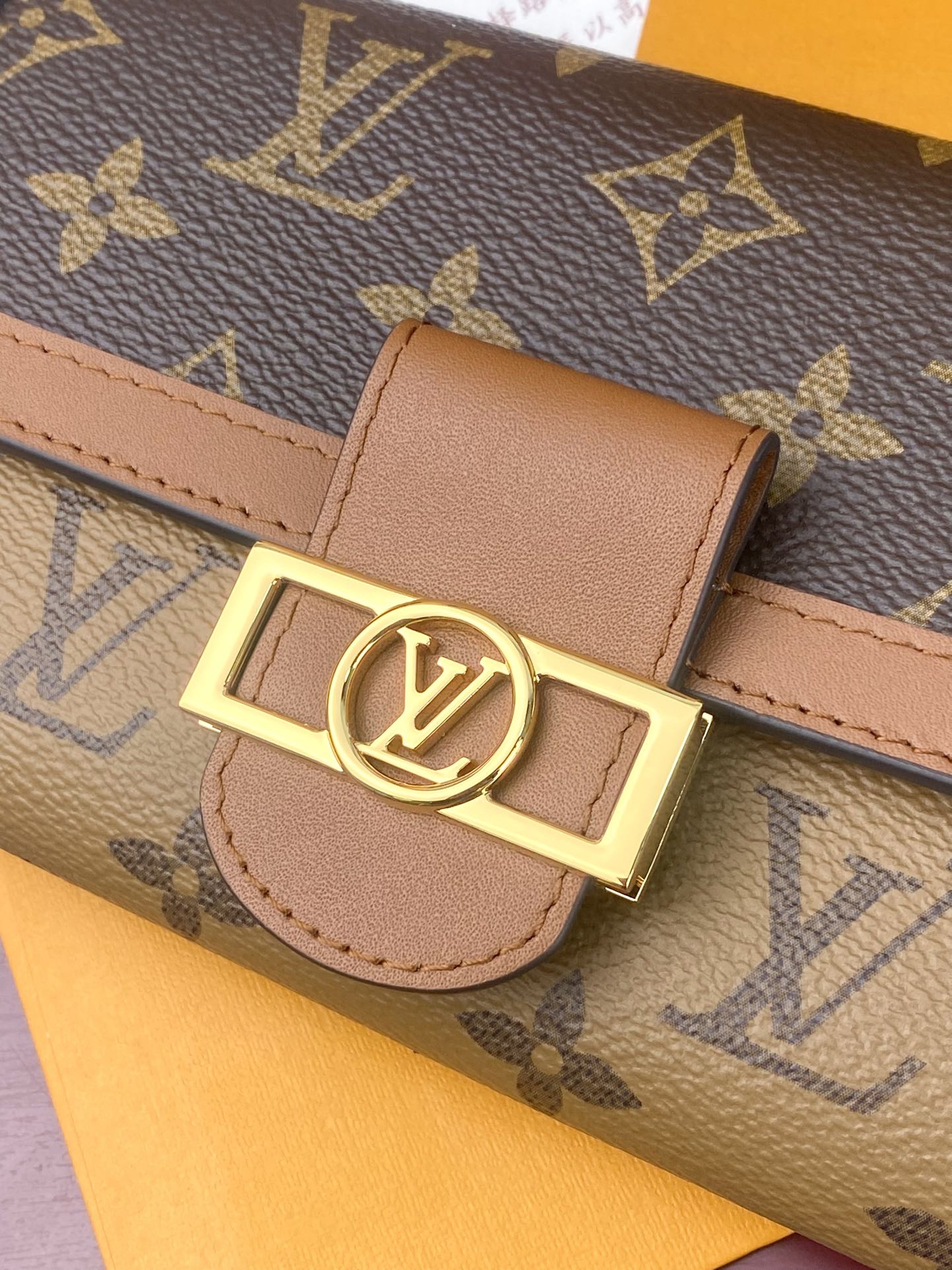 The Sarah Dauphine wallet revisits the classic Sarah flap wallet with the refined signatures of the Dauphine line: the combination of Monogram and Monogram Reverse canvas, the calf-leather trim and the vintage-look LV Circle clasp. This elevated design offers an array of practical features, including 12 card slots and a zipped coin pocket in Monogram Reverse canvas.
