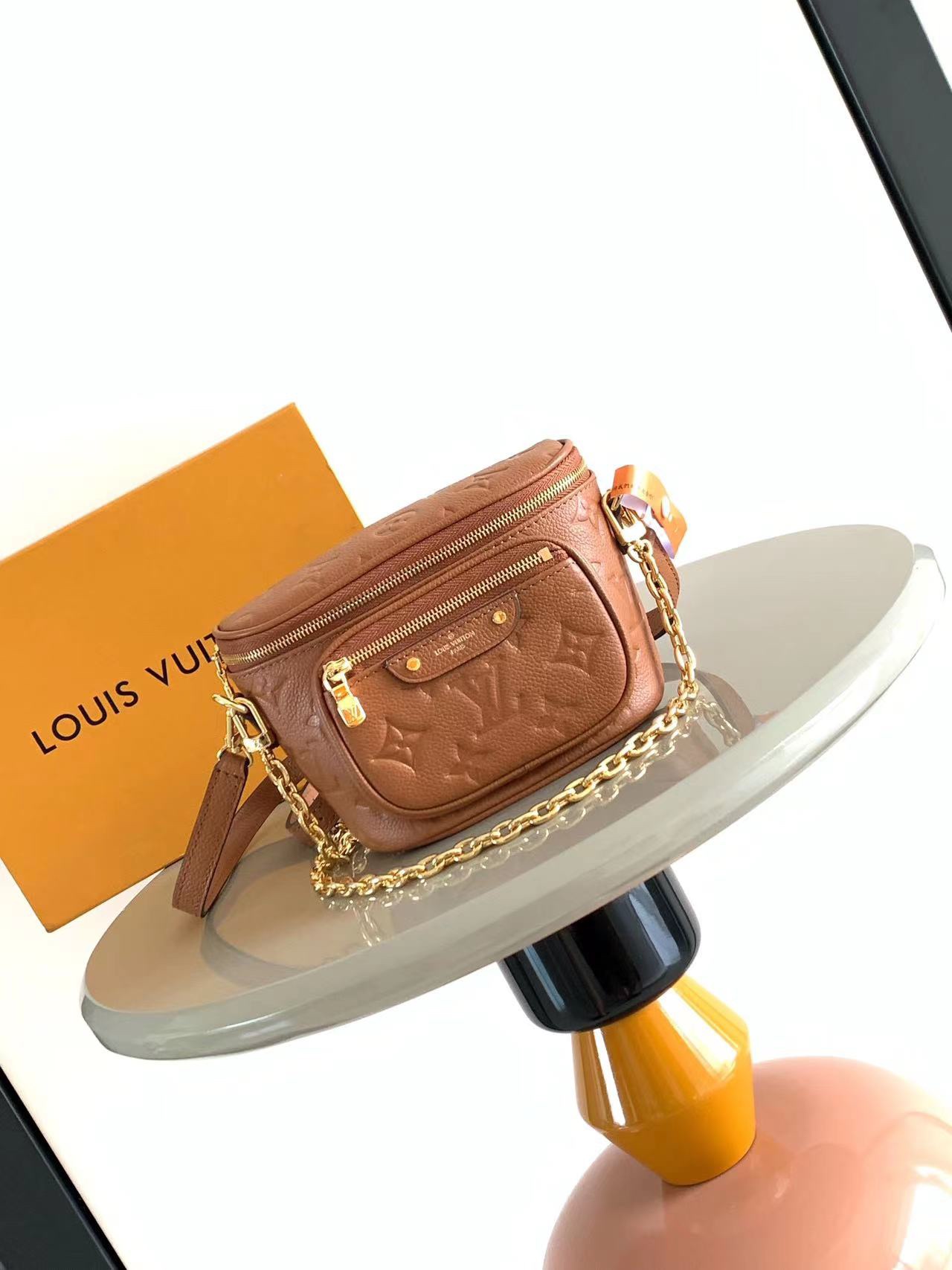 This Mini Bumbag from the Gradient collection is a Monogram embossed render of Monogram Empreinte leather in gradient midsummer colors. The trendy configuration features a zippered main compartment and a Louis Vuitton leather label adorning the front pocket. With a detachable chain and removable and adjustable shoulder strap, the shoulder and back crossbody can be changed freely.