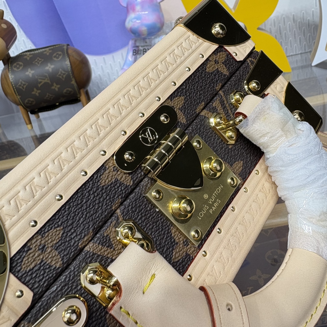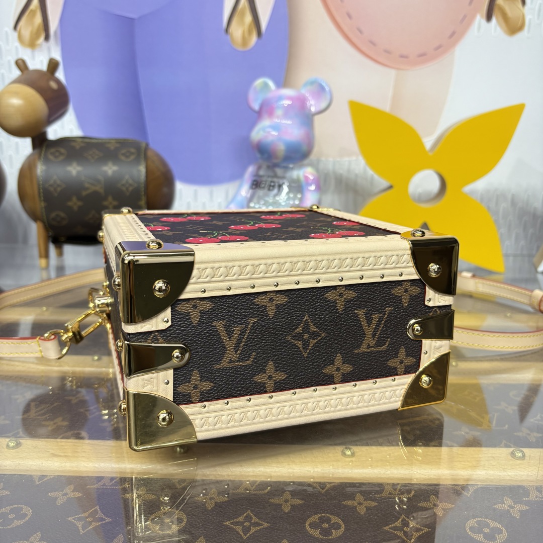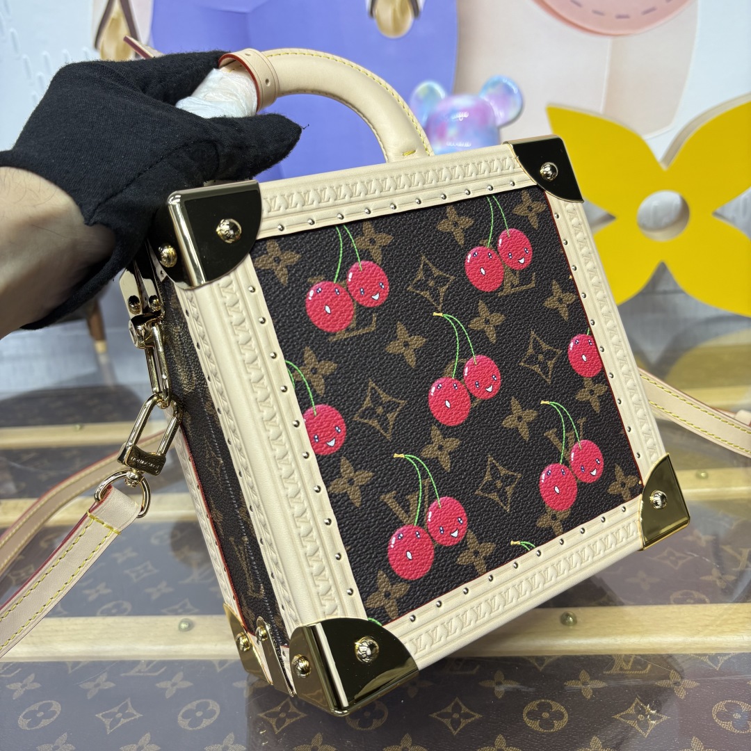 Projecting timeless House codes in playful proportions, the Mini Square Trunk is clad in classic Monogram coated canvas detailed with kawaii cherry motifs as part of the spirited second edition of the Louis Vuitton x Takashi Murakami collection. The edges are trimmed with natural cowhide leather and finished with gleaming golden hardware, including riveted corners. A curvaceous top handle and removable strap offer multiple carry options.