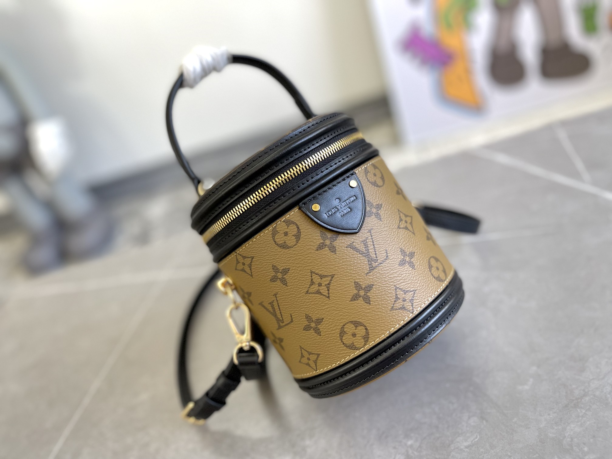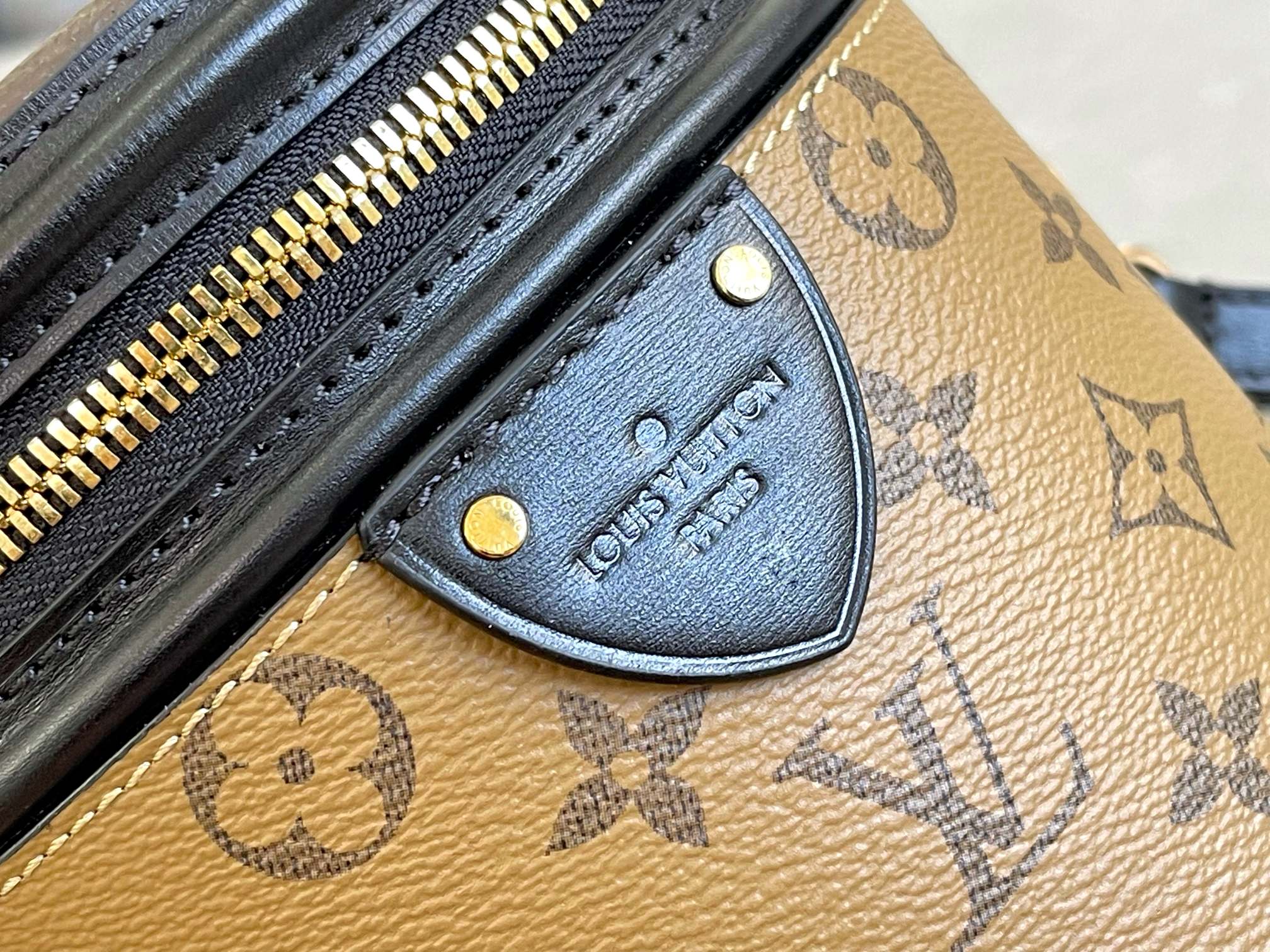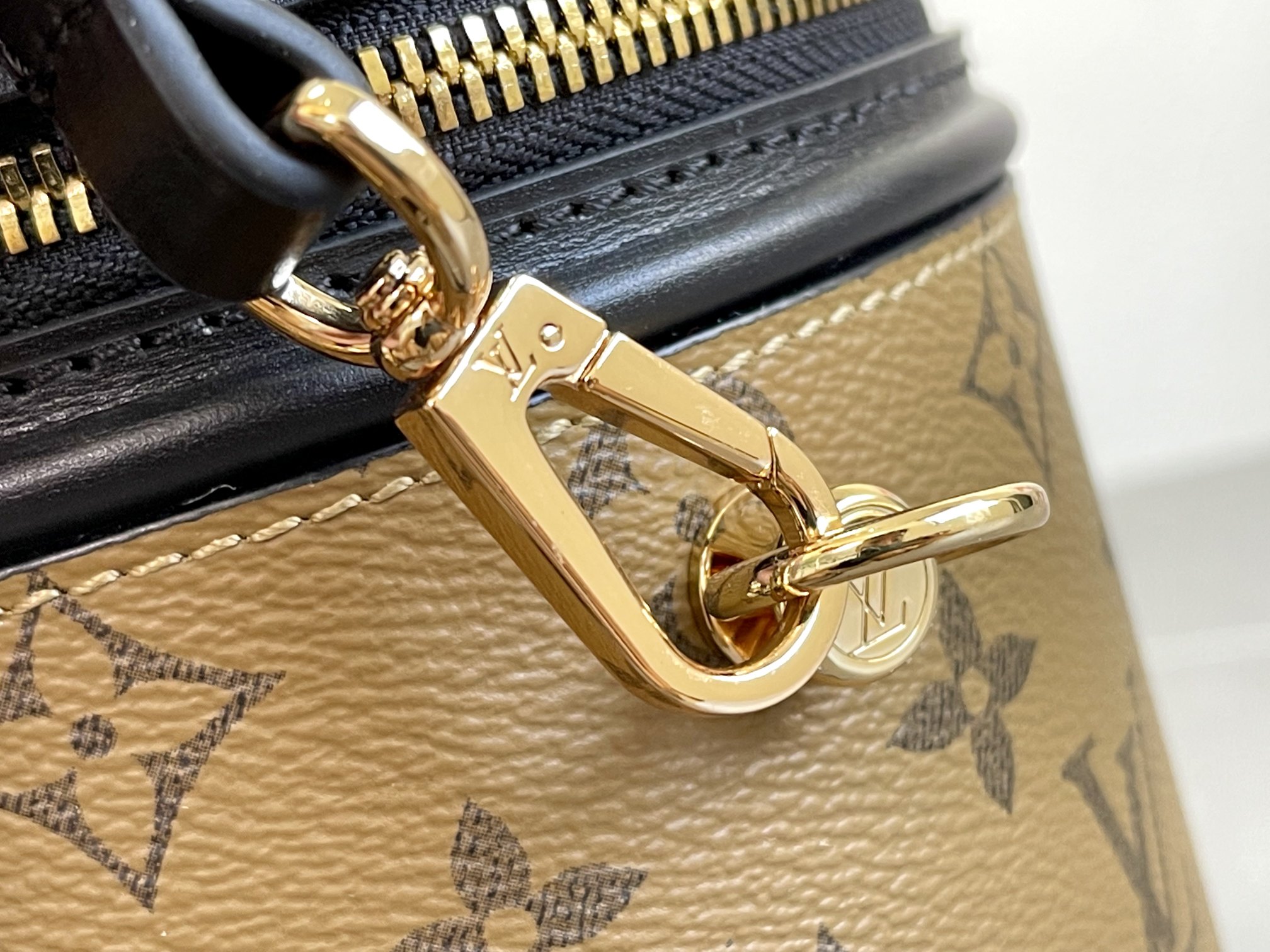 Featuring the historical shape of the Louis Vuitton Cannes beauty case, designer Nicolas Ghesquière revives a long-standing classic with the Cannes handbag. Petite in size and presented in a mix of Monogram and Monogram reverse coated canvas, the elegant piece reanimates a traditional silhouette steeped in Louis Vuitton heritage. A removable leather strap and top handle provide a range of carrying options.