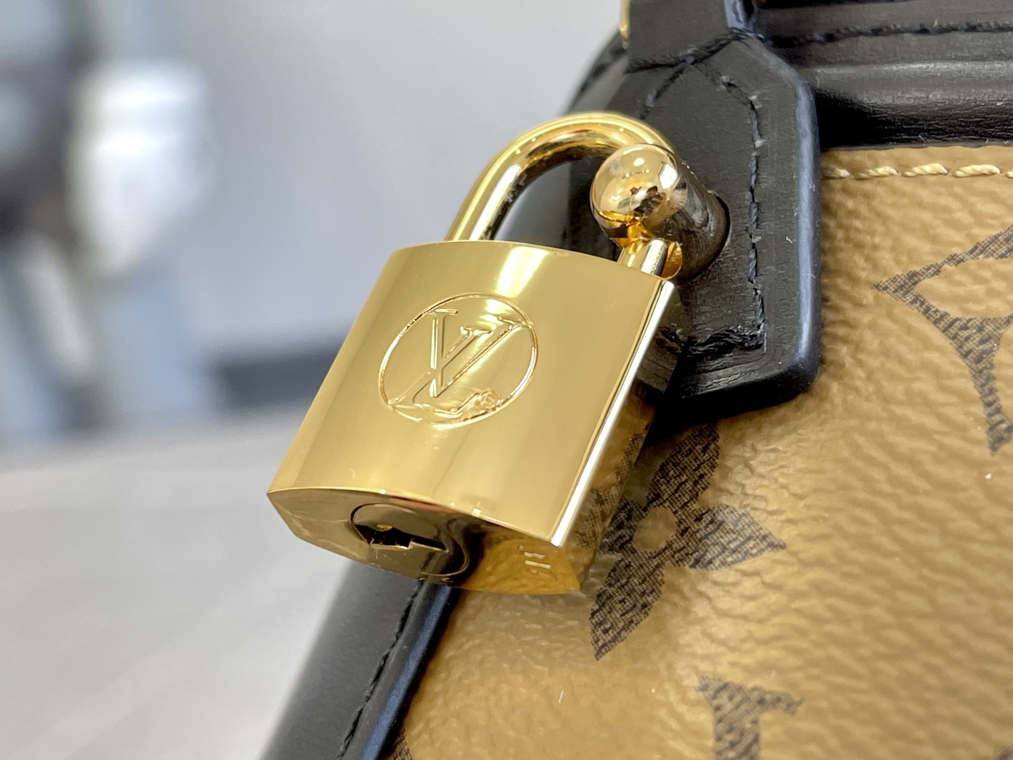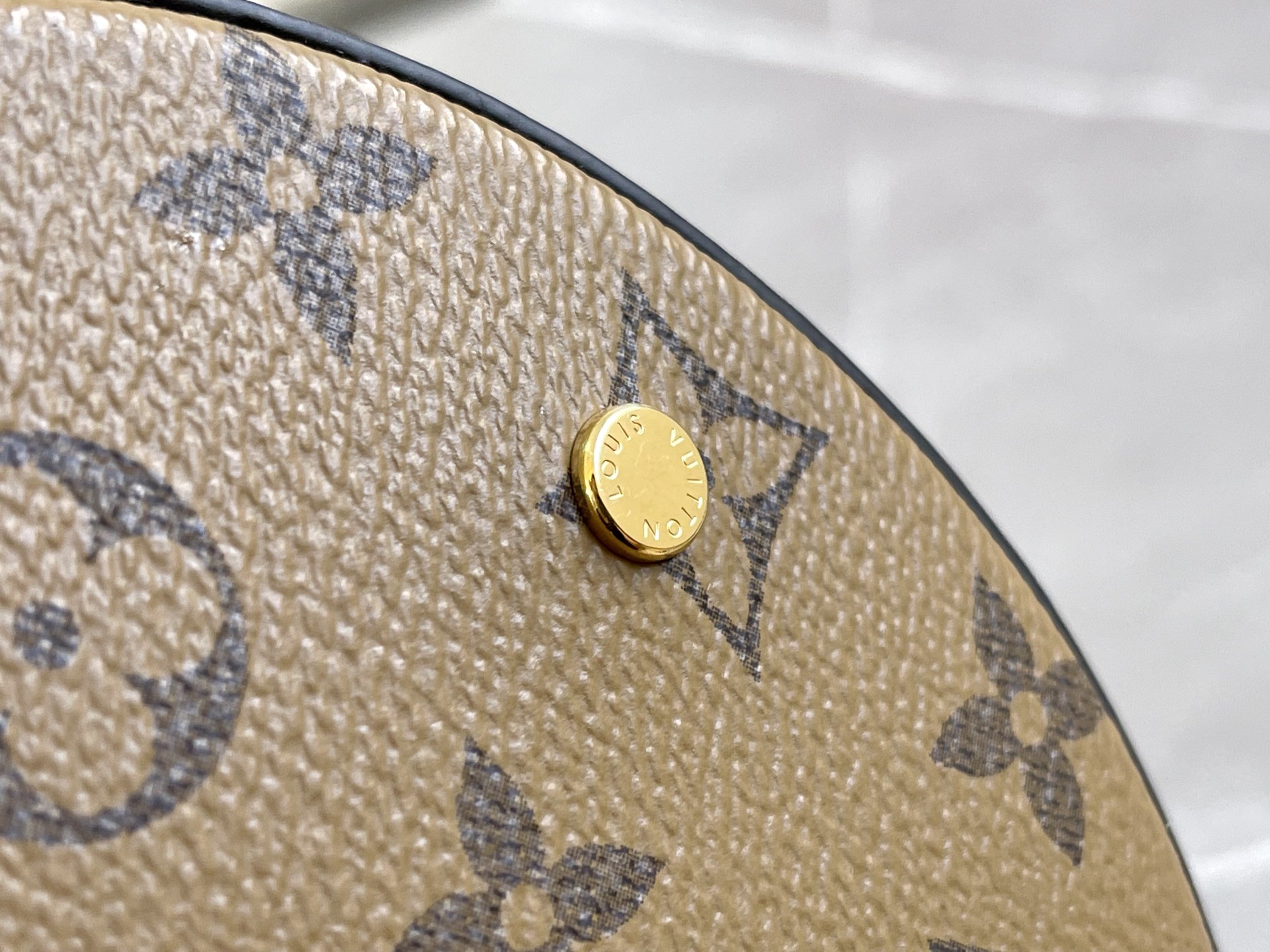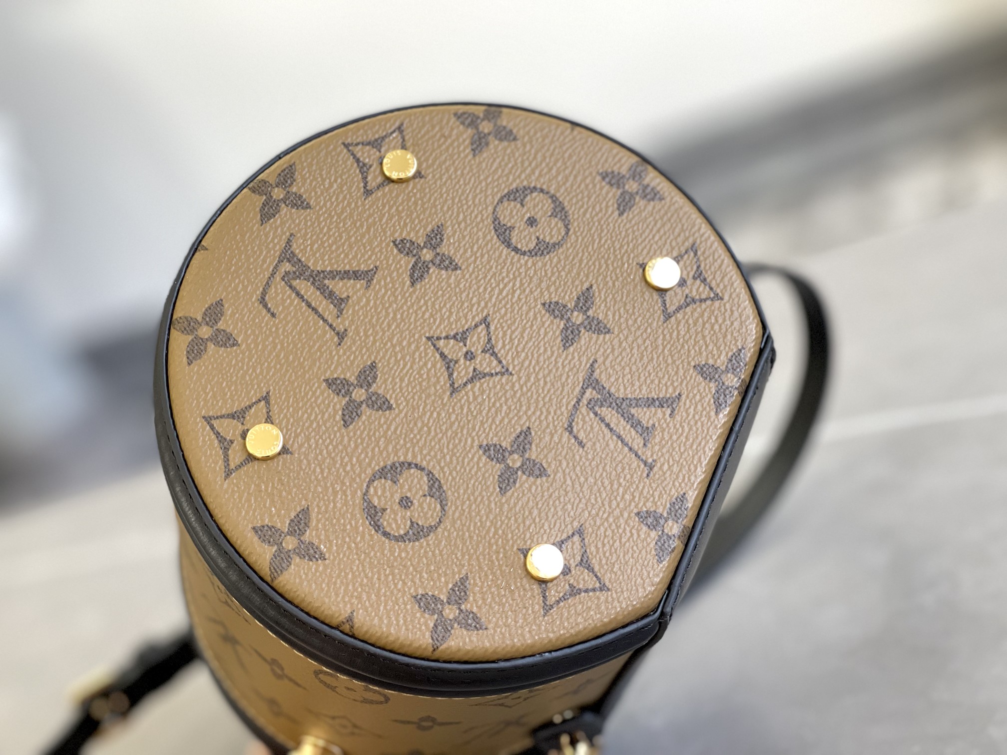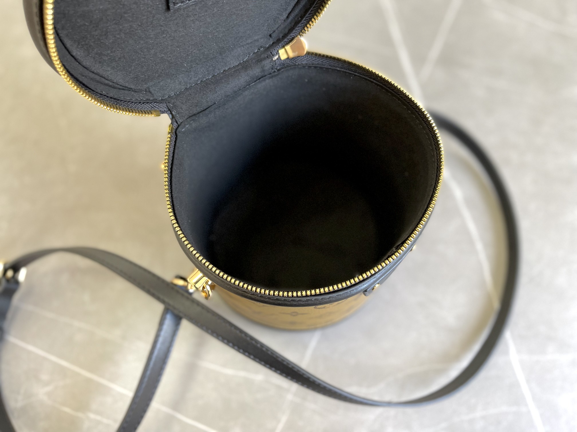Featuring the historical shape of the Louis Vuitton Cannes beauty case, designer Nicolas Ghesquière revives a long-standing classic with the Cannes handbag. Petite in size and presented in a mix of Monogram and Monogram reverse coated canvas, the elegant piece reanimates a traditional silhouette steeped in Louis Vuitton heritage. A removable leather strap and top handle provide a range of carrying options.