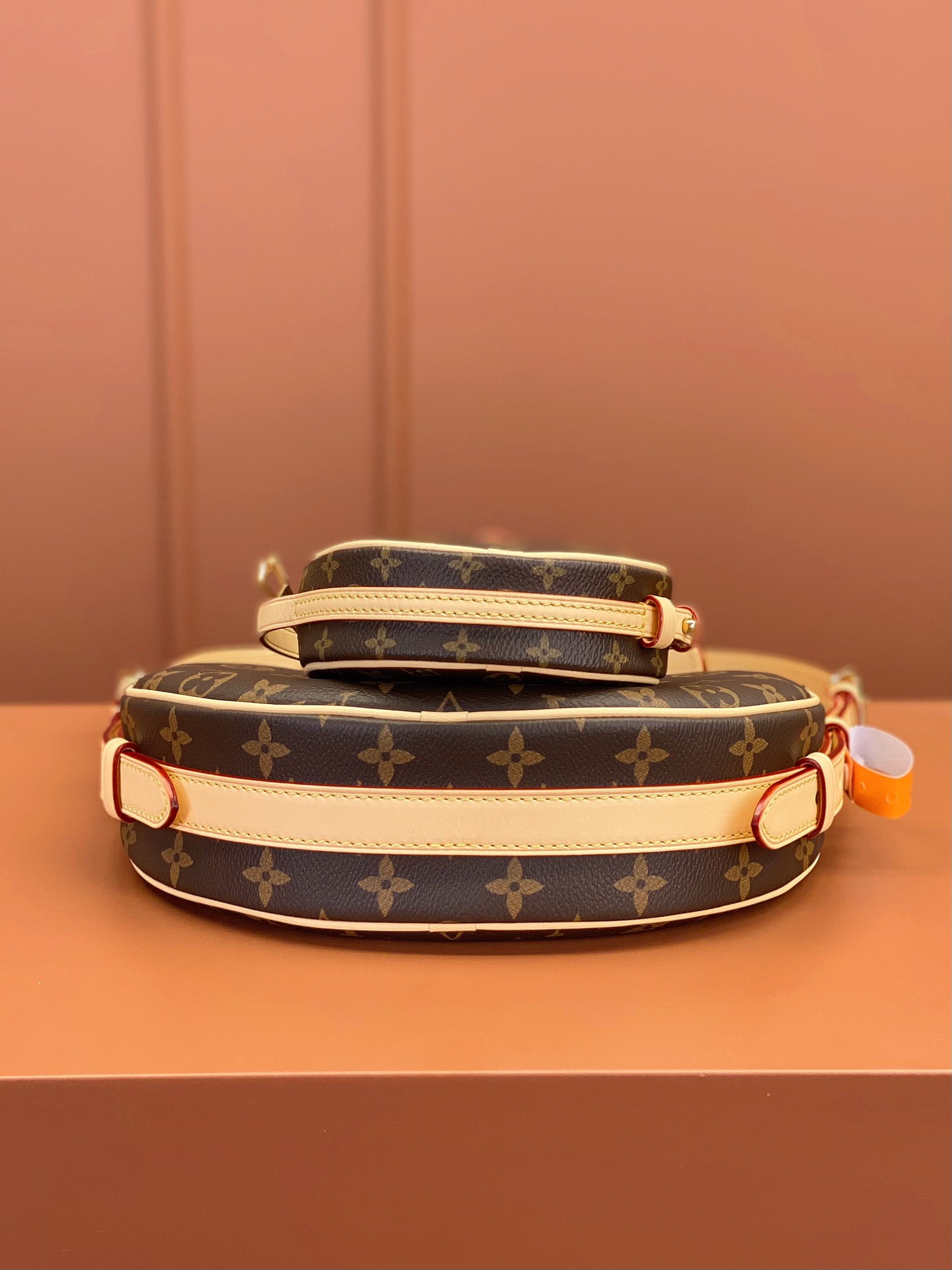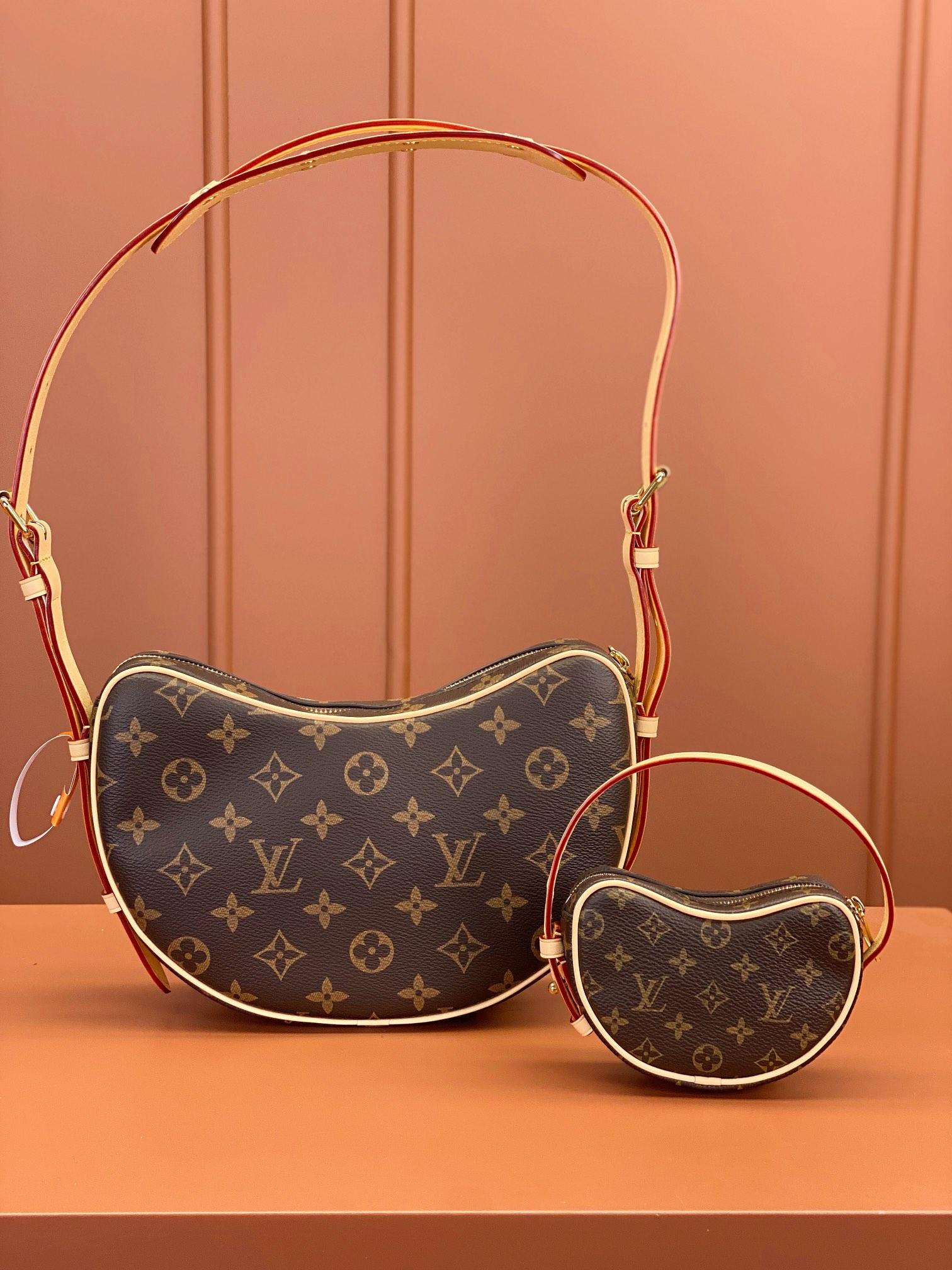 The Croissant MM handbag is made from Monogram coated canvas with natural cowhide-leather trim and comes with an adorable miniature version of the same bag. Thanks to its removable and adjustable strap, this versatile bag can be worn cross-body, short- or long-shoulder, and with or without the matching mini bag.