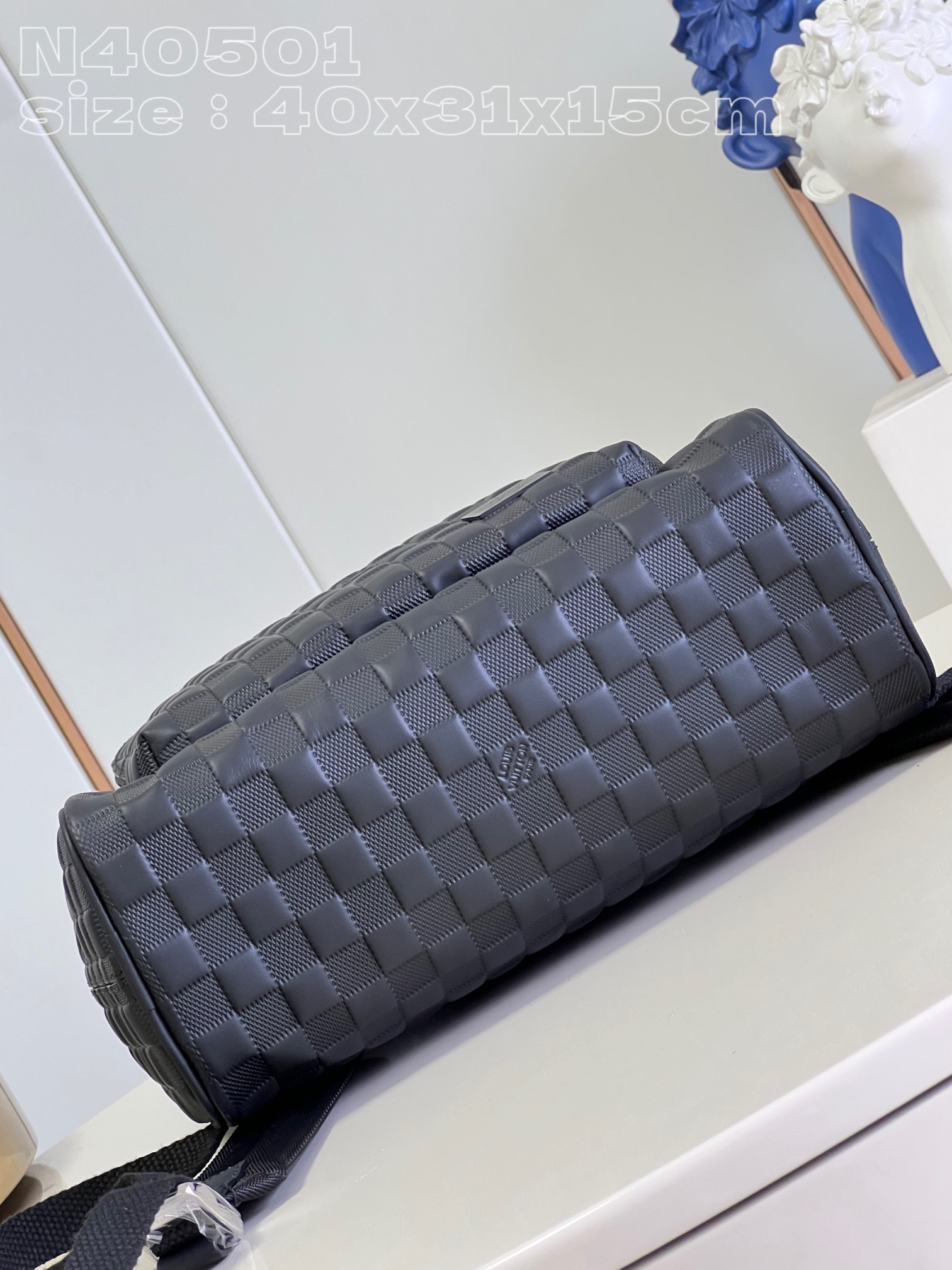 he understated elegance of Damier Infini leather, with its discreet checkerboard pattern, makes this Avenue Backpack great for work or play. Three palladium-color zippers, on the front pocket, main compartment, and back padded compartment, perfectly complement the monotonal colorway. It can be carried by its top handle or worn with its shoulder straps.