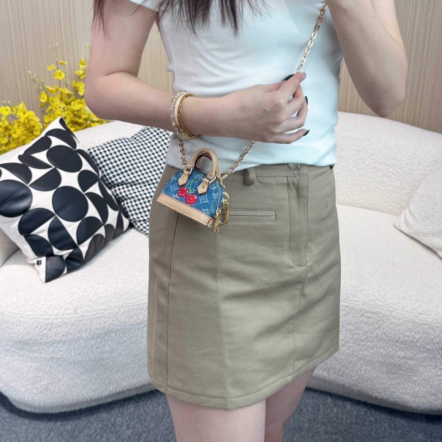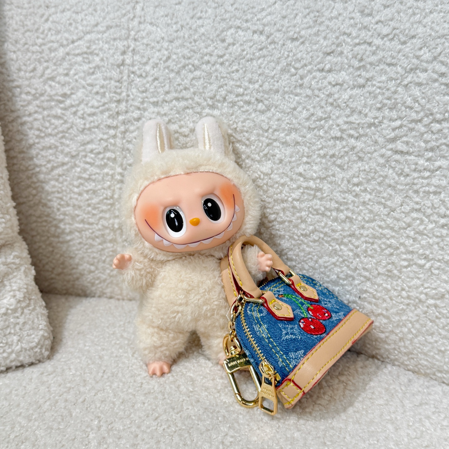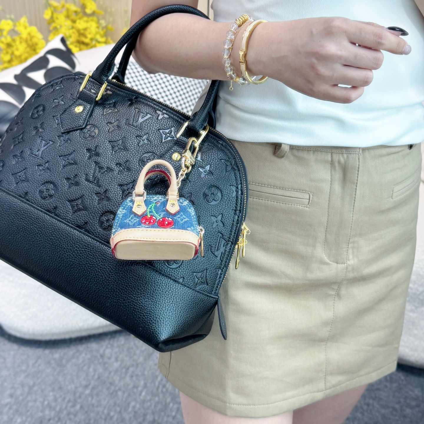 The playfully enchanting LV x TM Micro Speedy Denim Cerise bag charm joins the re-edition of the exceptional Louis Vuitton x Murakami collection. Crafted in denim and cowhide, it features an embroidered Monogram pattern adorned with two colorful smiling cherries, an iconic element in the celebrated Japanese artist’s creative world. A tribute to Louis Vuitton craftsmanship, this finely detailed charm adds a fun, eye-catching flourish to any handbag.