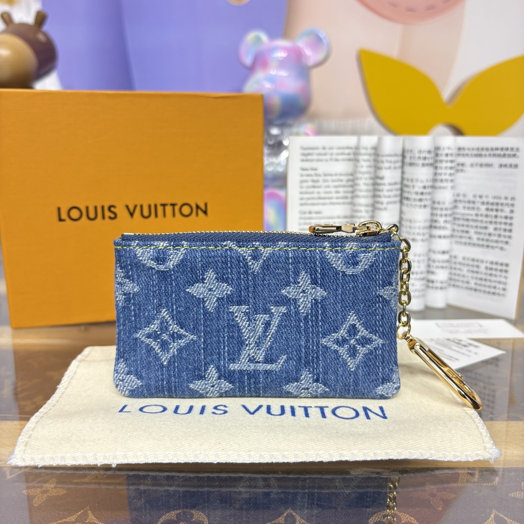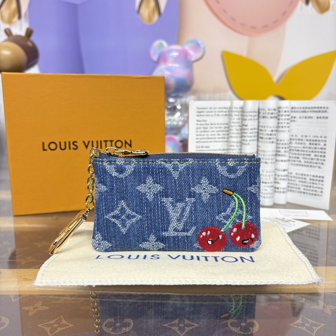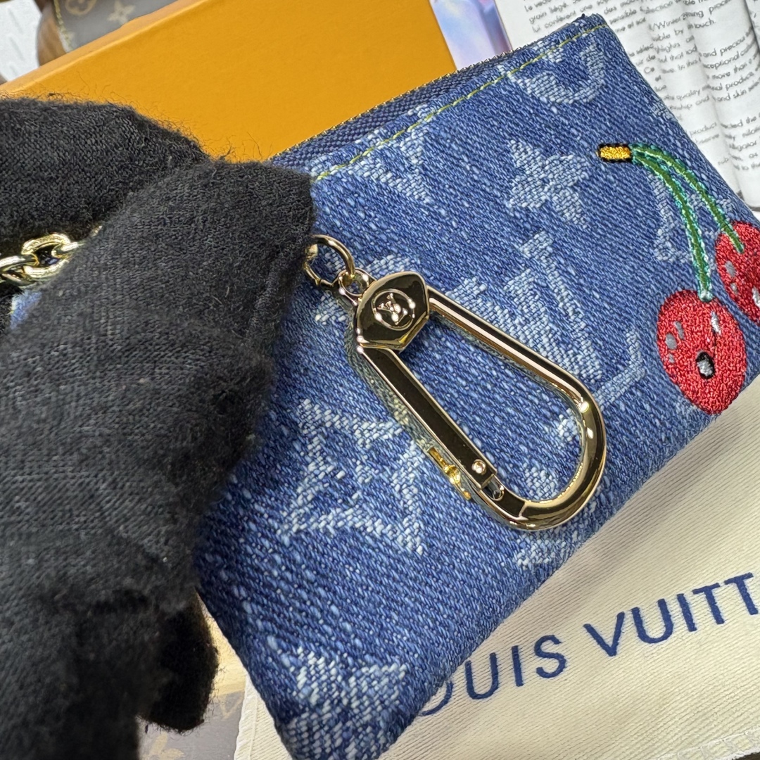 This practical Key Pouch is elevated with joyful details from the re-edition of the Louis Vuitton x Murakami collection. It is crafted from the House’s signature Monogram denim detailed with an embroidered cherry motif in the Japanese artist’s playful style. Designed to stow keys and other small essentials, a gold-toned hook on a chain allows this style to be attached to a bag or a belt loop.