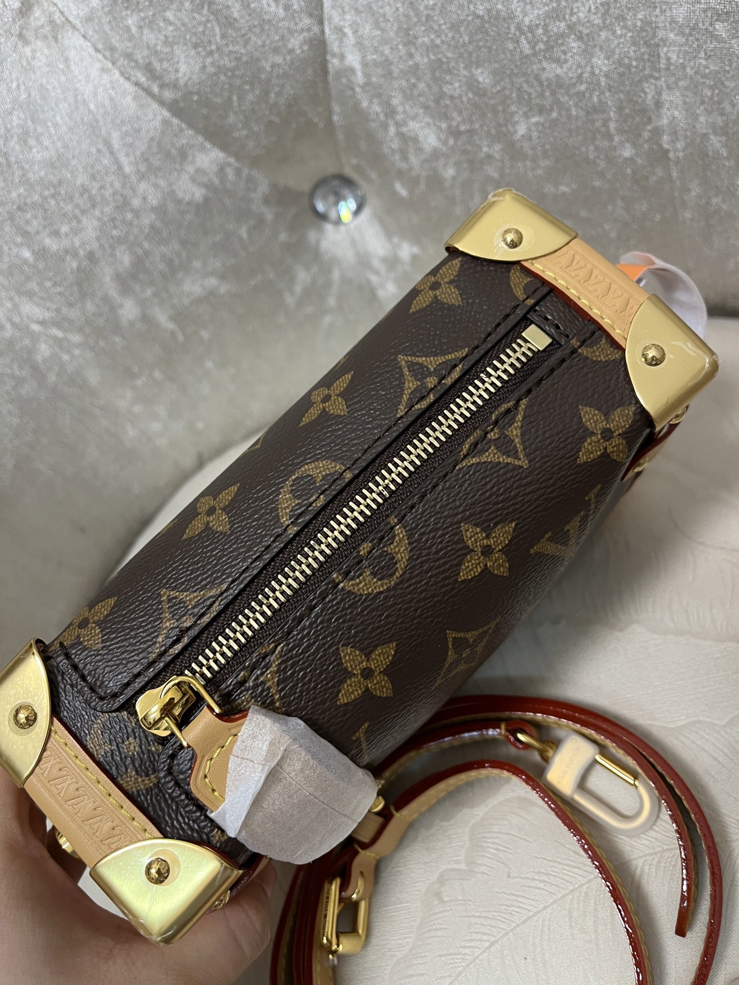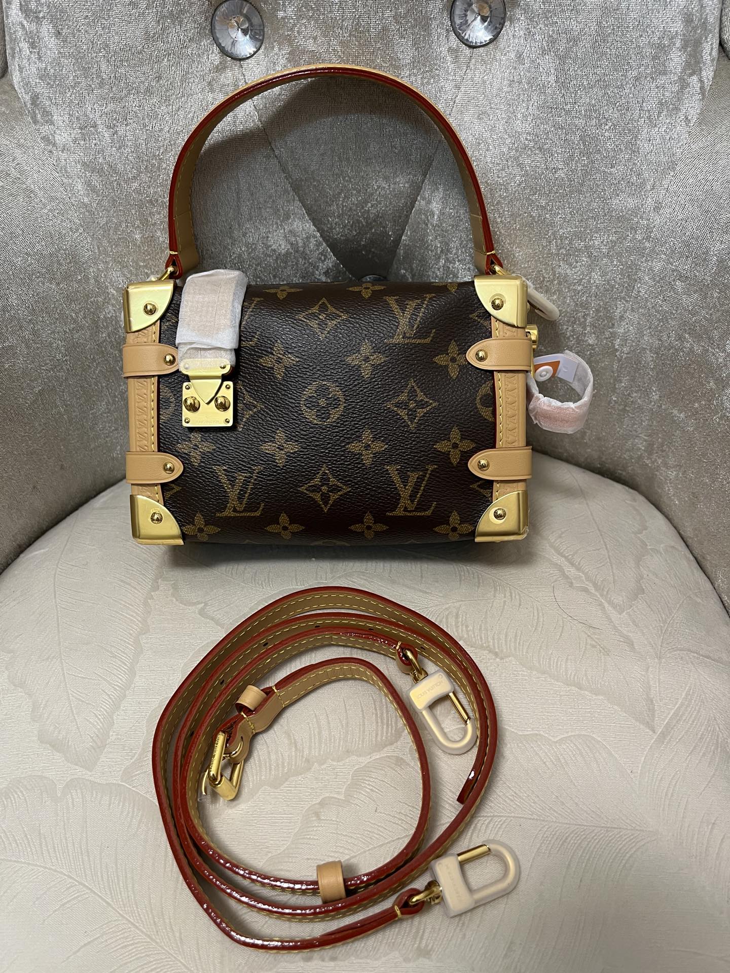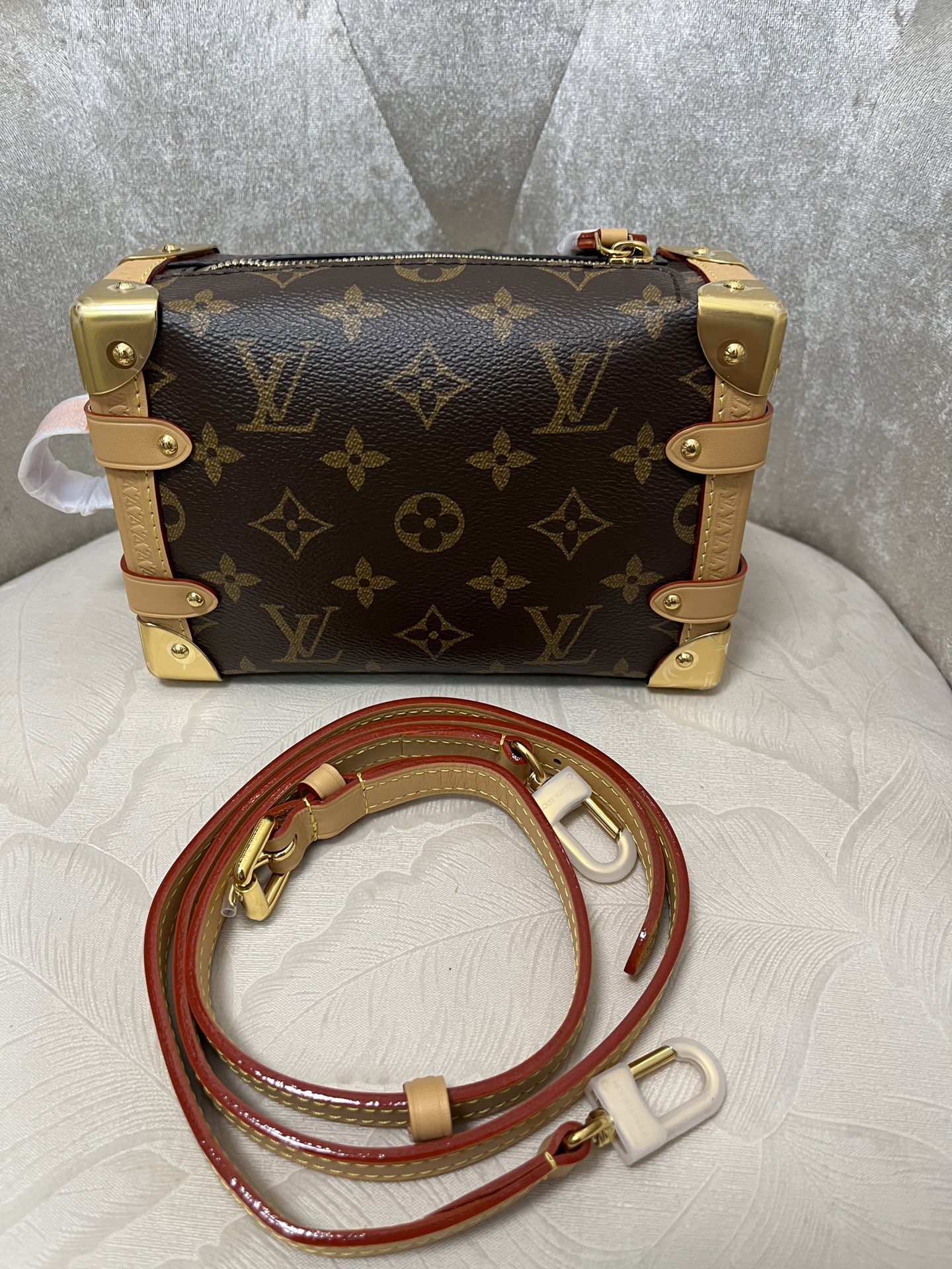 Returning to the House’s trunkmaking beginnings, Nicolas Ghesquière creates the Side Trunk MM handbag in Monogram canvas with leather trim. What strikes the eye is the singularity of the leather zip tab fitted with the iconic S-lock and the reinforced metallic corners. The wide top handle is removable as is the thin leather shoulder strap.